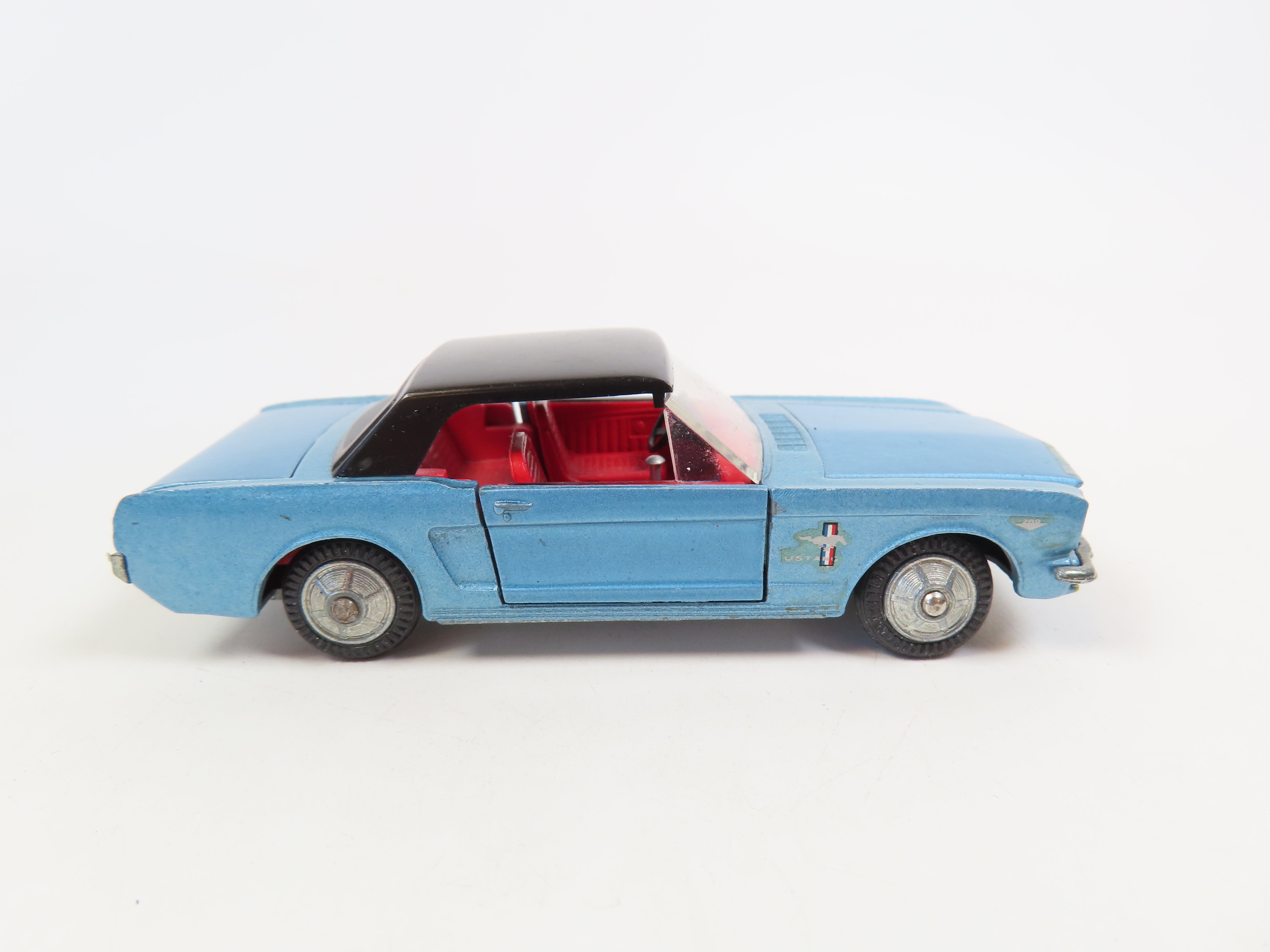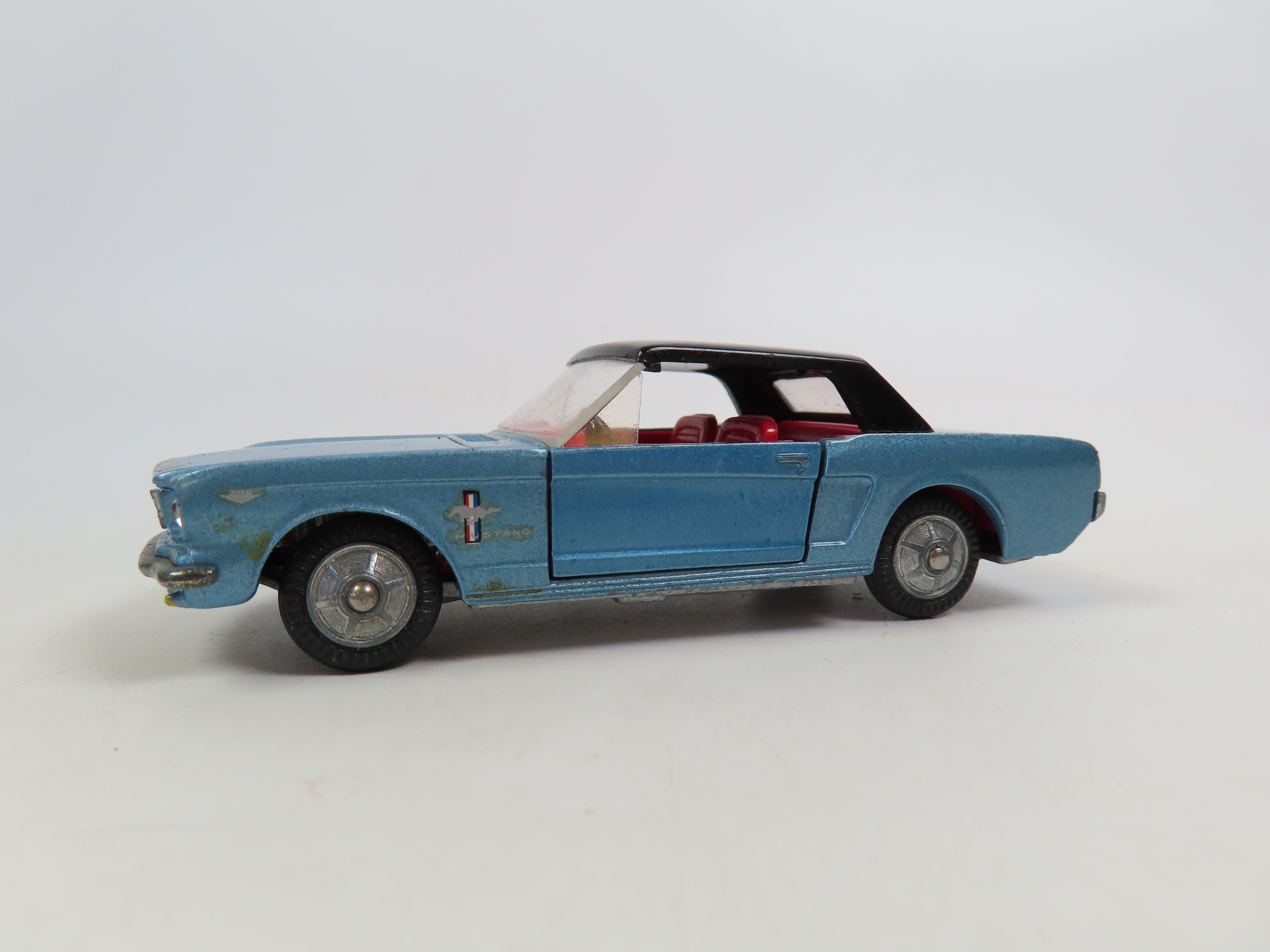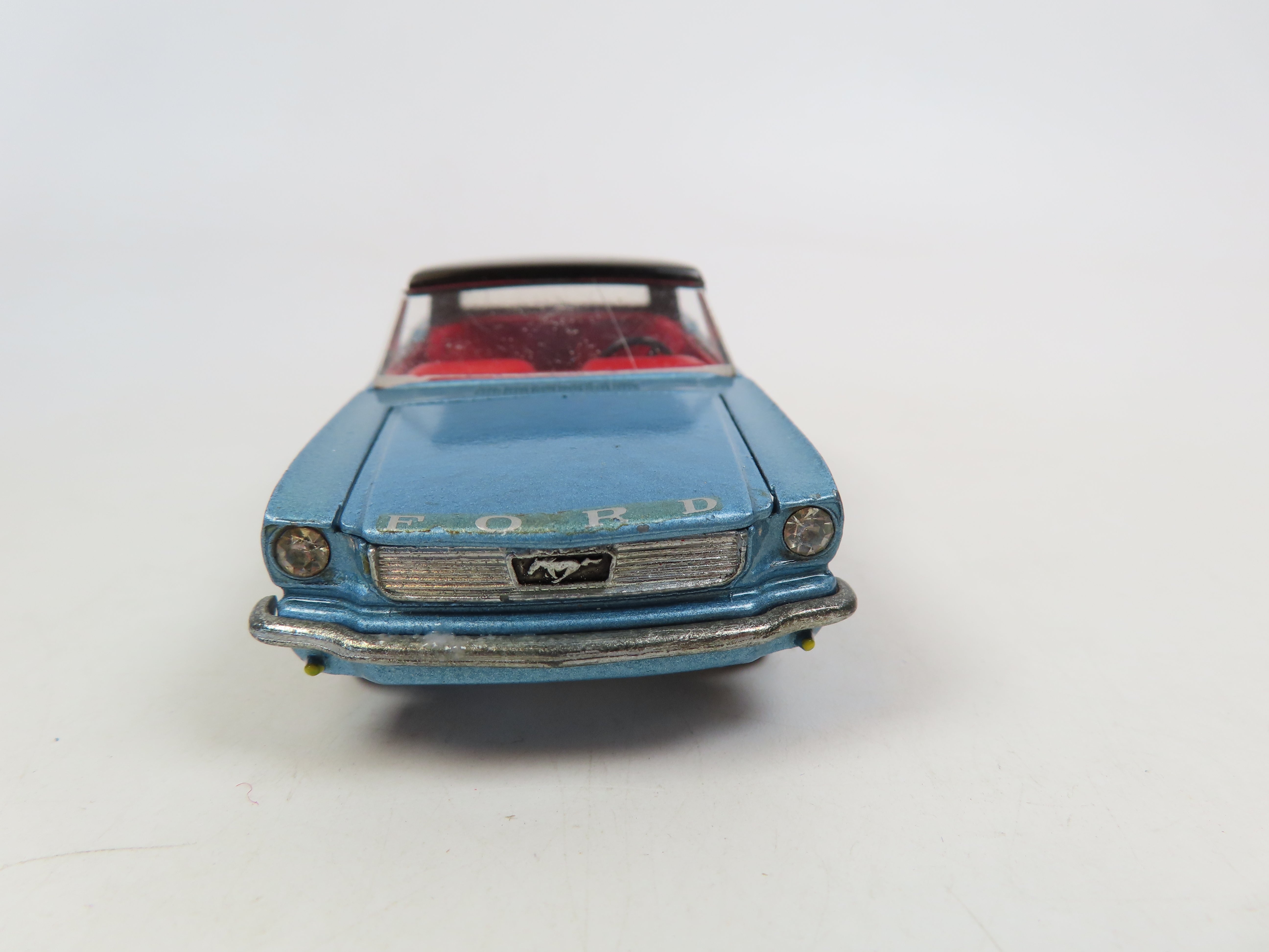 Tekno 833 Ford Mustang hood up version, in metallic blue, with a red interior and various Ford and Mustang decals to it.