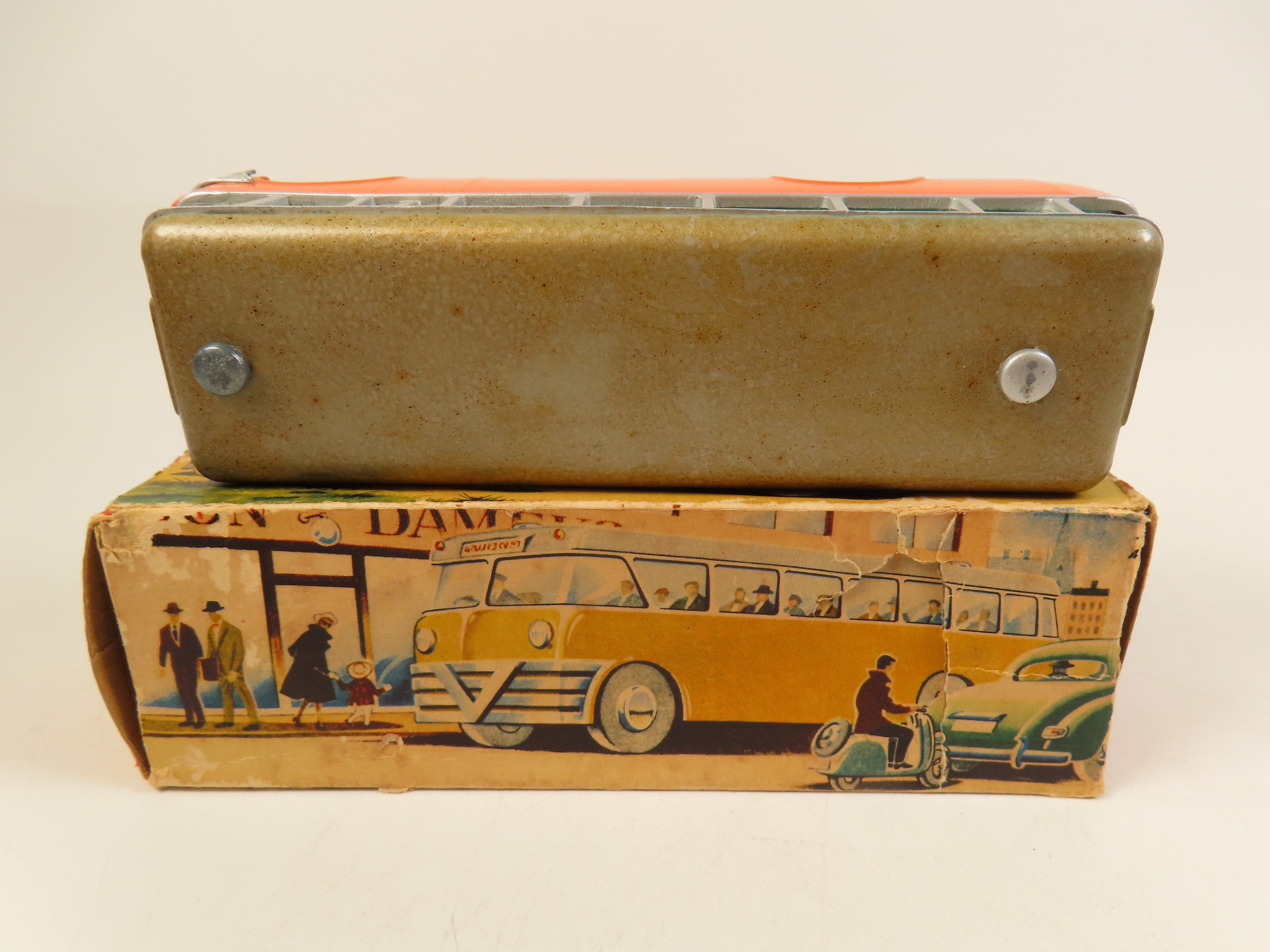 The box is original, and quite well worn, with taped up ends and inner end flaps taped on and a few small tears to the card. See the pictures.