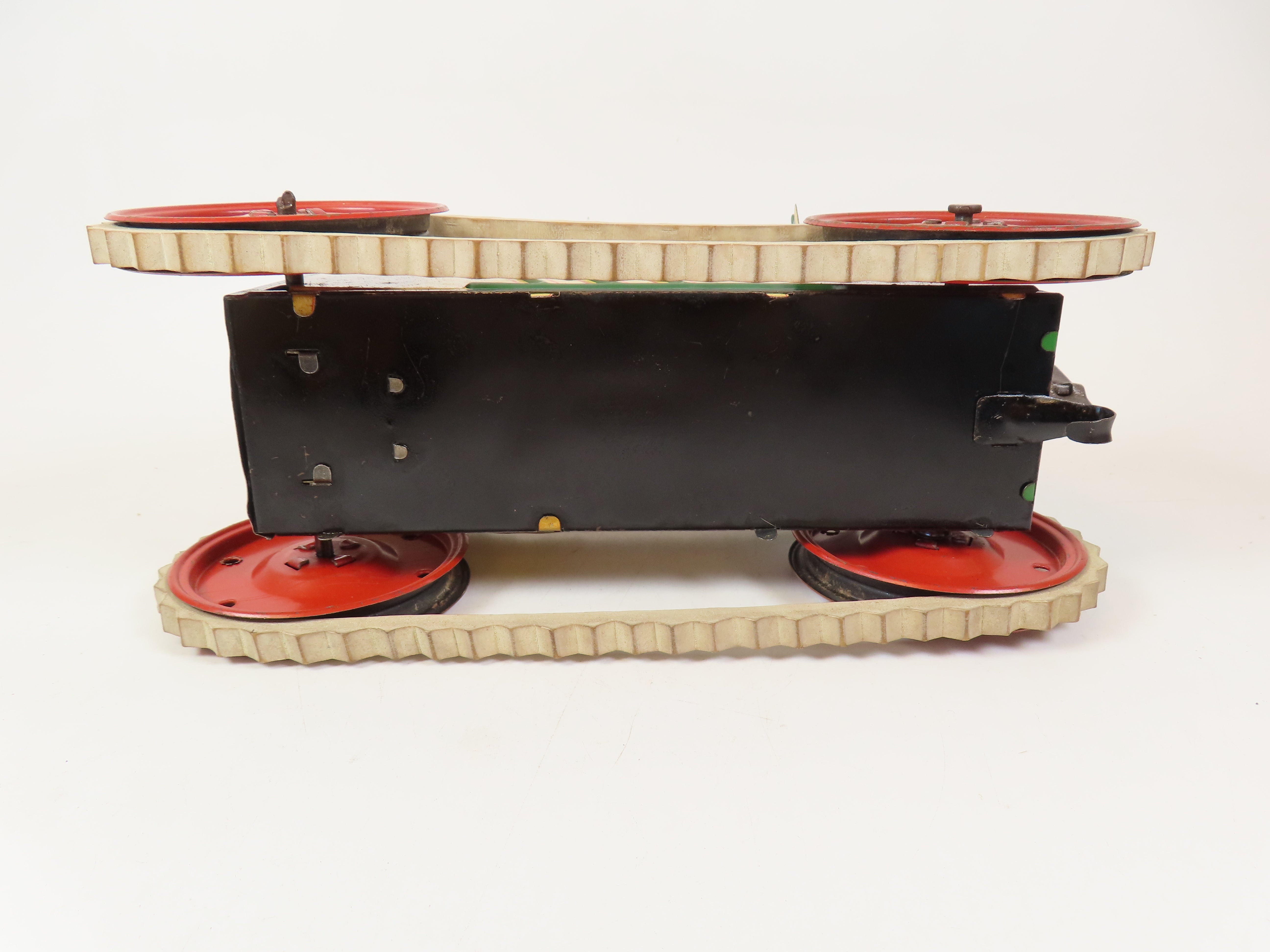 Distler (EssDee Series) Clockwork Caterpillar Tractor in cream, with cream and red detailing and rubber treads. Unfortunately the figure is missing. The tractor measures 22cm in length. A superb and impressive tinplate toy from the early 1950's. See all pic's.