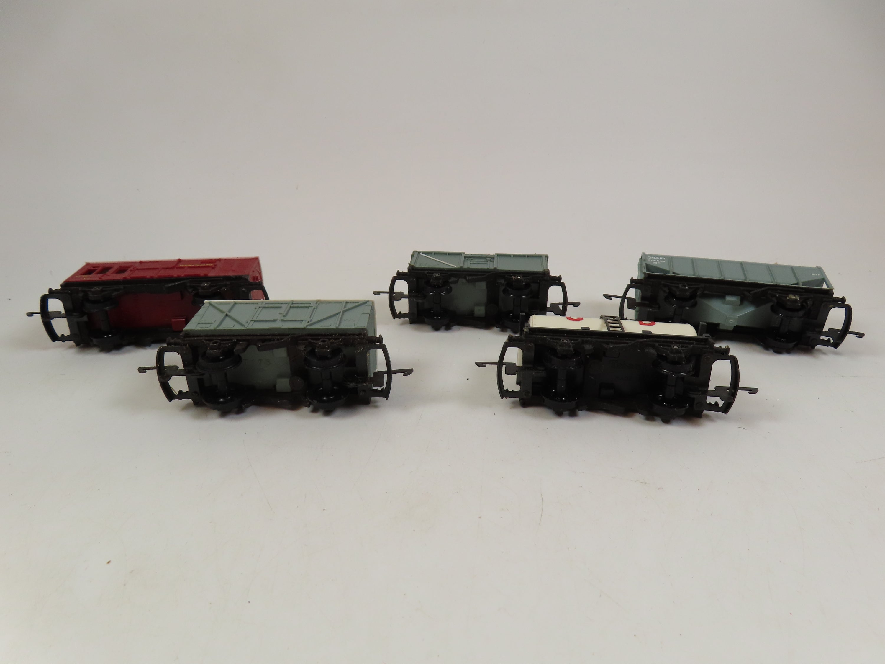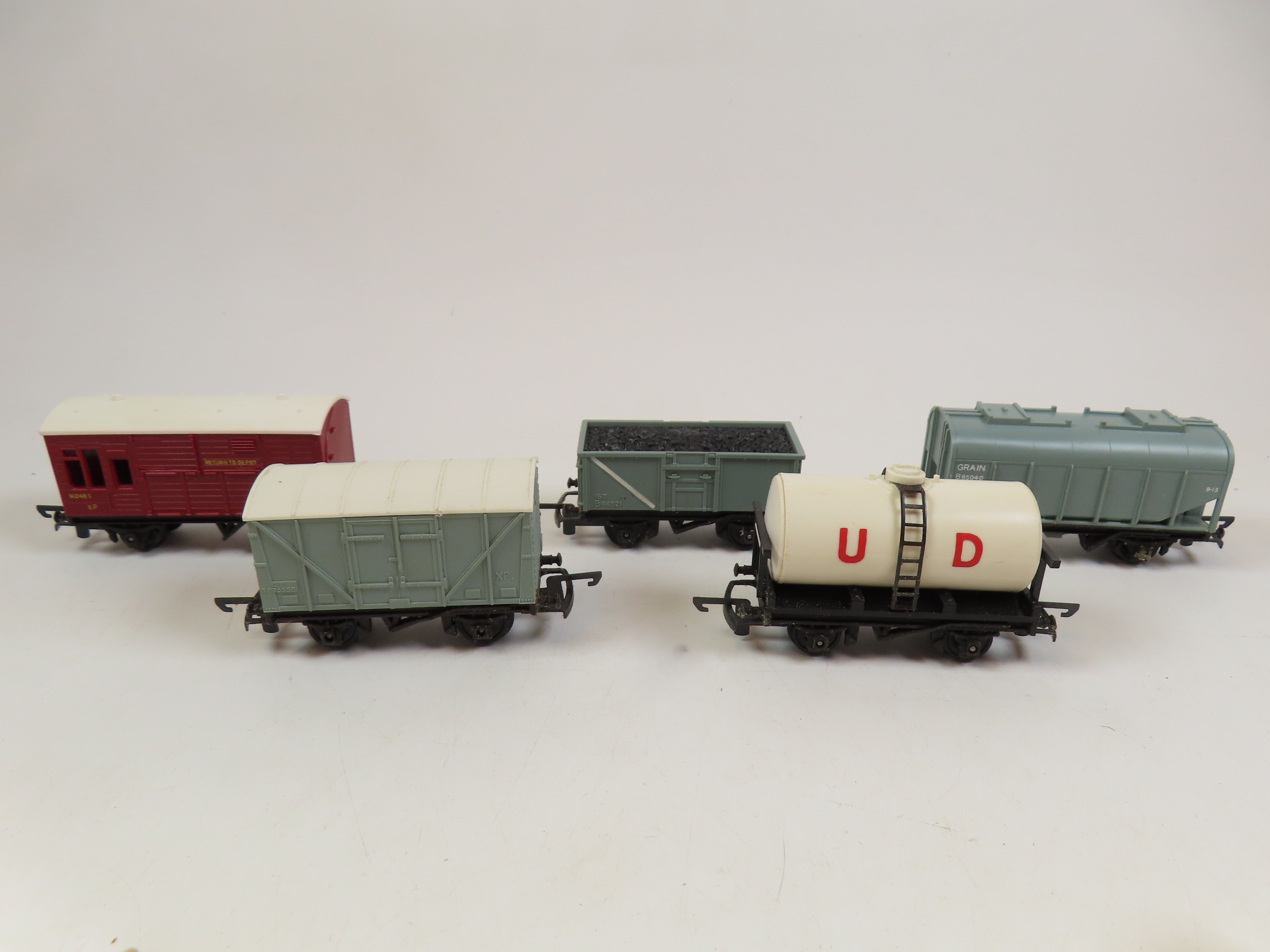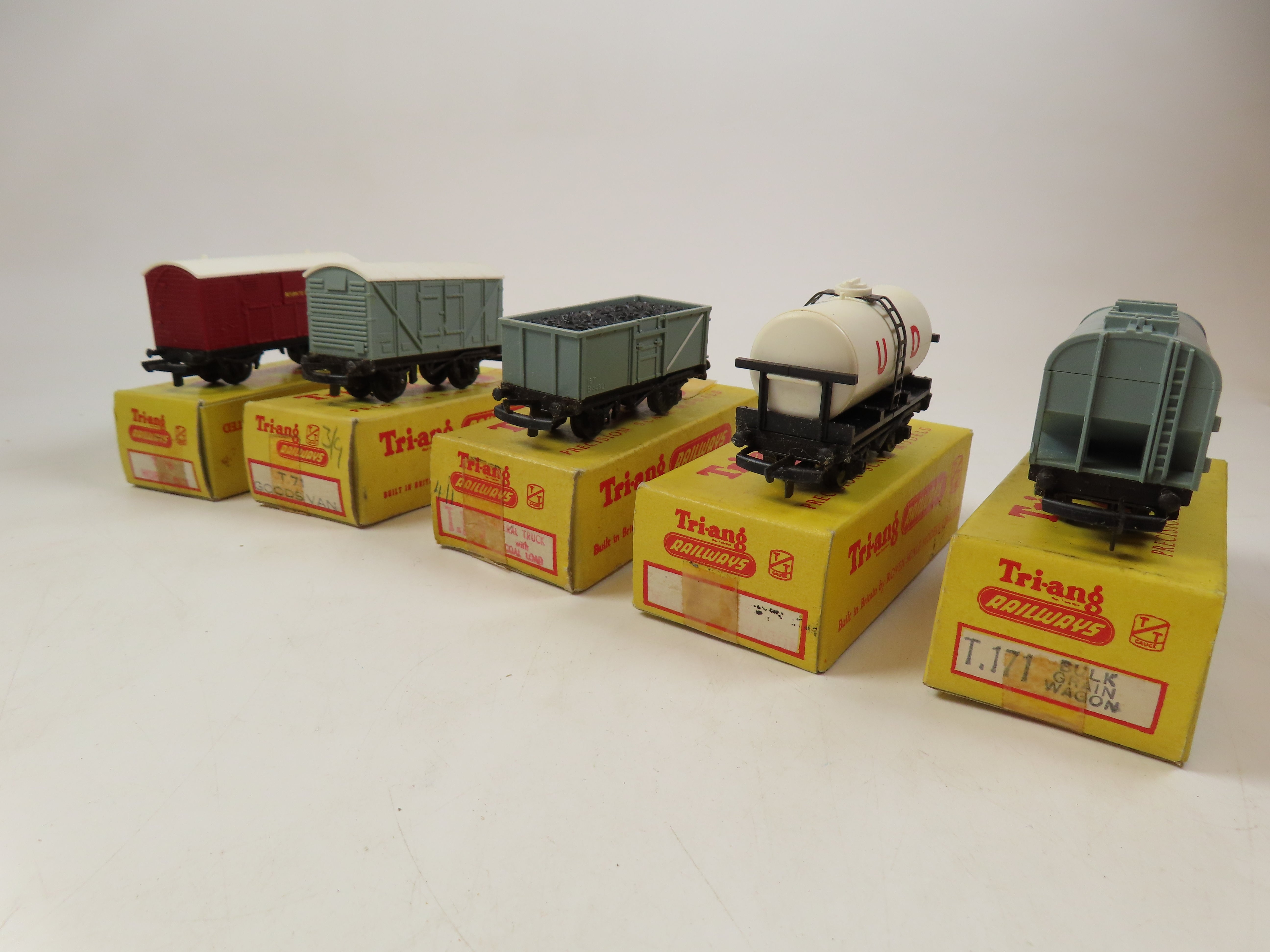 Tri-ang Railways TT Rake of 5 wagons as shown in the pictures, these include T.173 Mineral Truck with Coal Load, T.171 Bulk Grain Wagon, T.78 Horse Box, T.71 Goods Van, T.73 UD Milk Tank Wagon