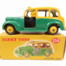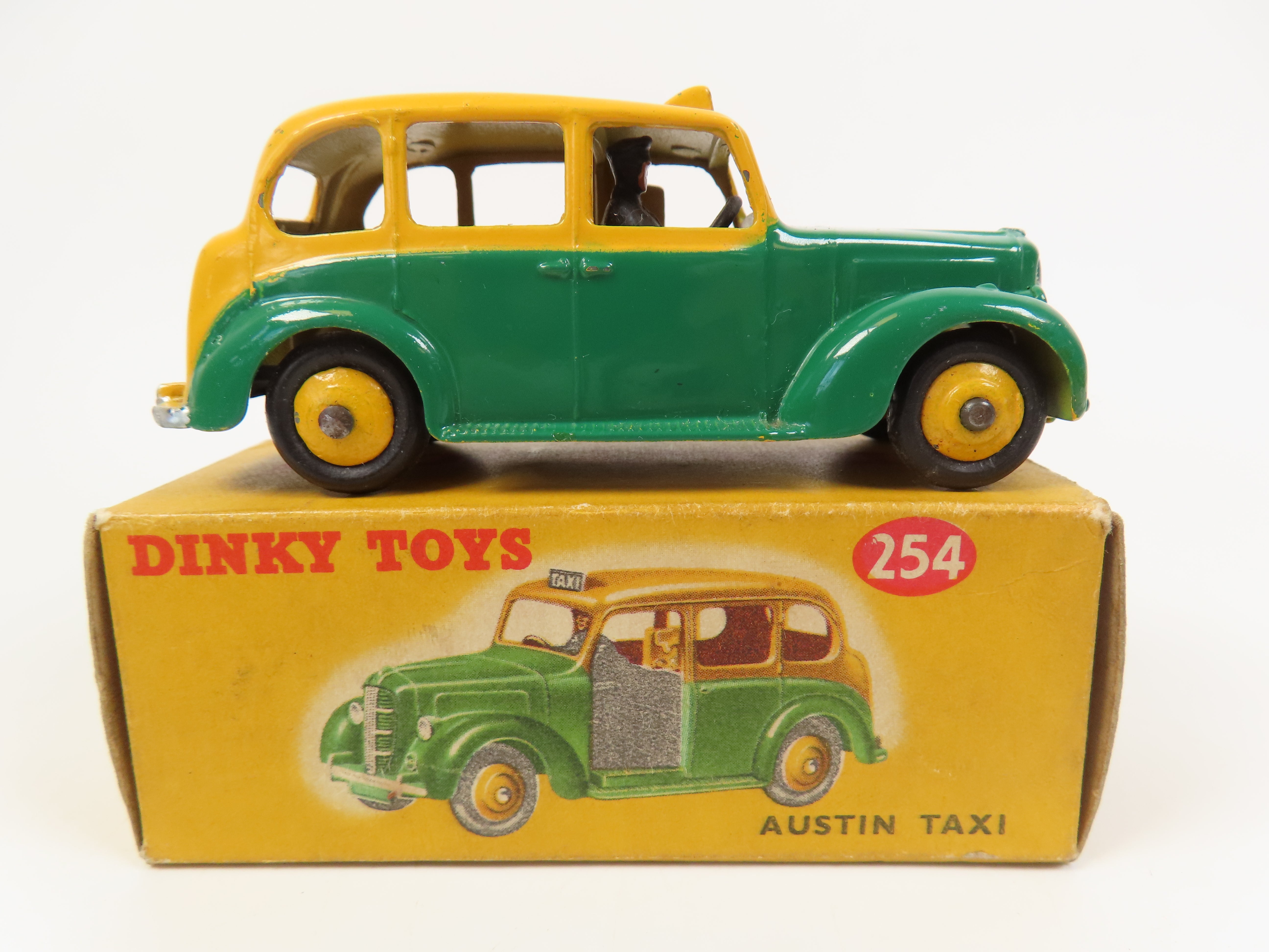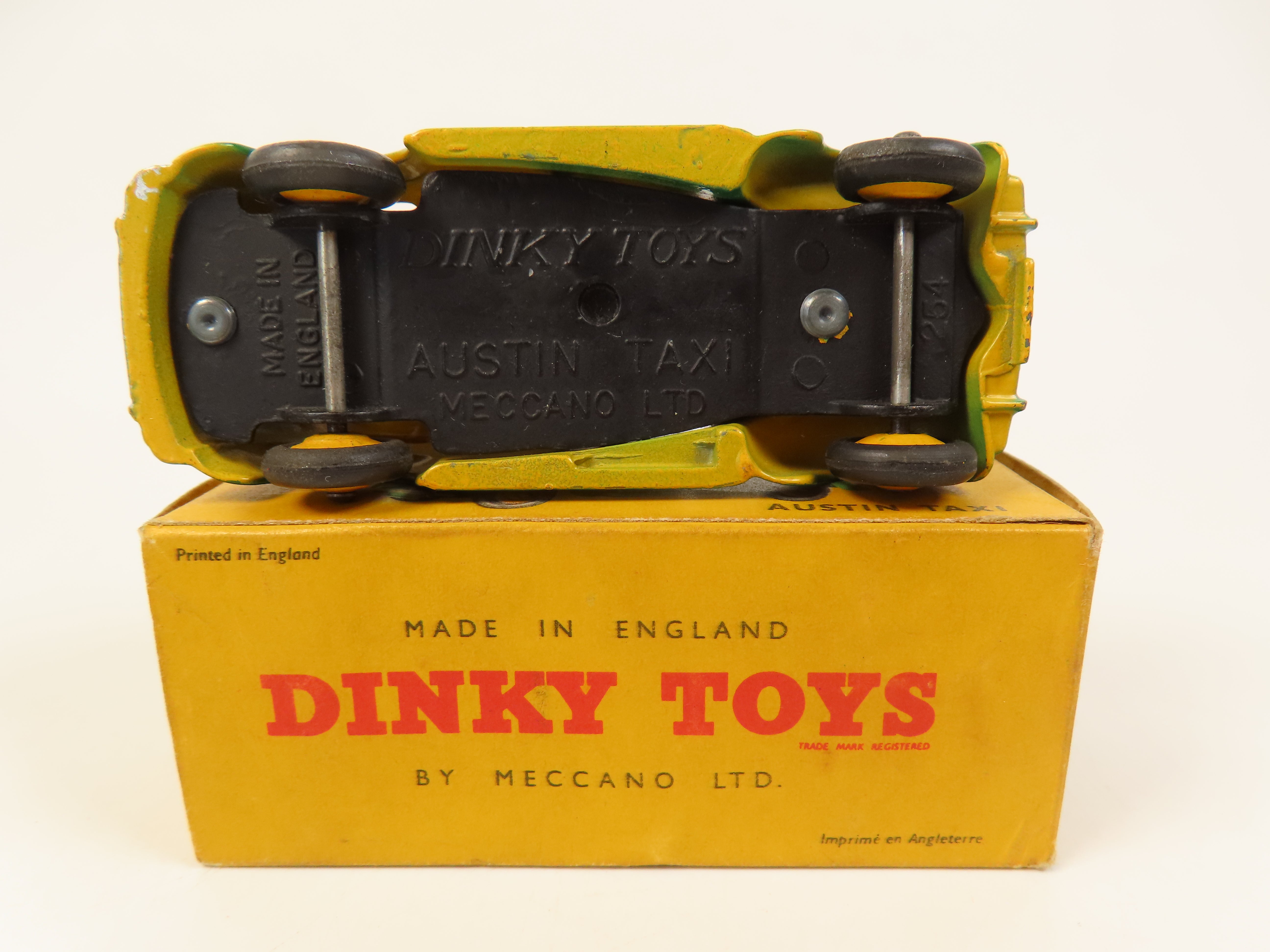 Dinky 254 Austin Taxi in green and yellow, with yellow painted hubs and 'Taxi' label to the header sign and driver figure.