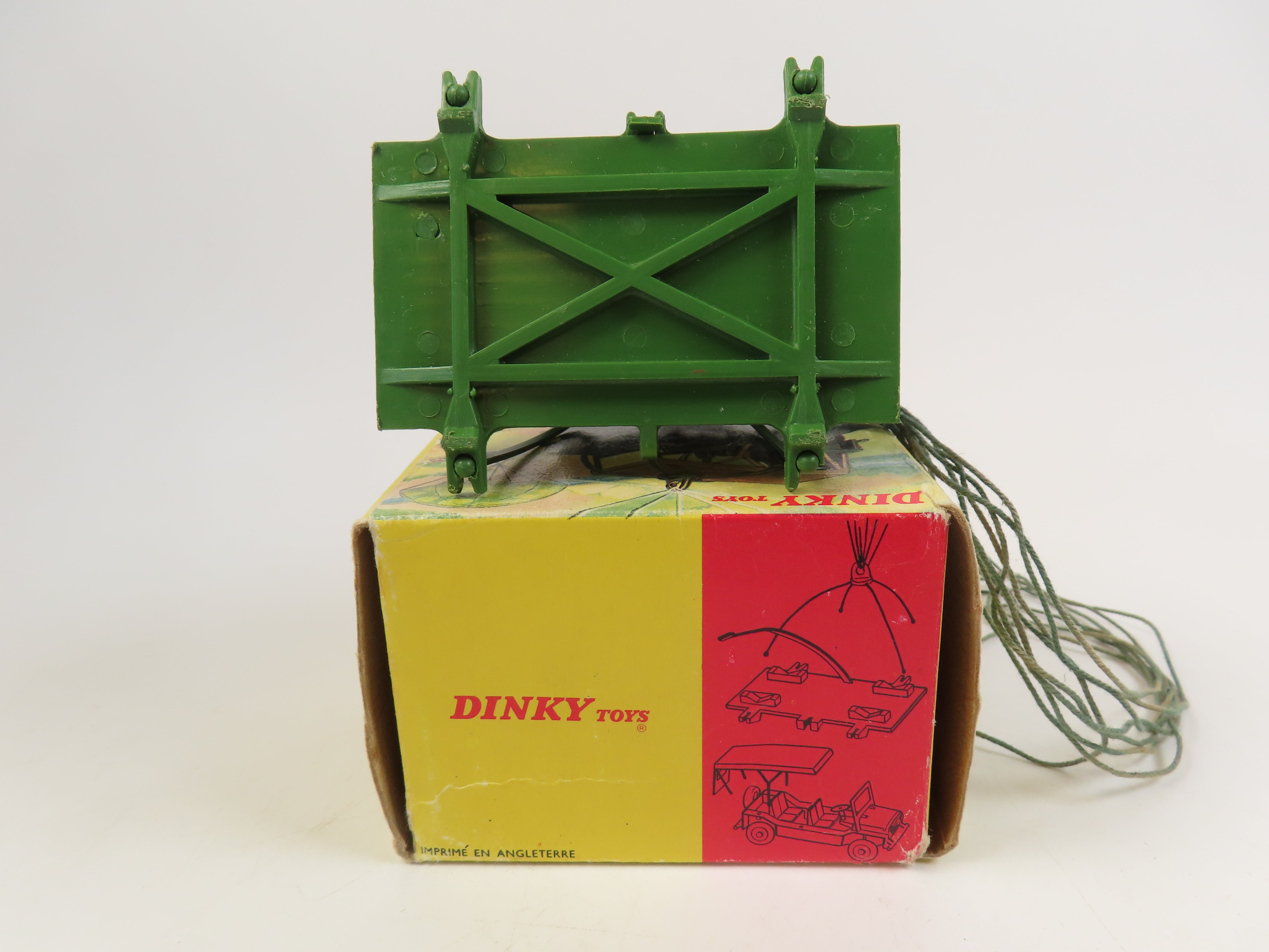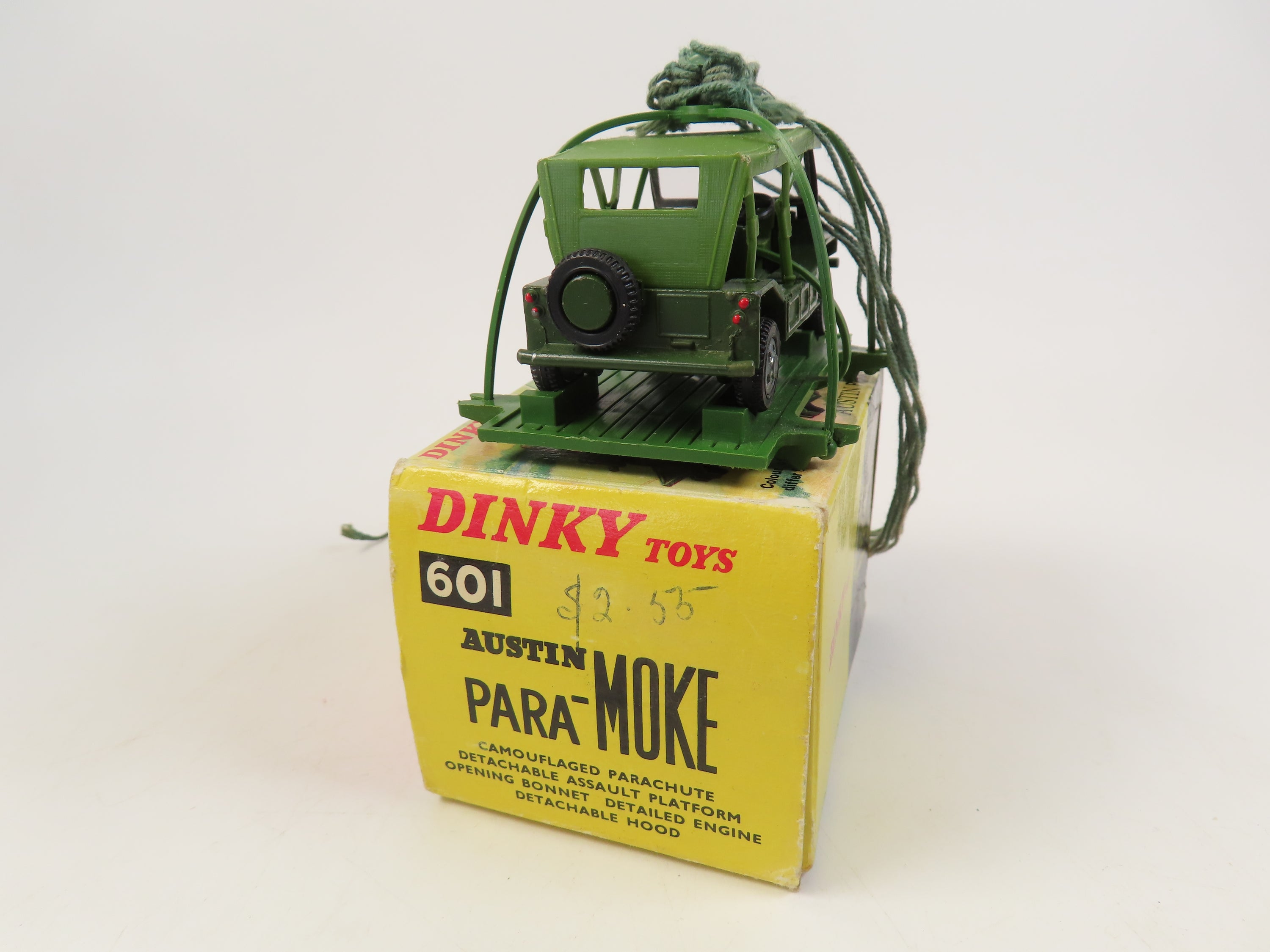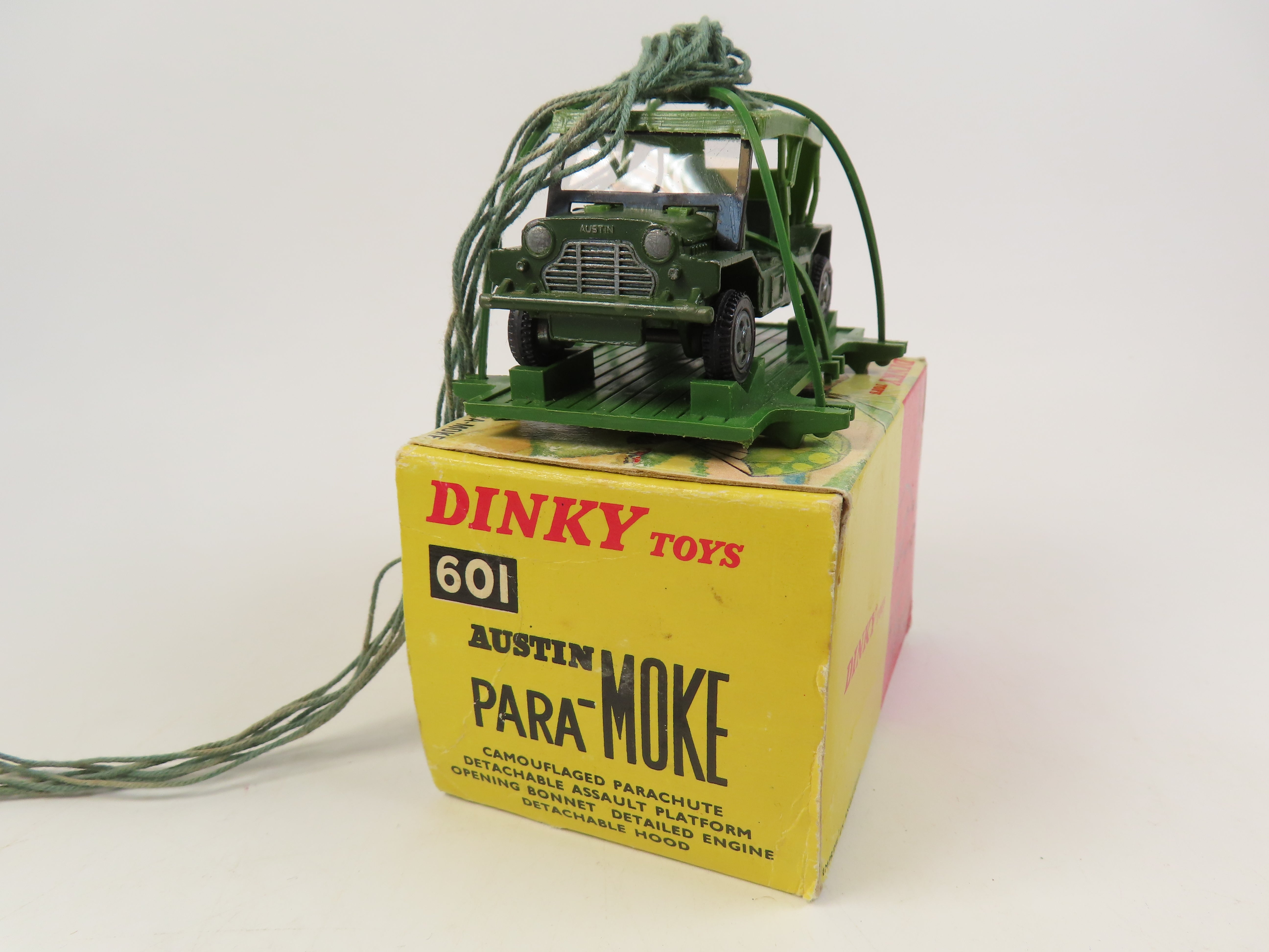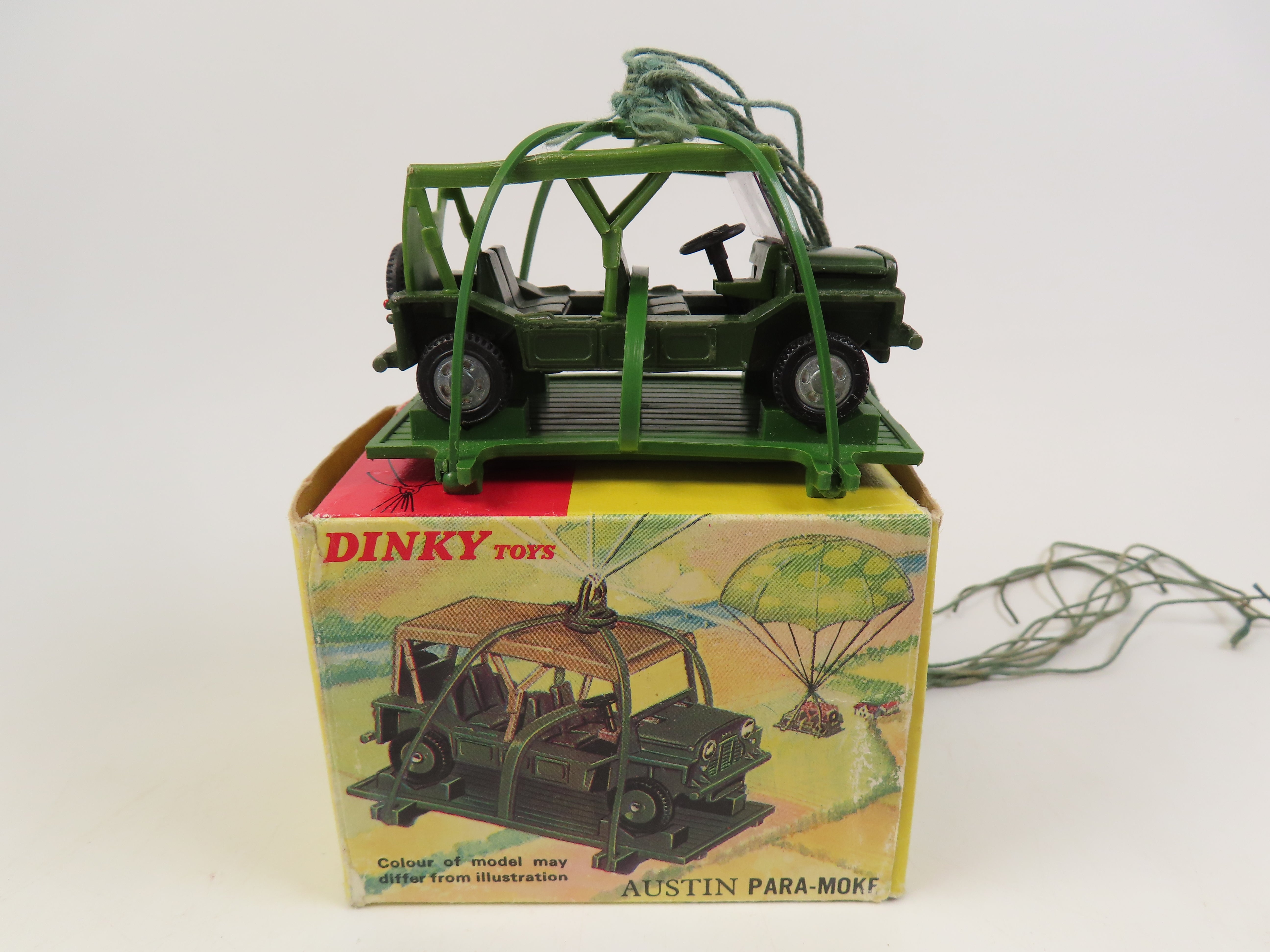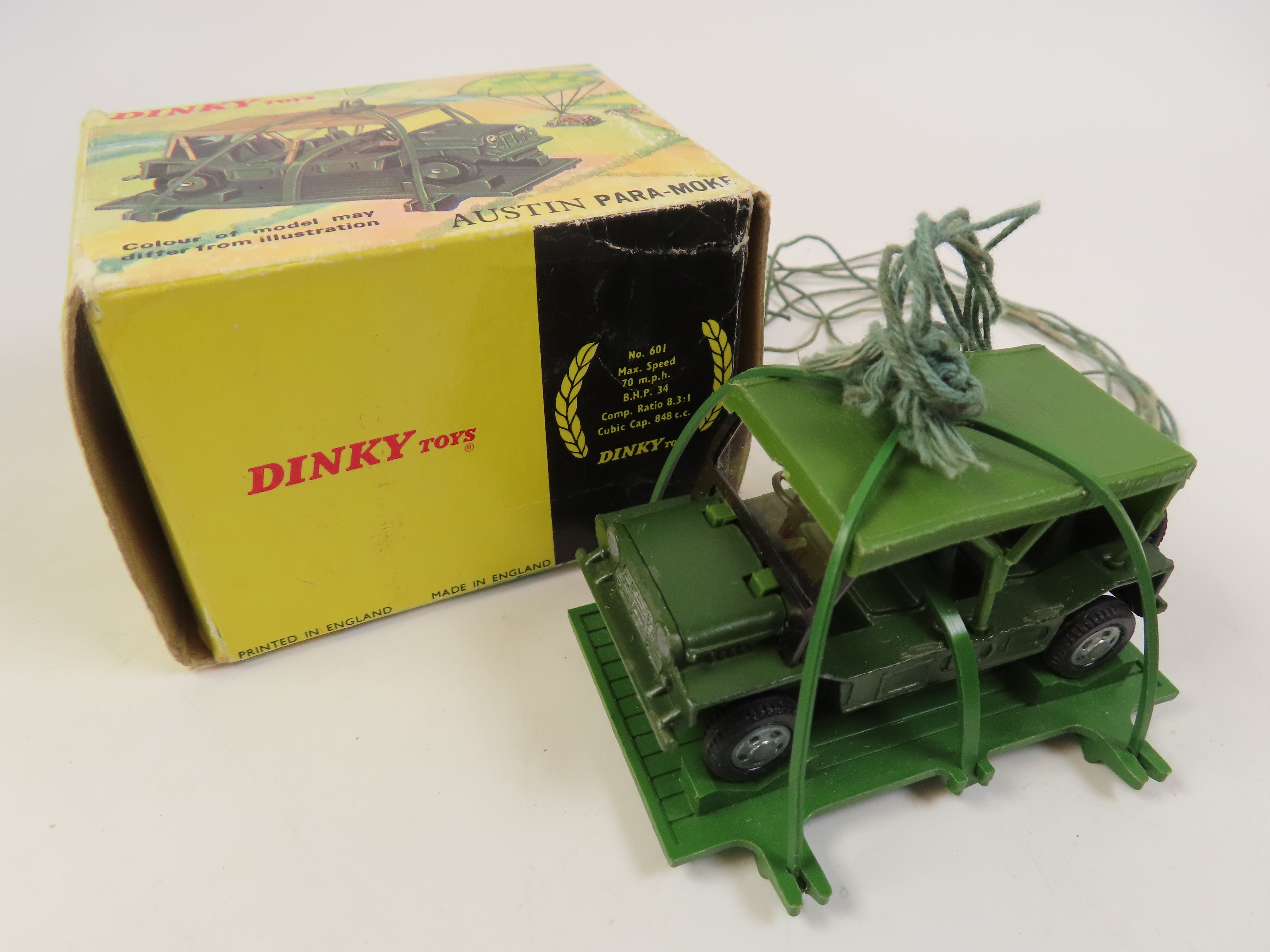 Dinky 601 Austin Para-Moke in olive green, with plastic pallet and parachute.