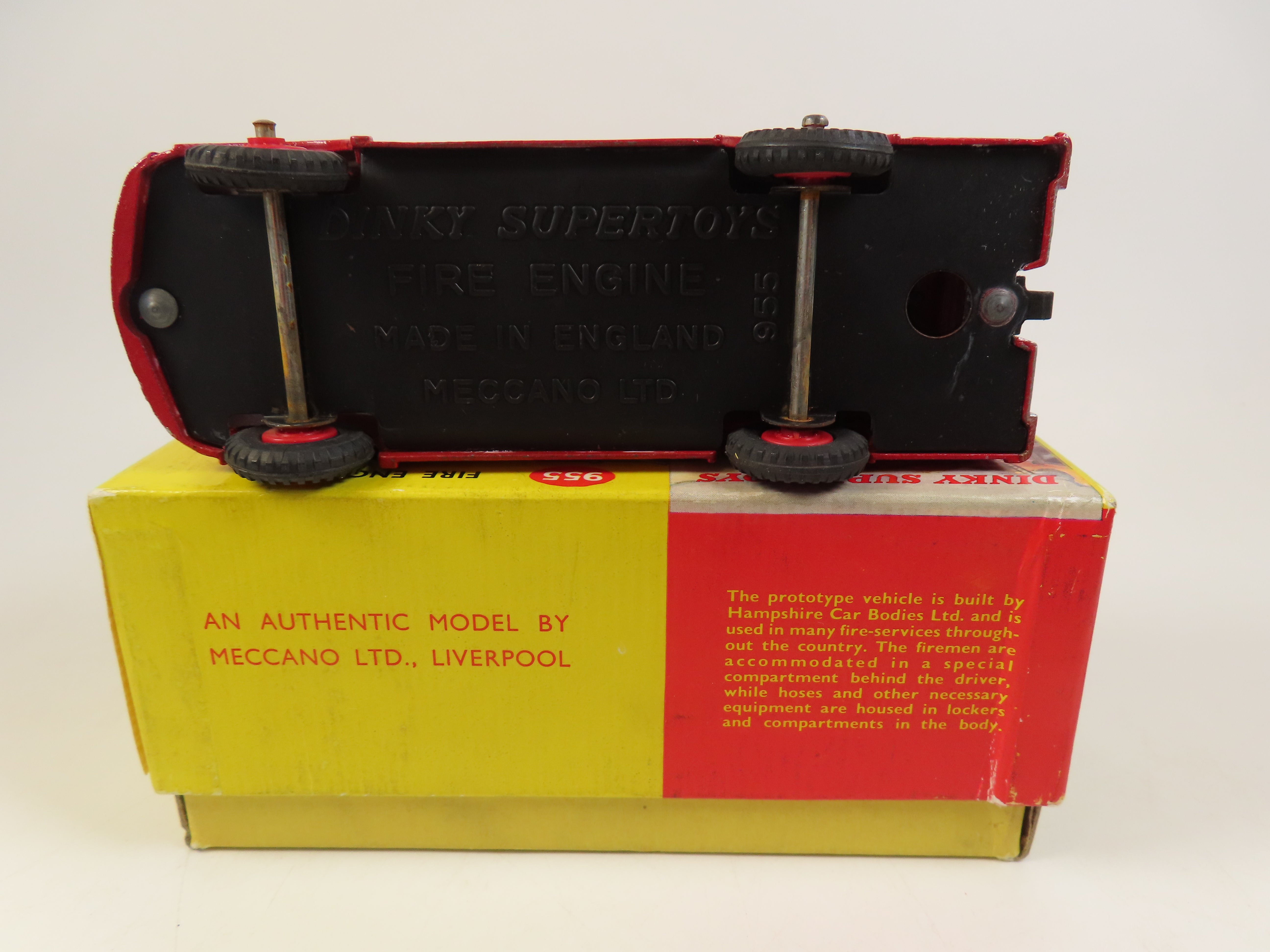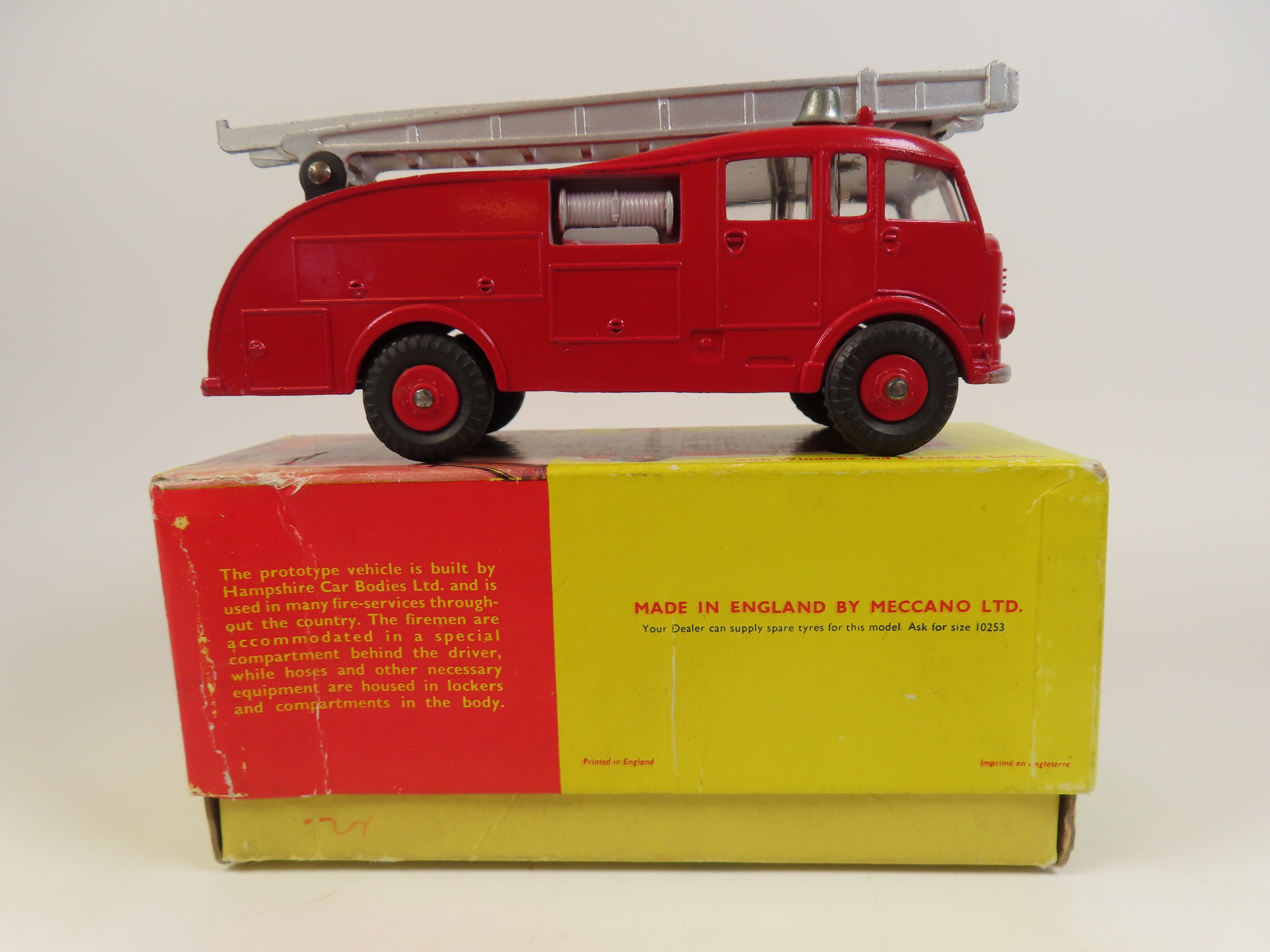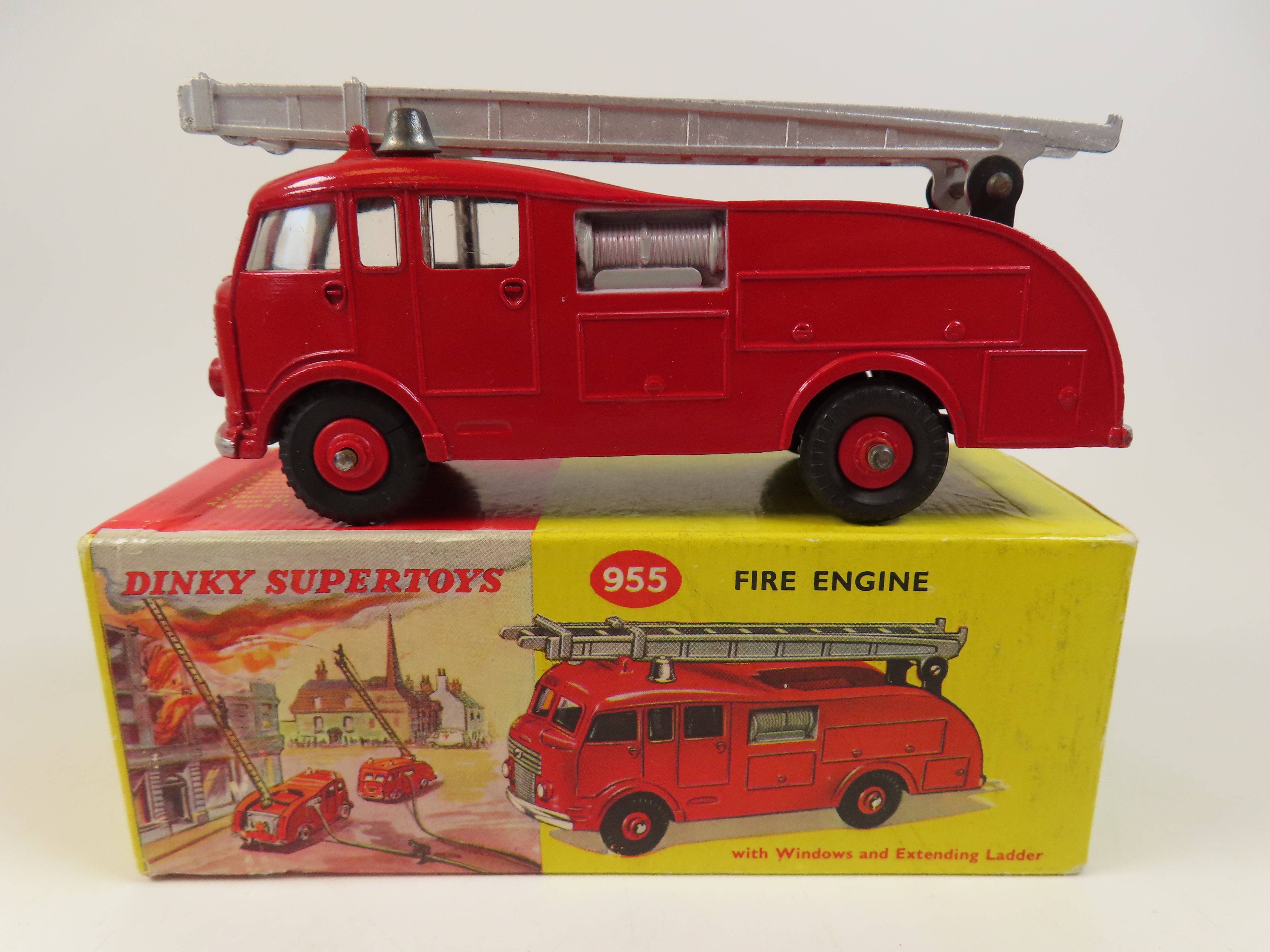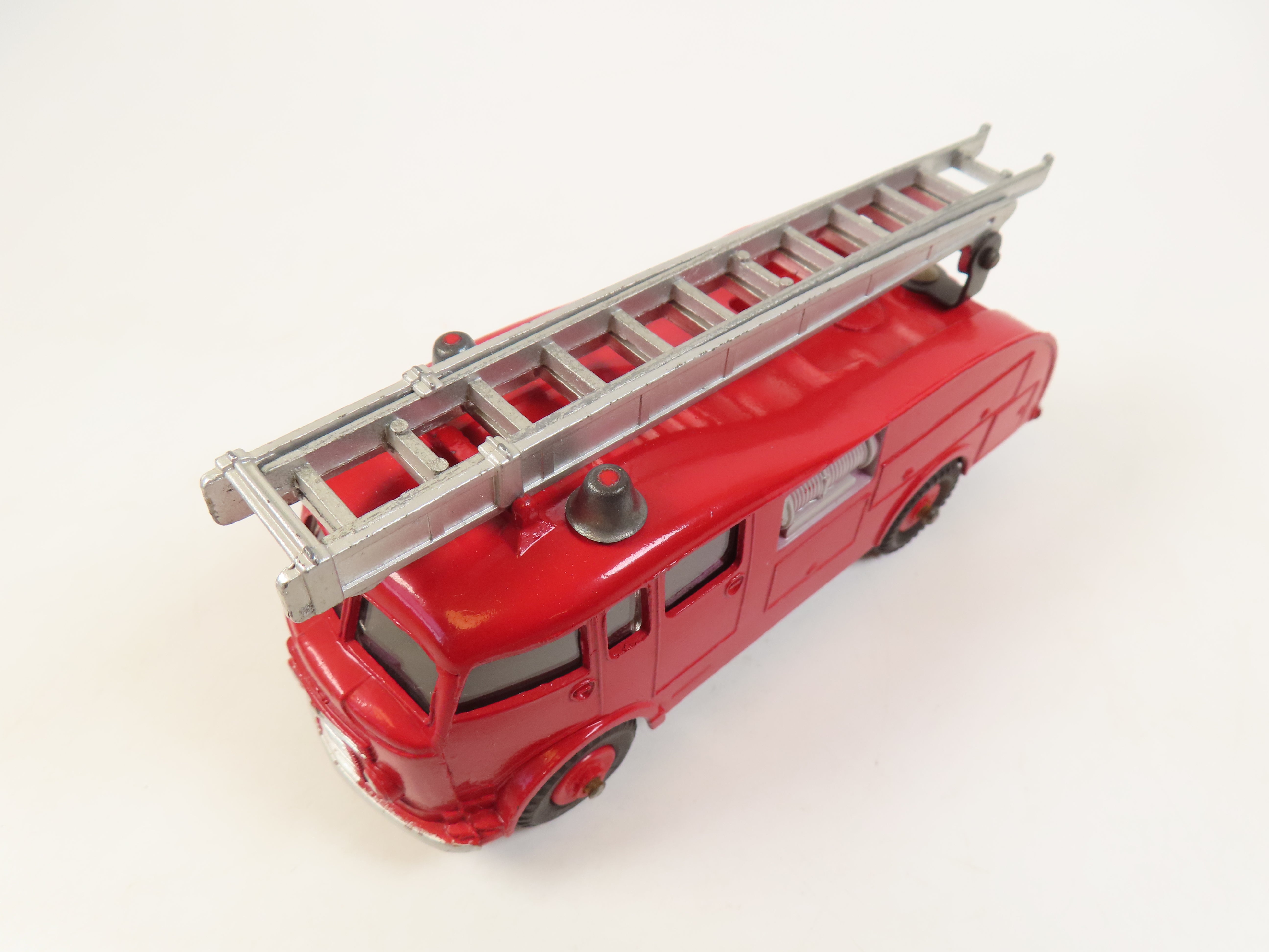 Dinky 955 Fire Engine in bright red, with scarce red plastic hubs, 2 metal bells and ladder to the roof.