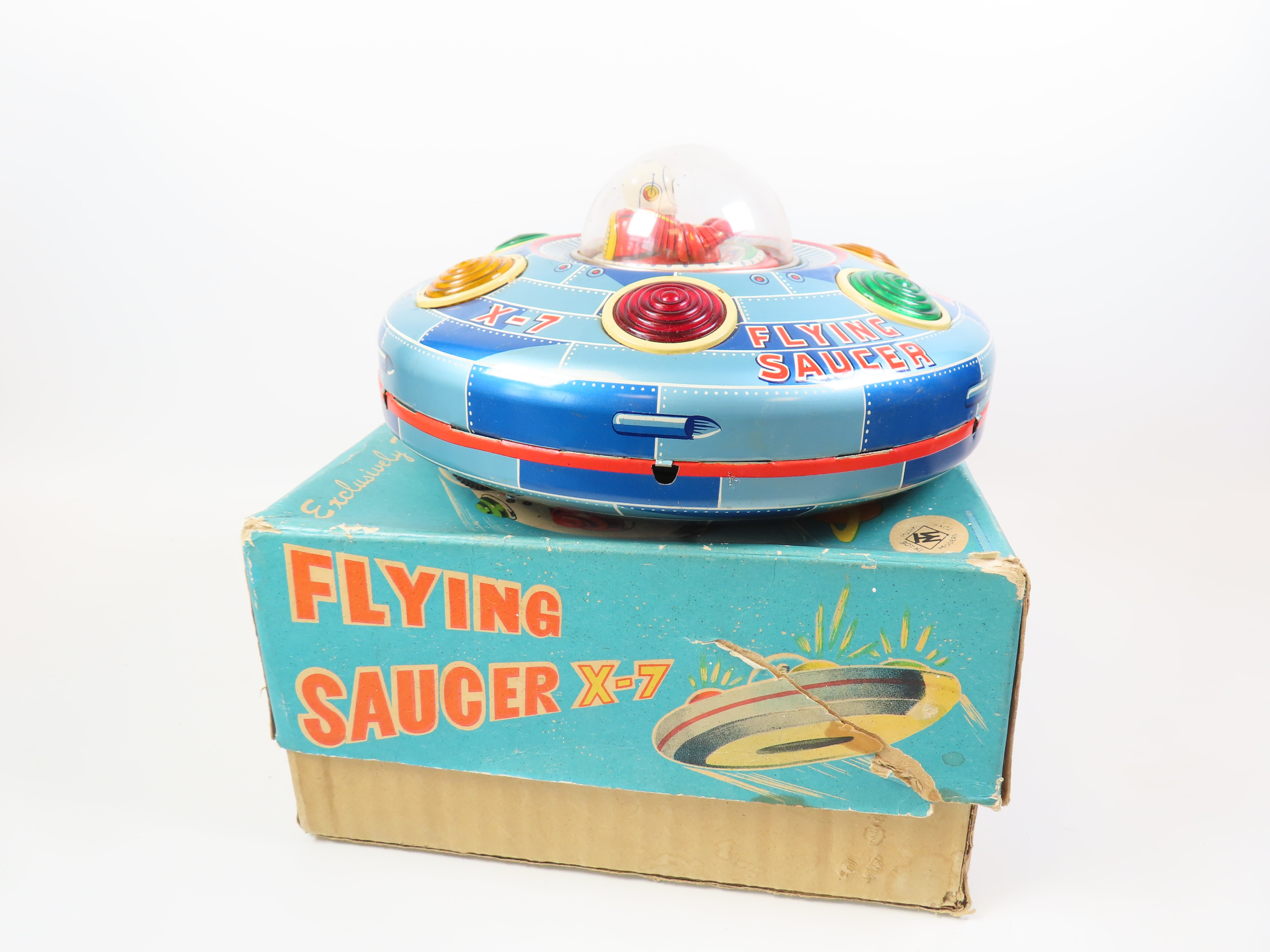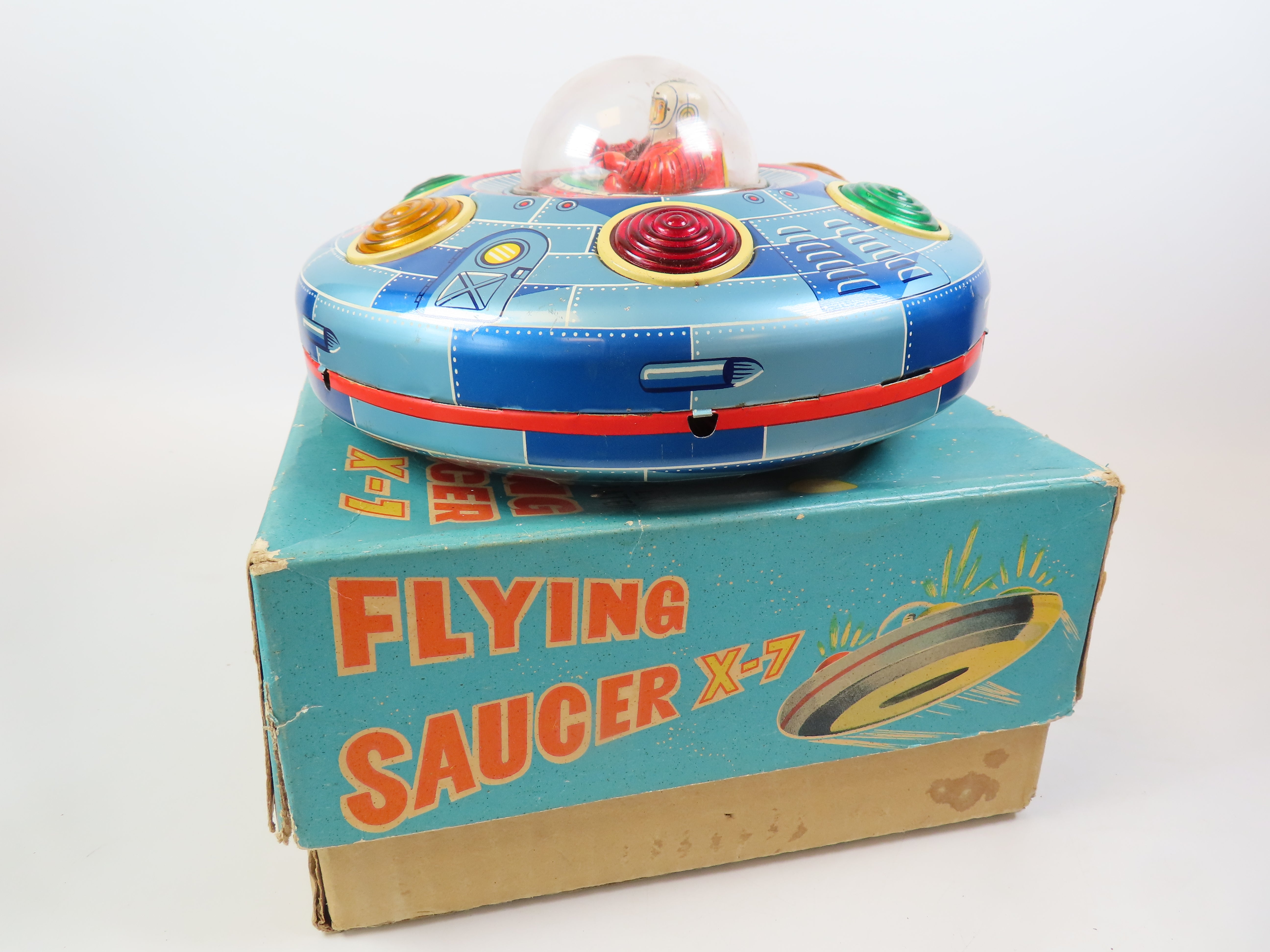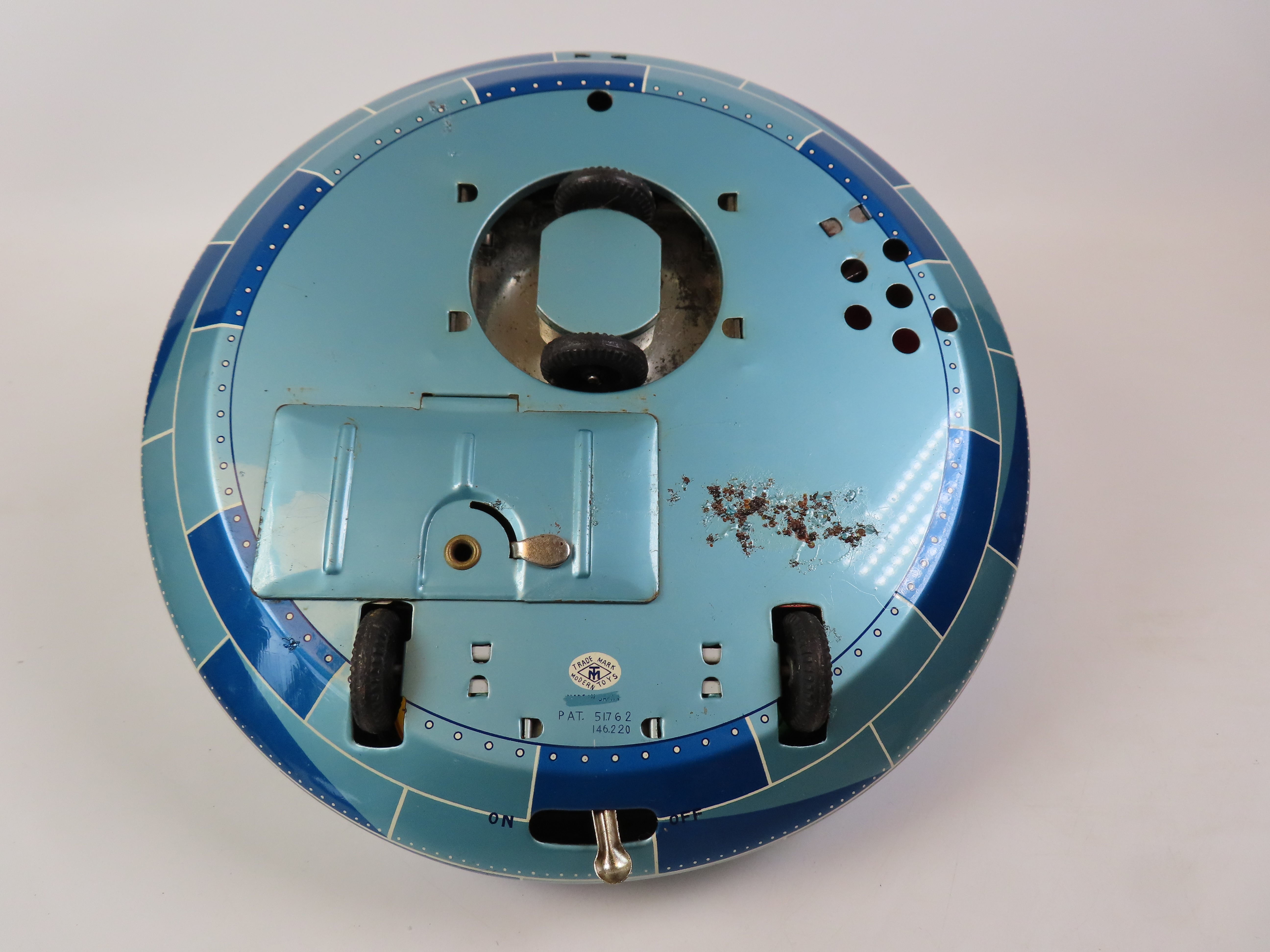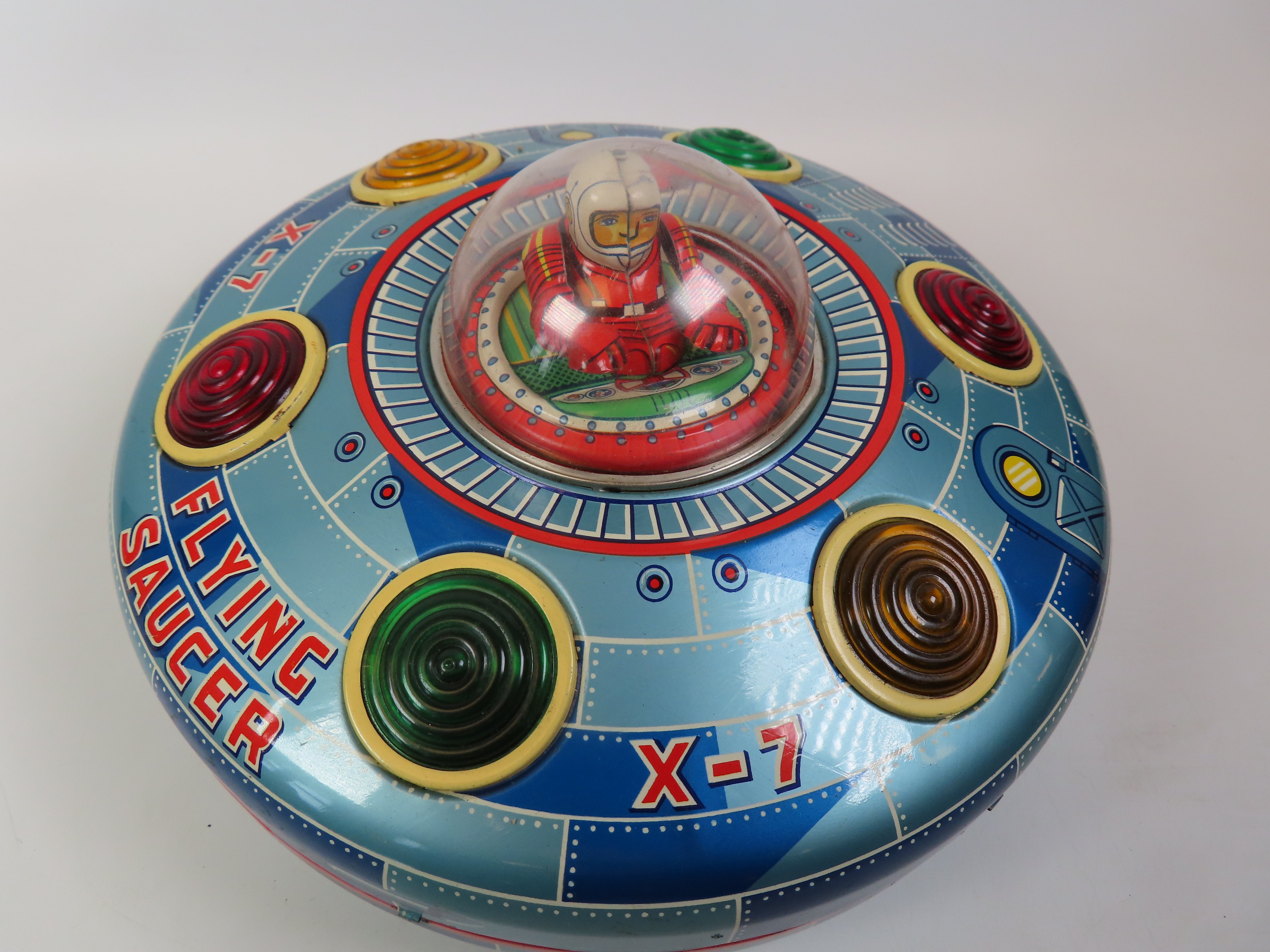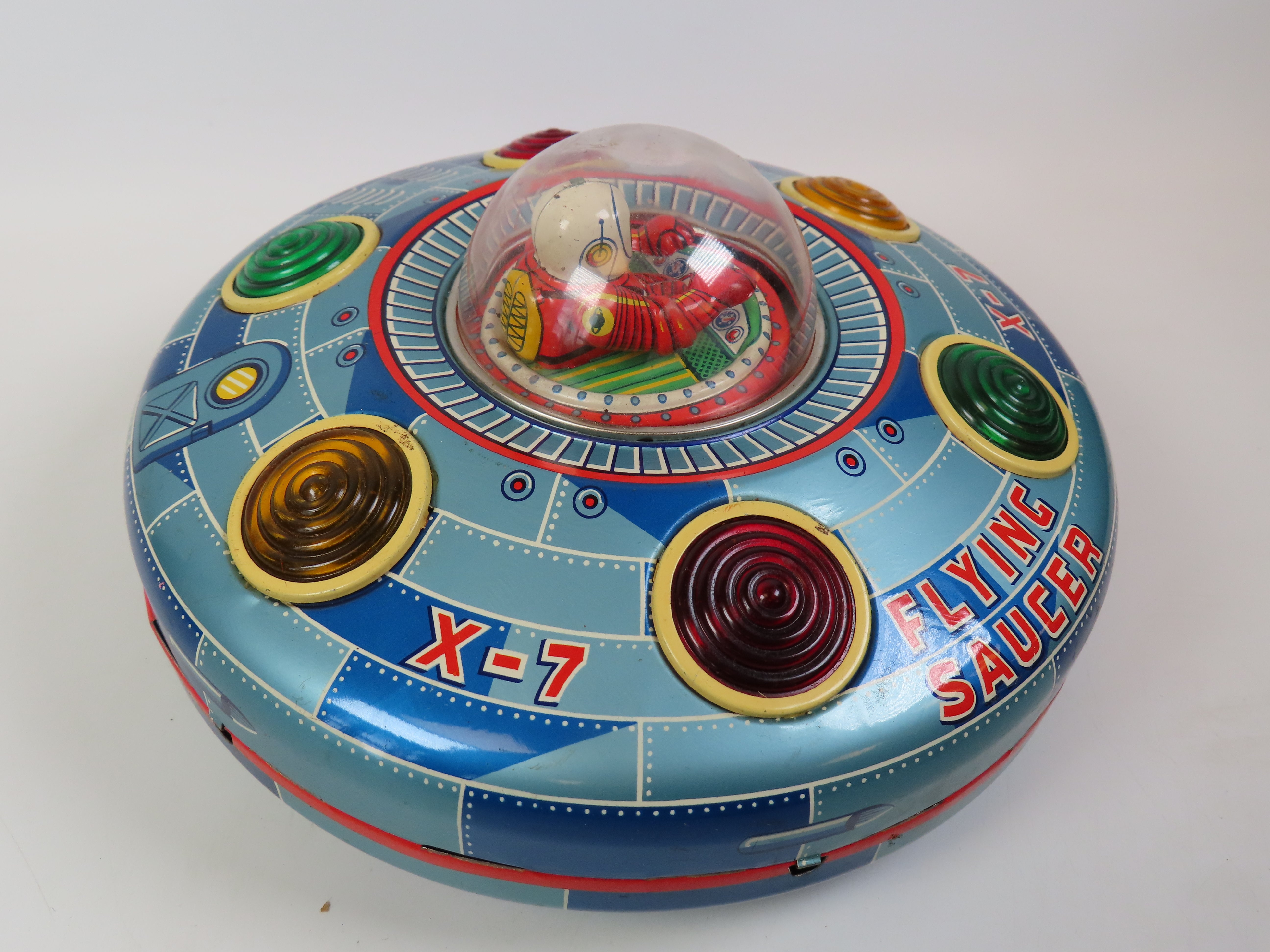 Here we have a beautiful example of the battery operated, tinplate, Flying Saucer X-7 by Exclusively Rethels, made in the early 1960's.