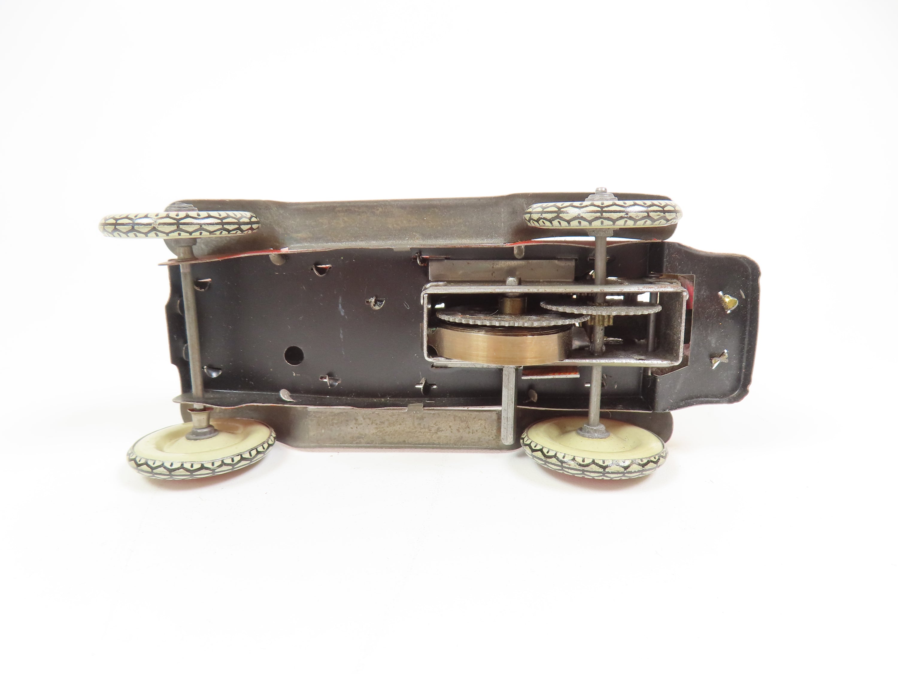 Measures 120mm in length and is a lovely example. There is a little light surface rust and small marks to the paint. The clockwork mechanism is in good working order. For the best idea see the pics.