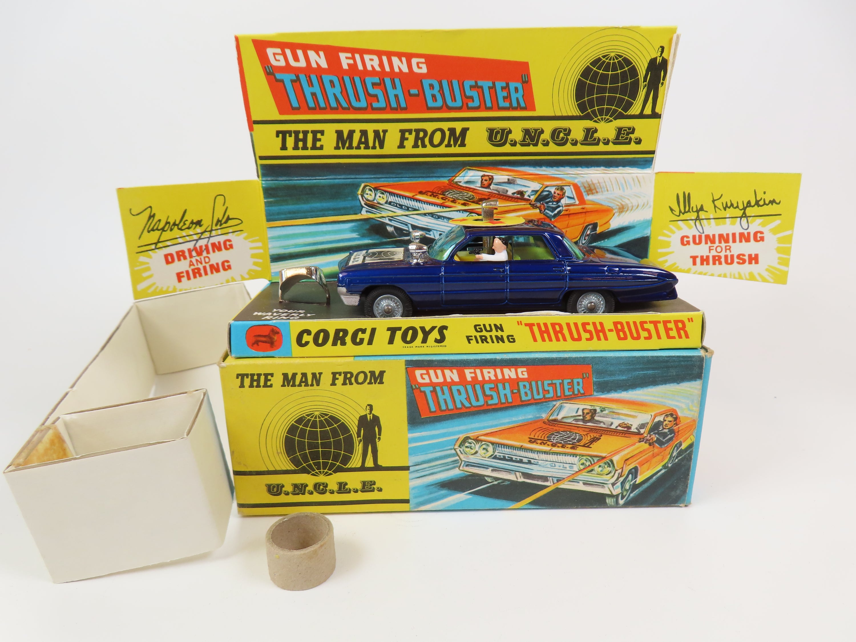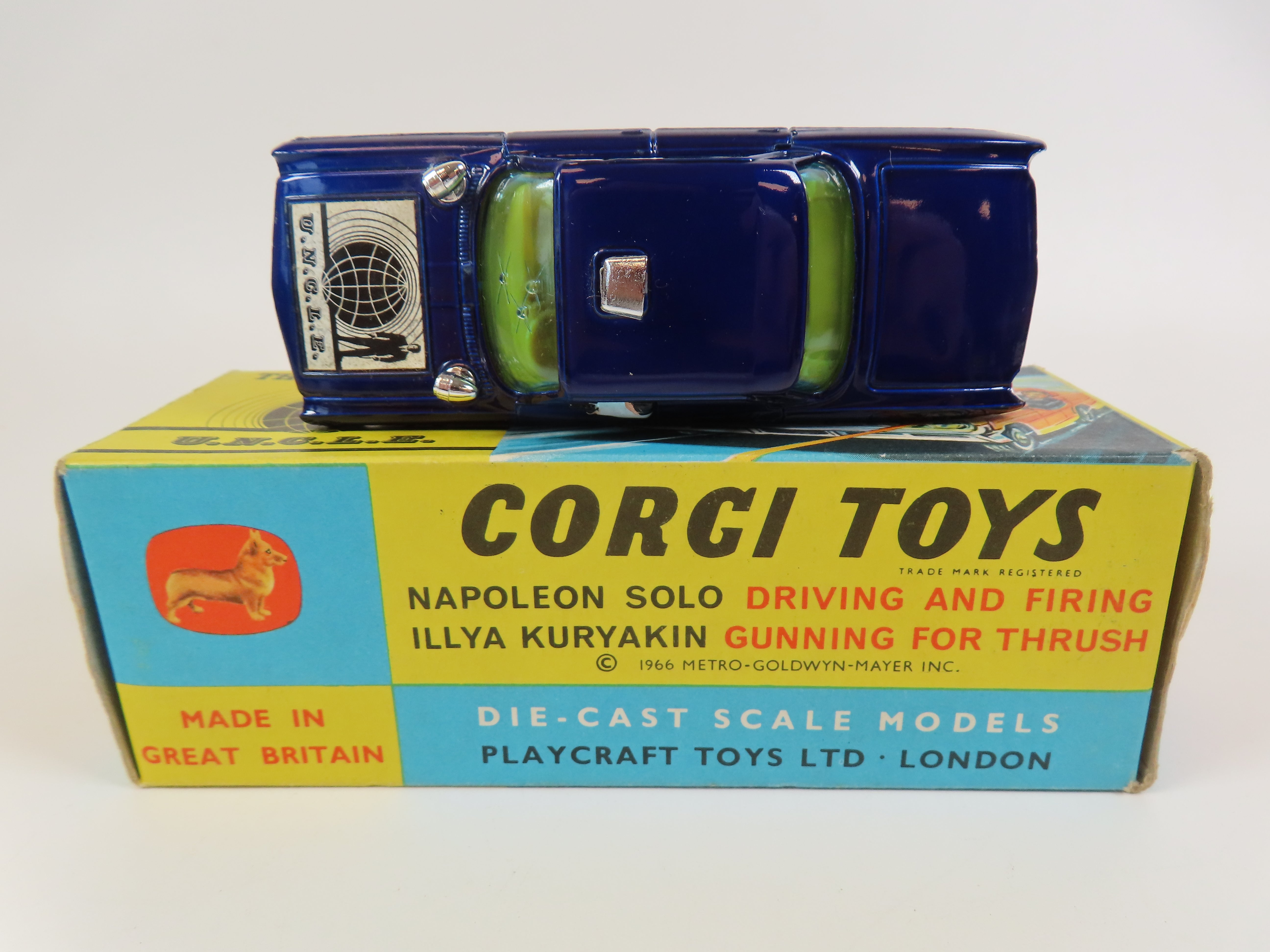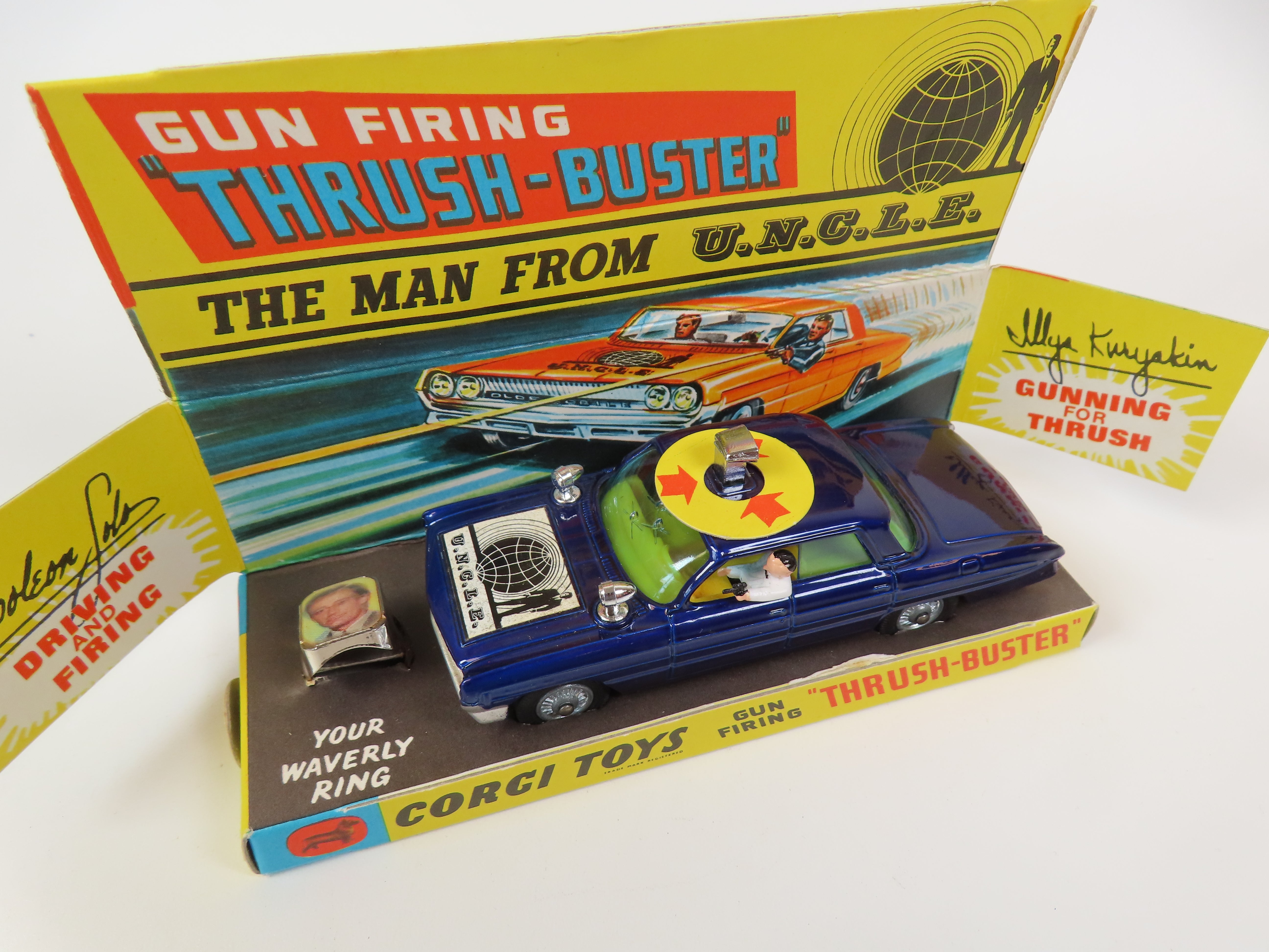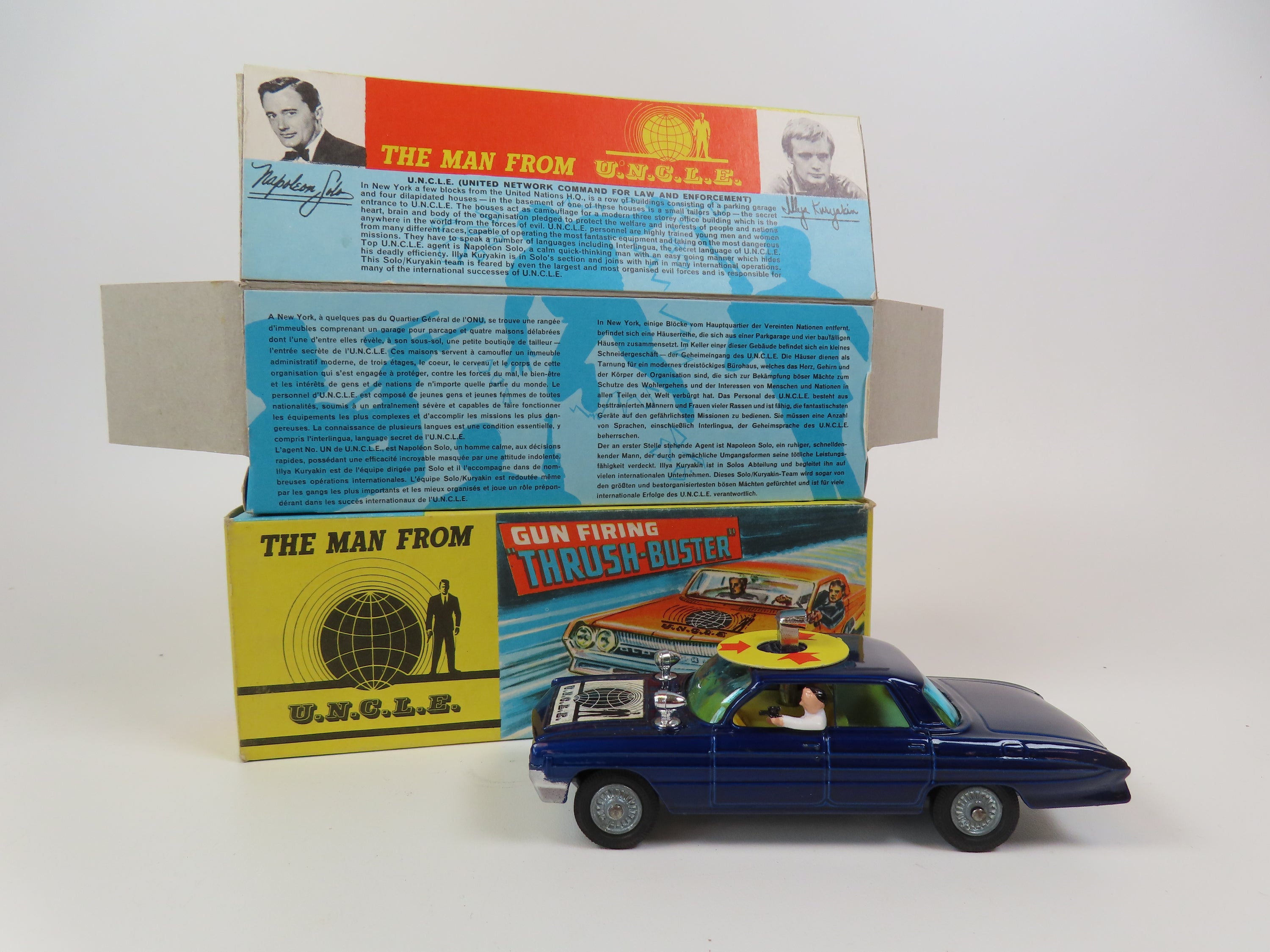 Corgi 497 The Man From U.N.C.L.E. 'Thrush-Buster' in dark blue, with blue tinted windows, yellow interior and 2 figures. Comes with the original waverly ring- often missing from these sets. A fantastic example, would be very hard to better!