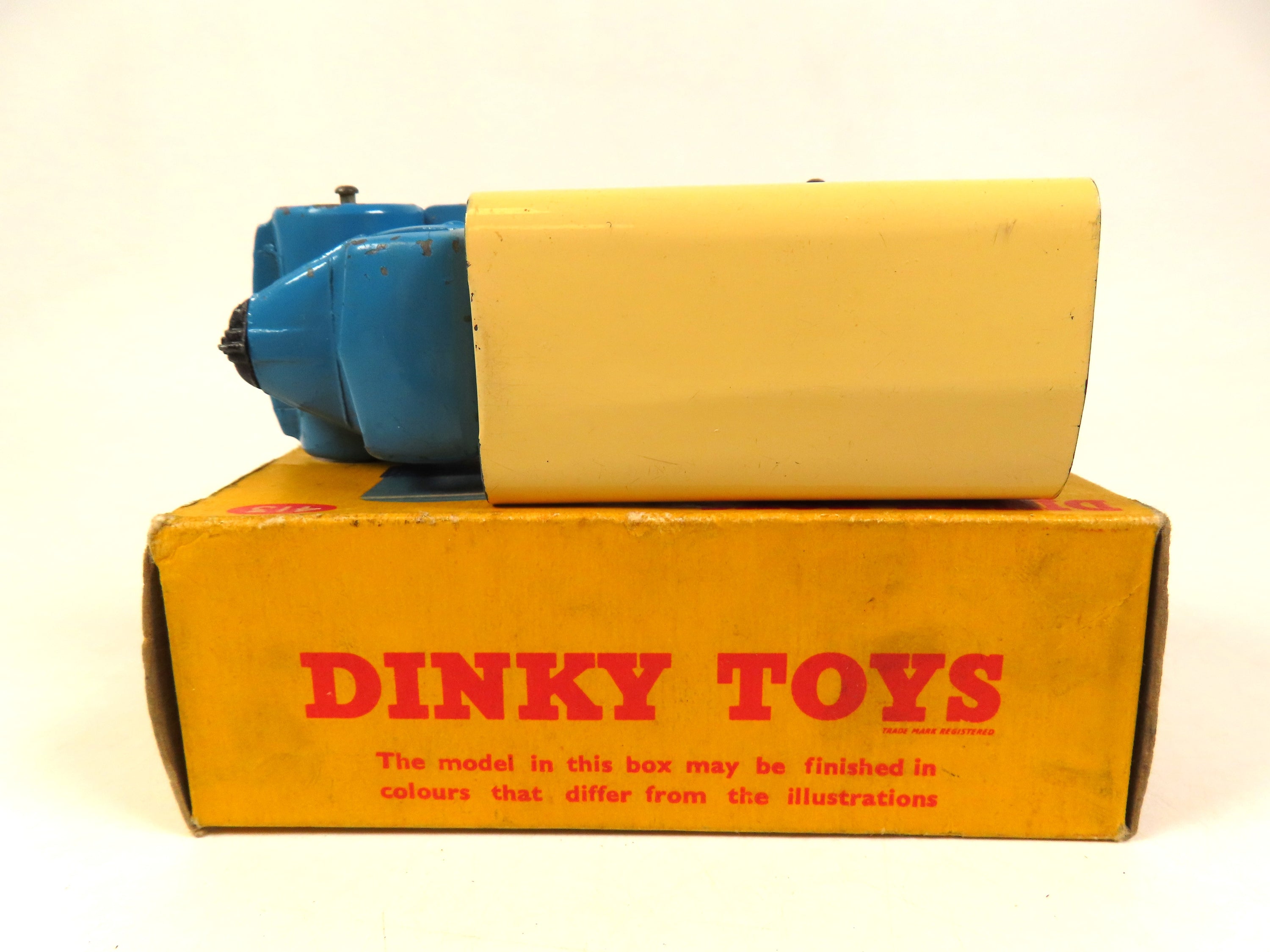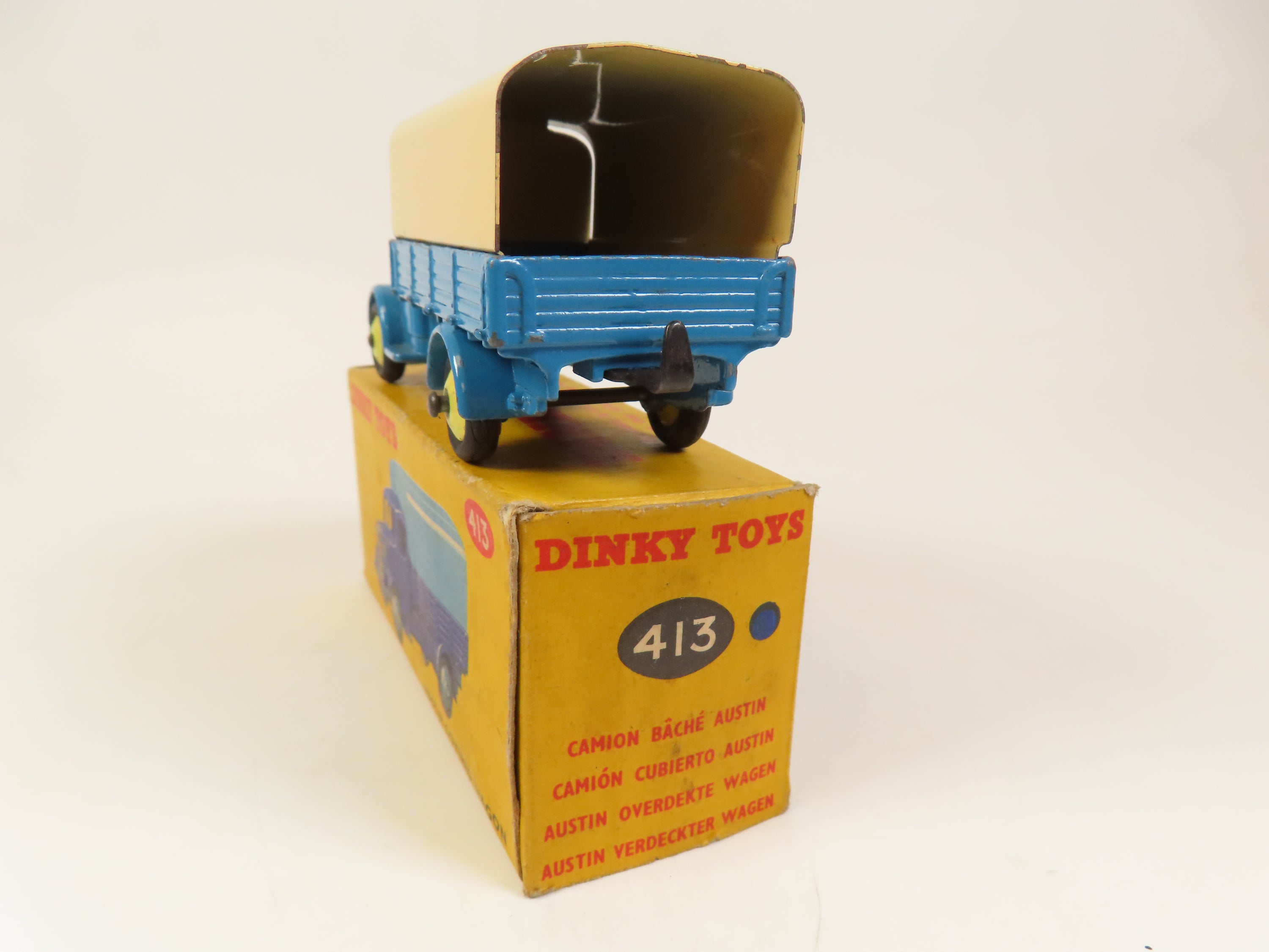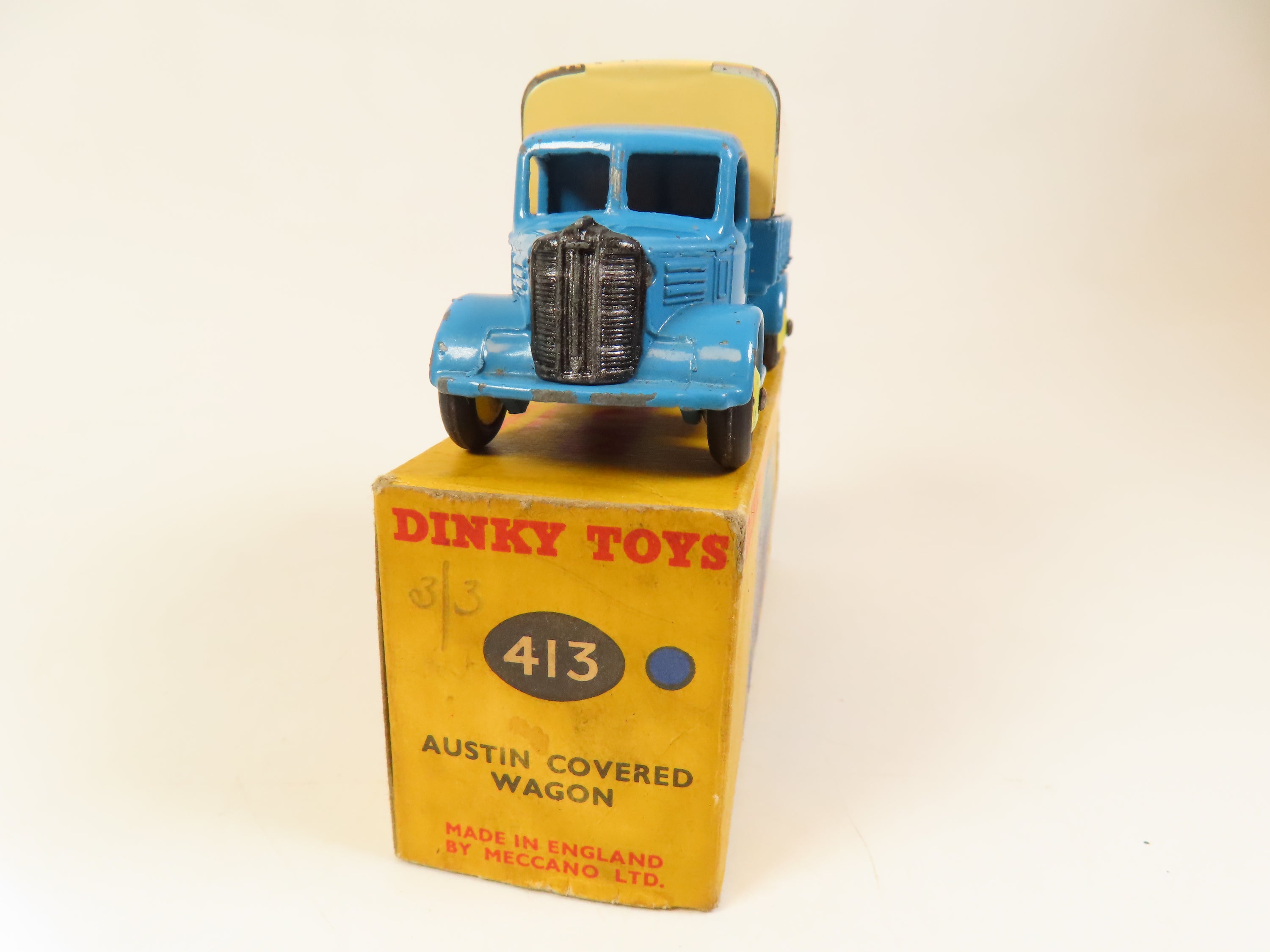 Dinky 413 Austin Covered Wagon with a blue cab and chassis, light yellow painted hubs and cream canopy to the rear.