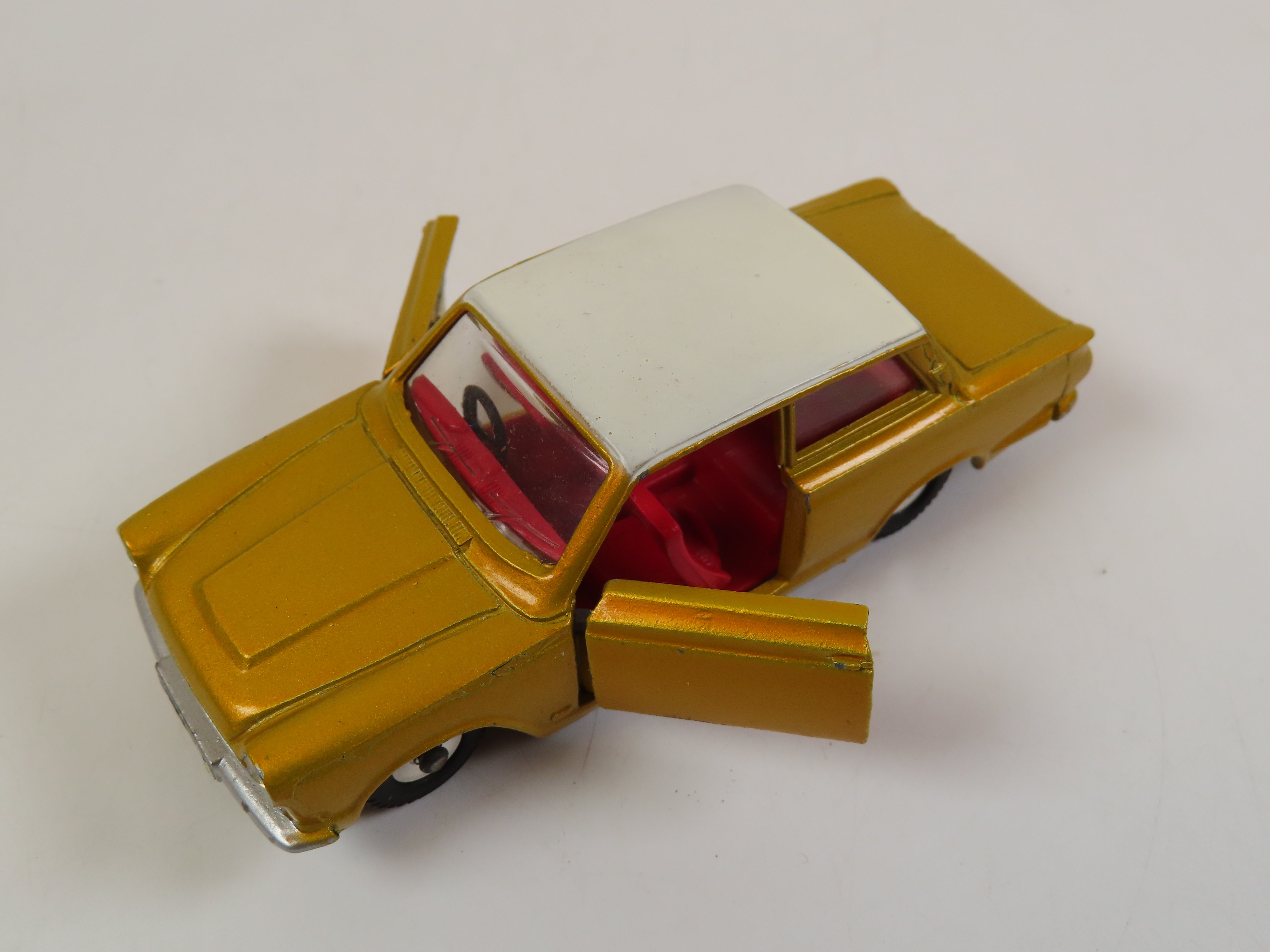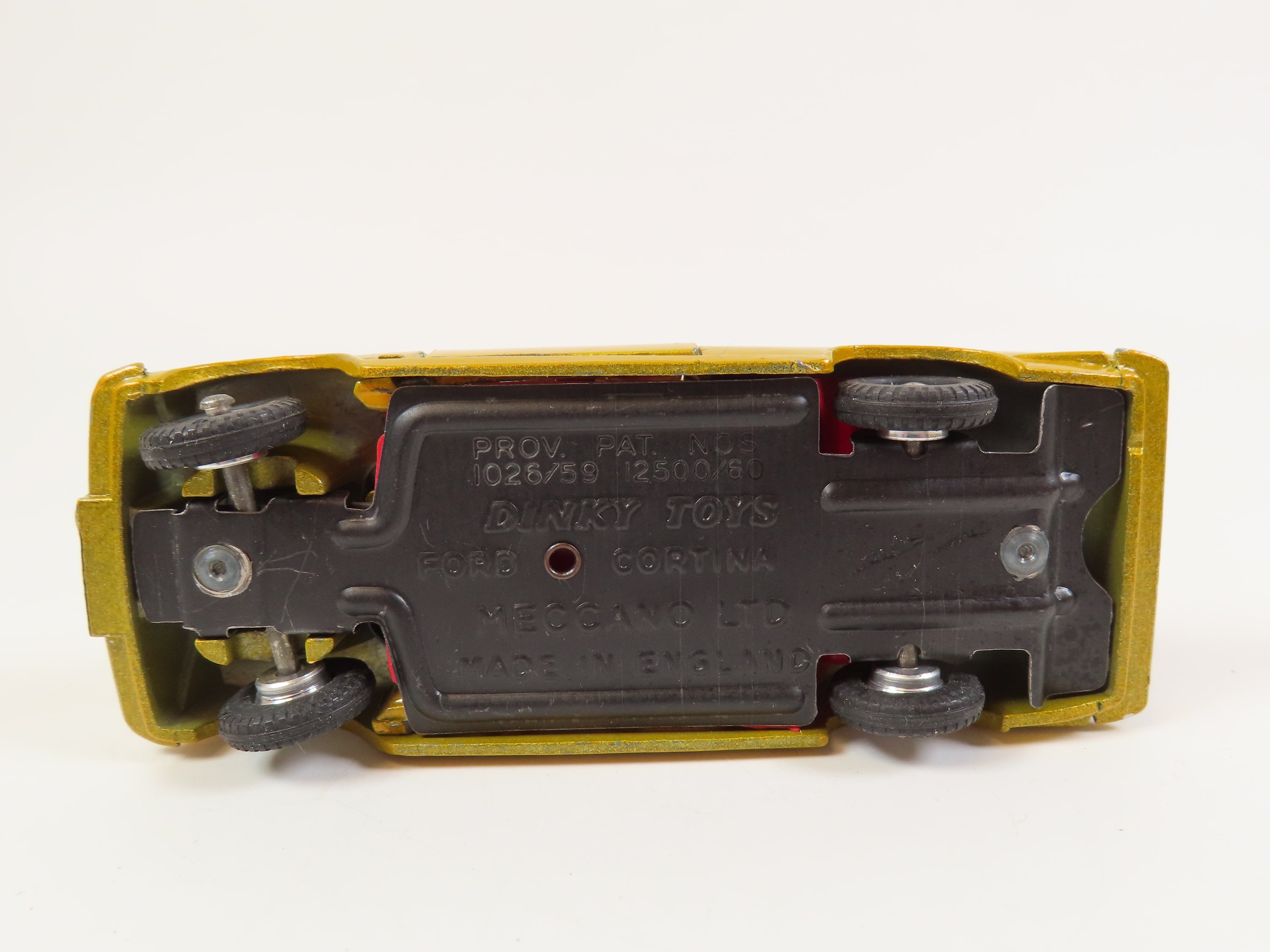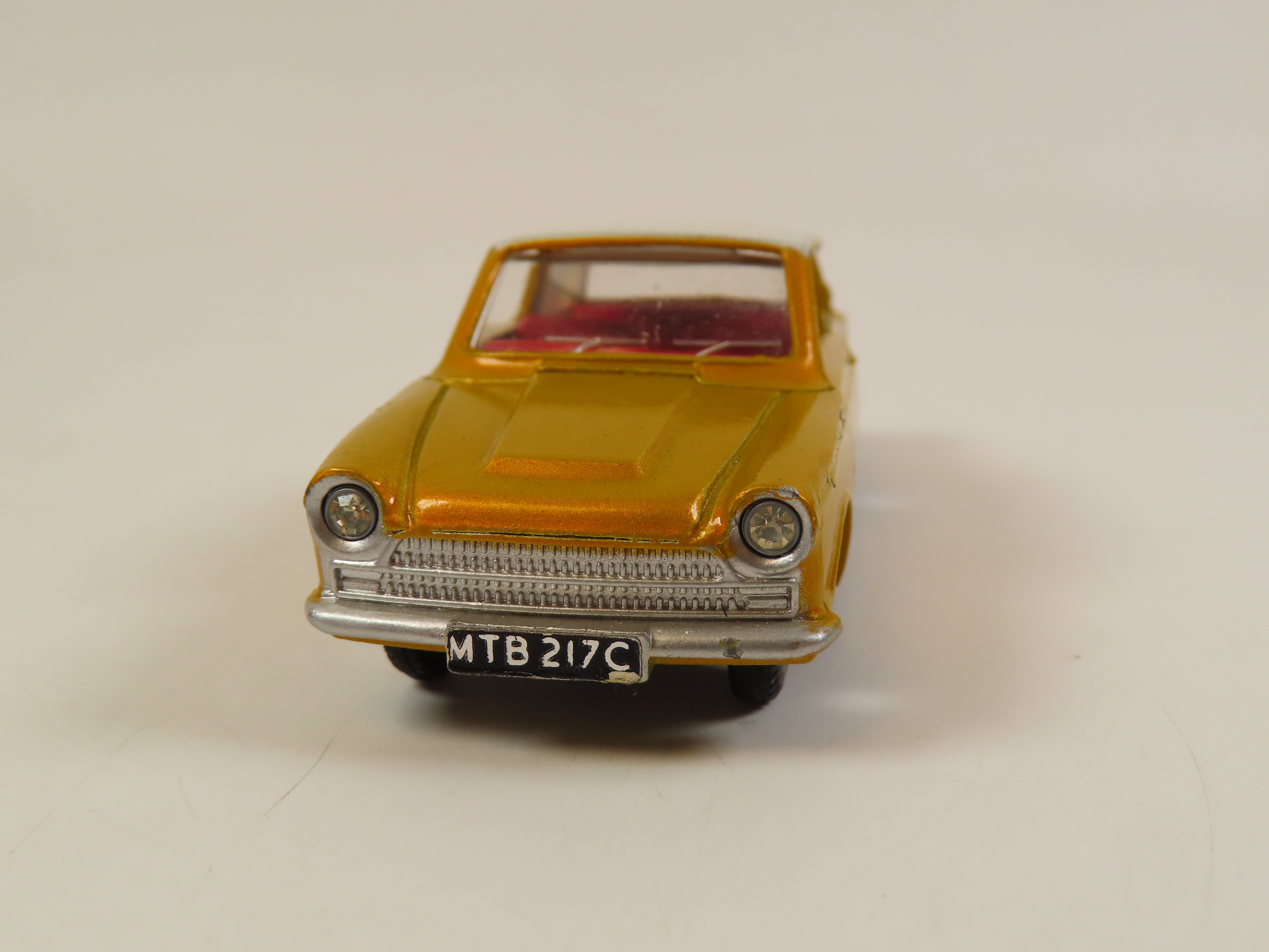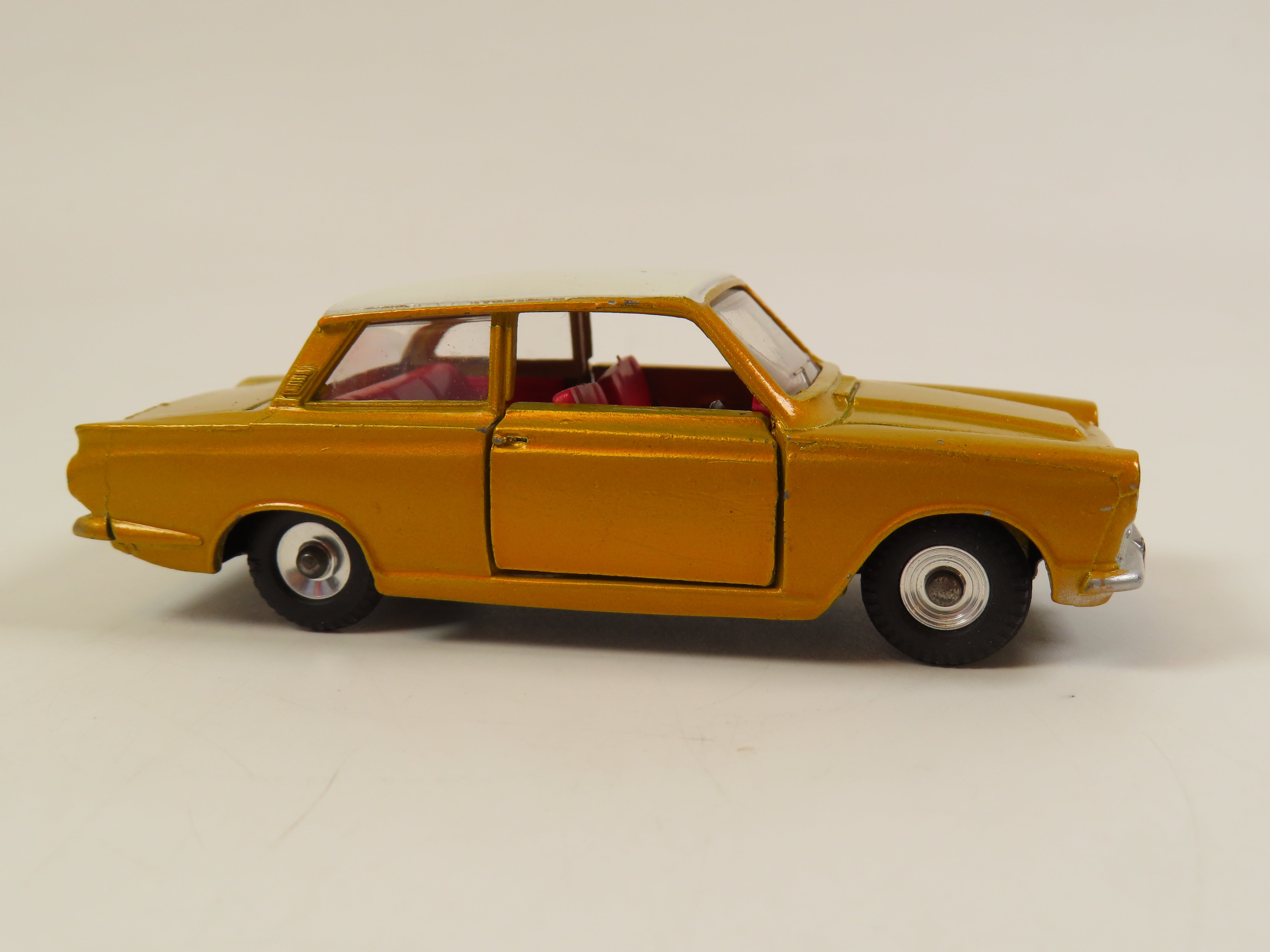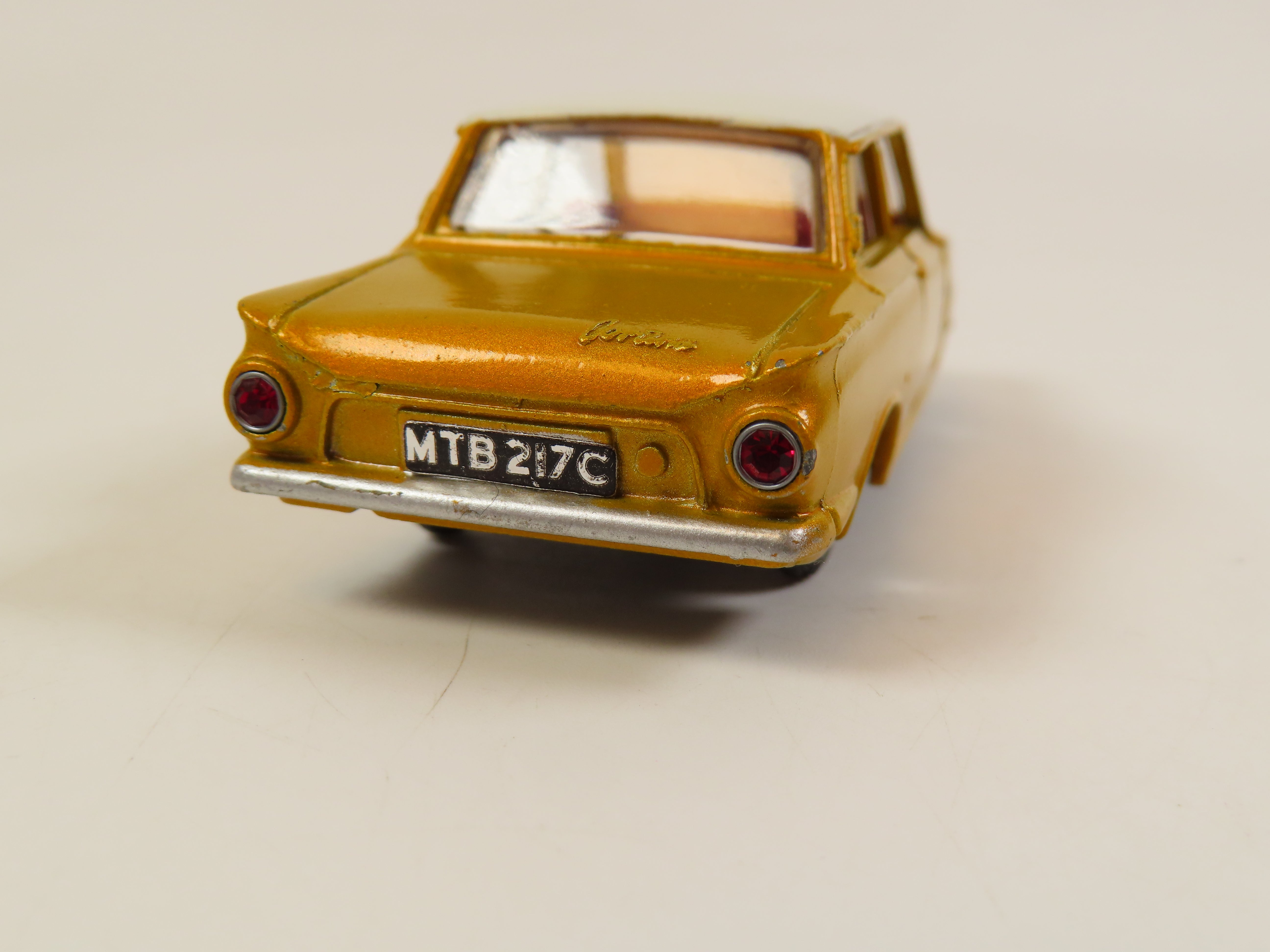 Dinky 133 Ford Cortina in a lovely metallic golden yellow colour, with white roof and red interior. Hard model to find!