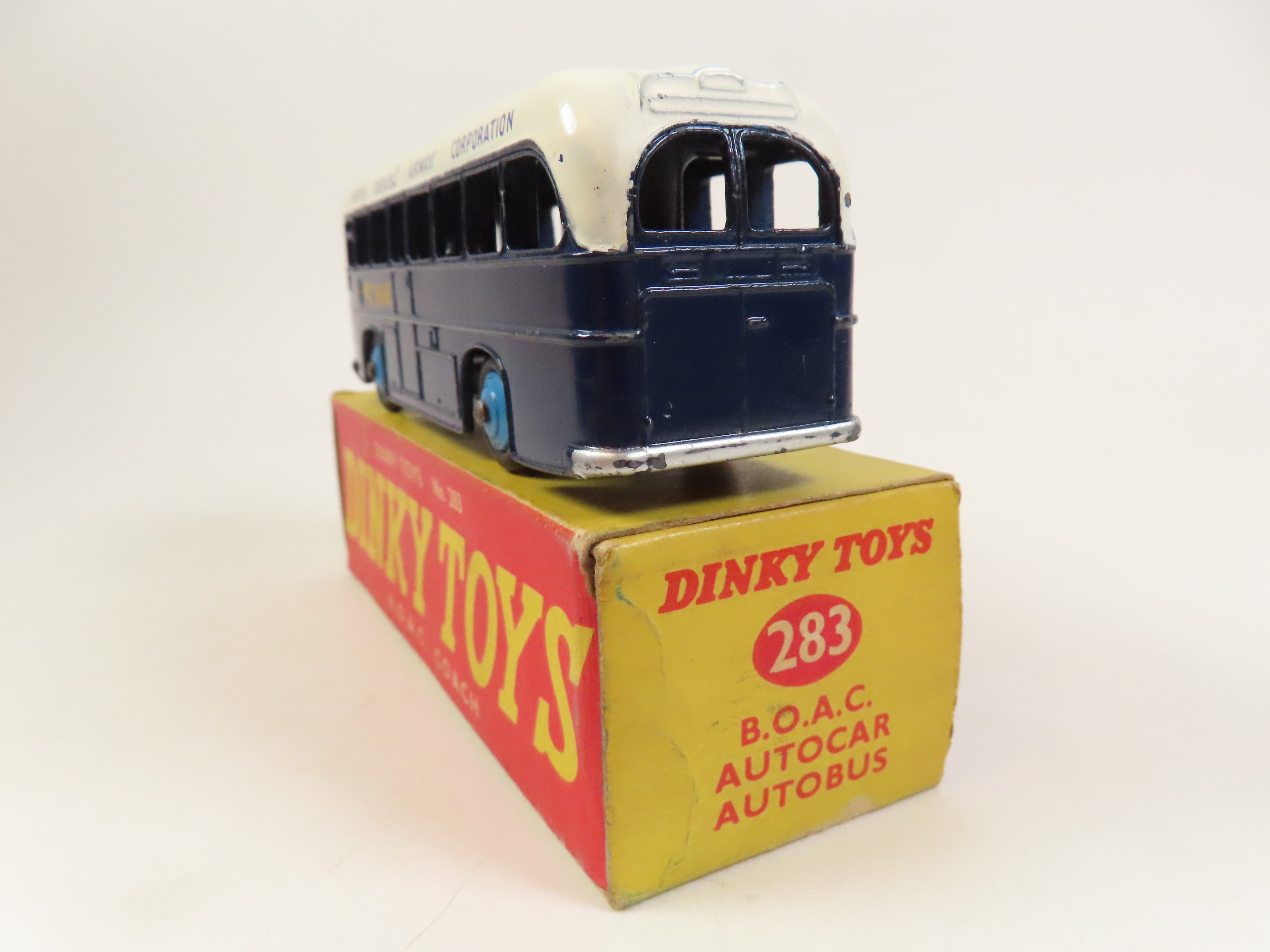 Dinky 283 B.O.A.C. Coach in dark blue, with light blue hubs, white roof with blue lettering, and yellow 'B.O.A.C' & symbol decals to the sides.