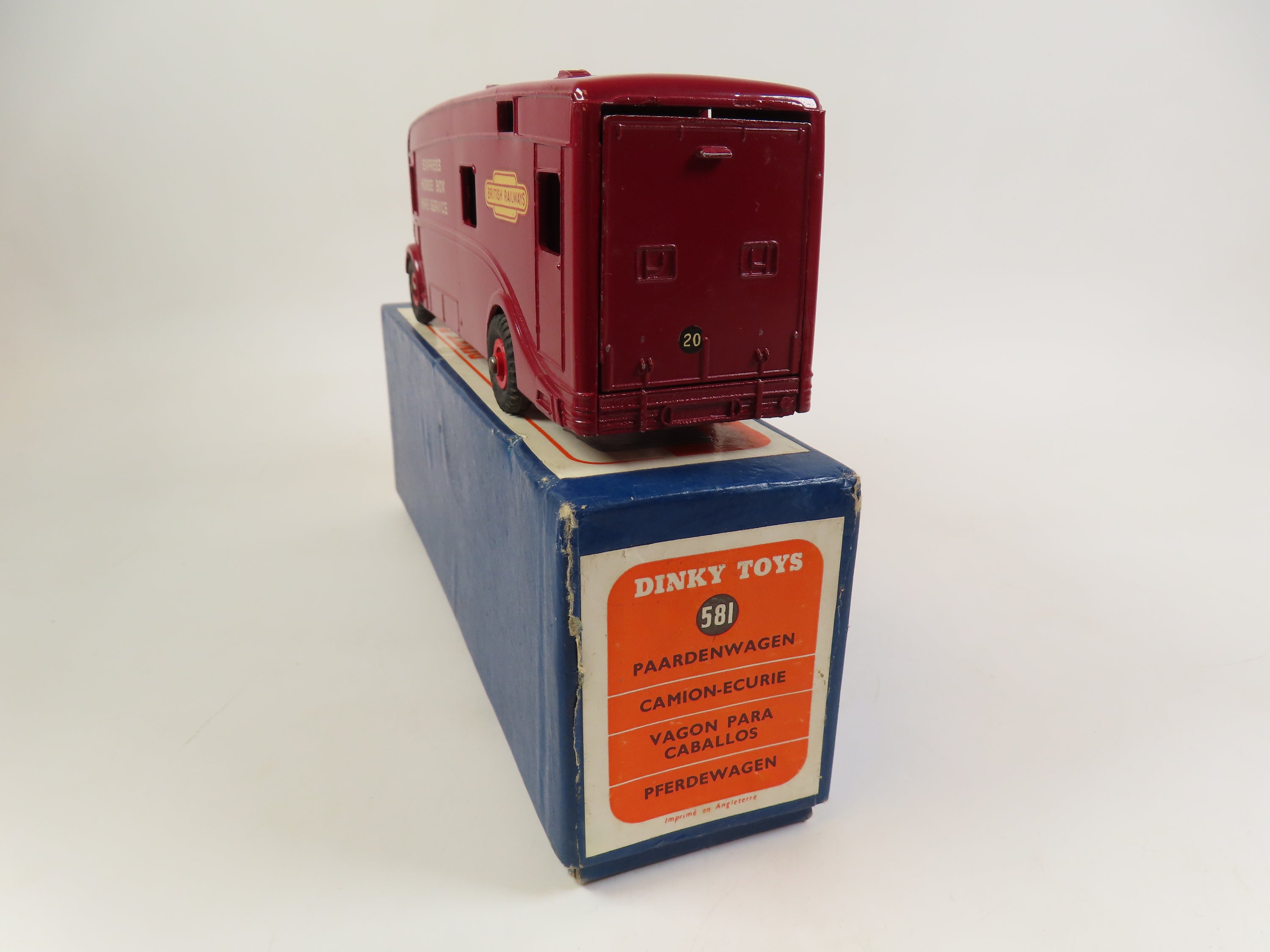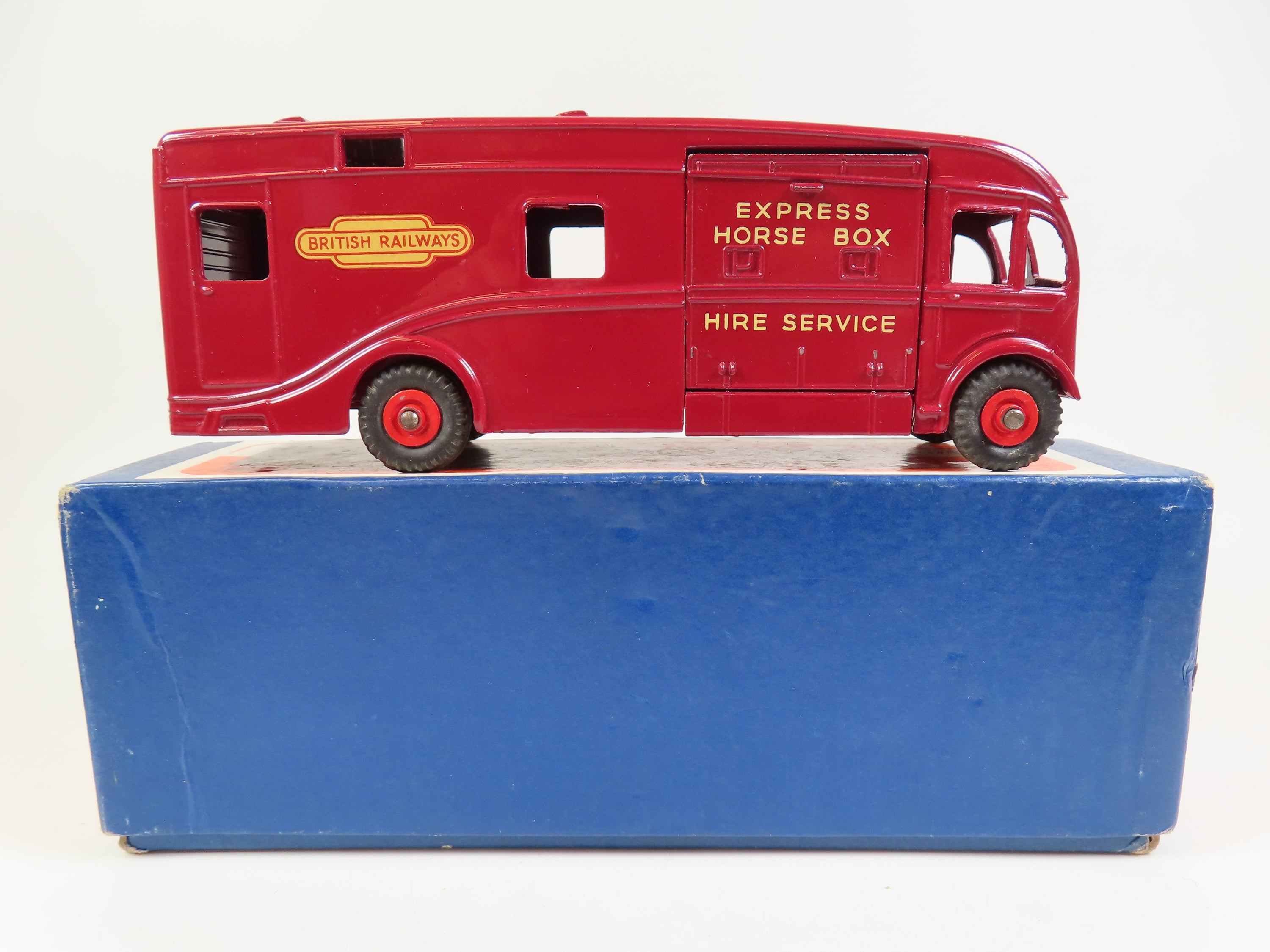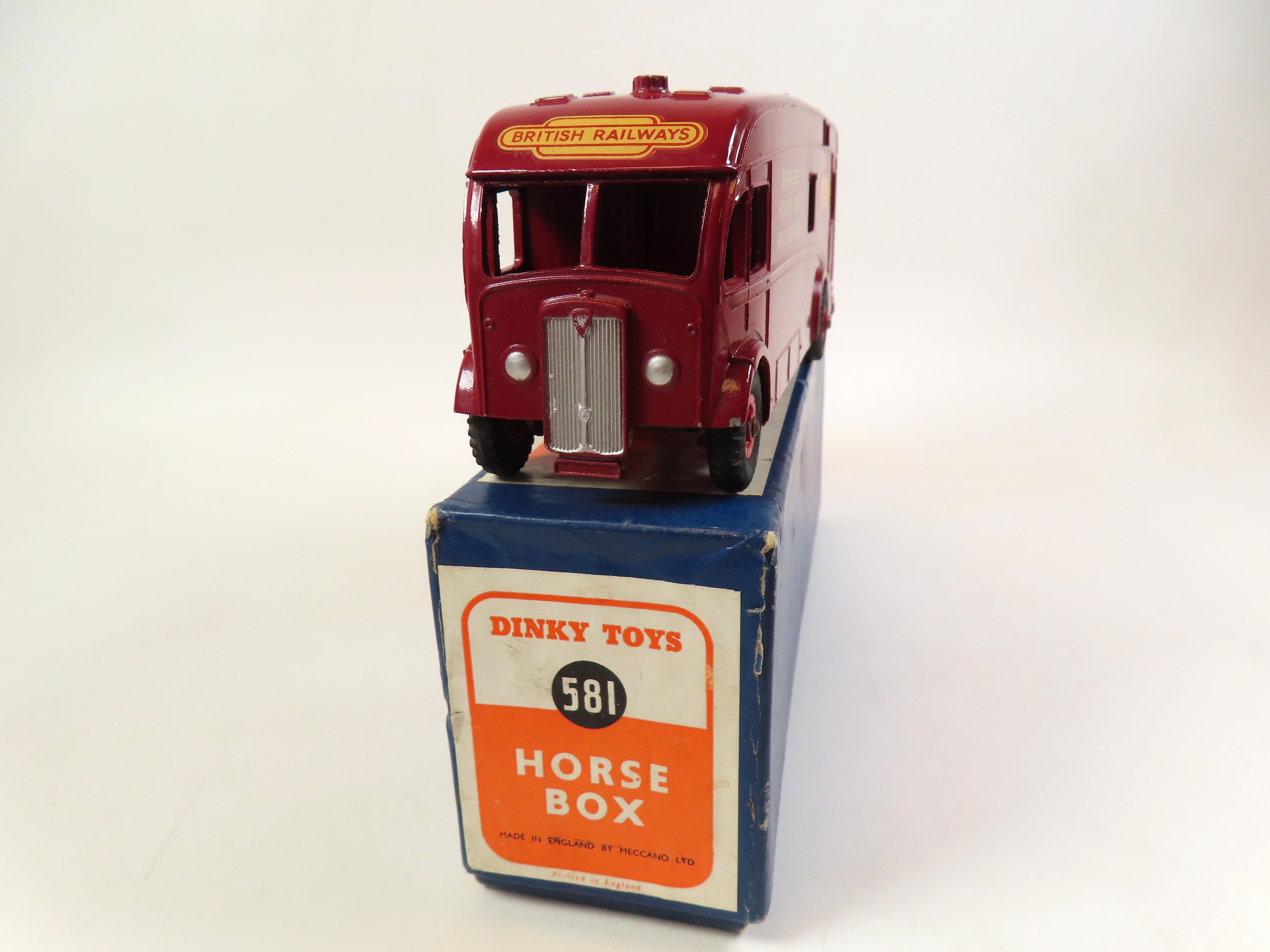 Dinky 581 Horse Box in maroon with red hubs and 'Express Horse Box Hire Service' lettering & British Railways decals to each side and the front.