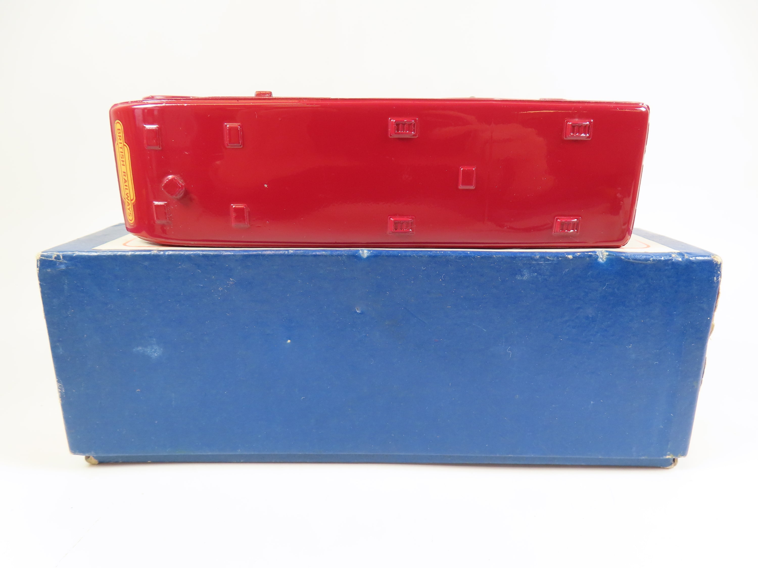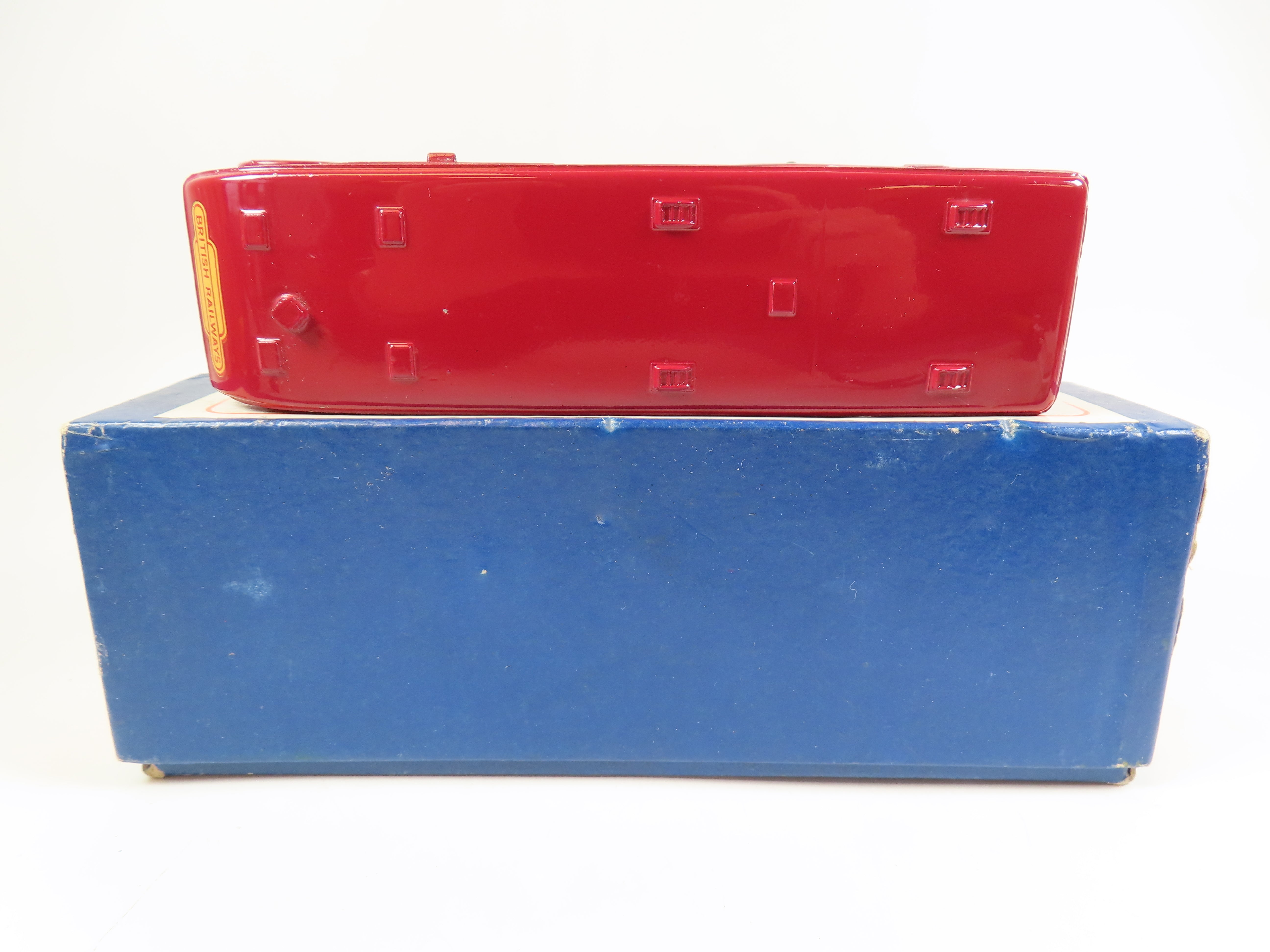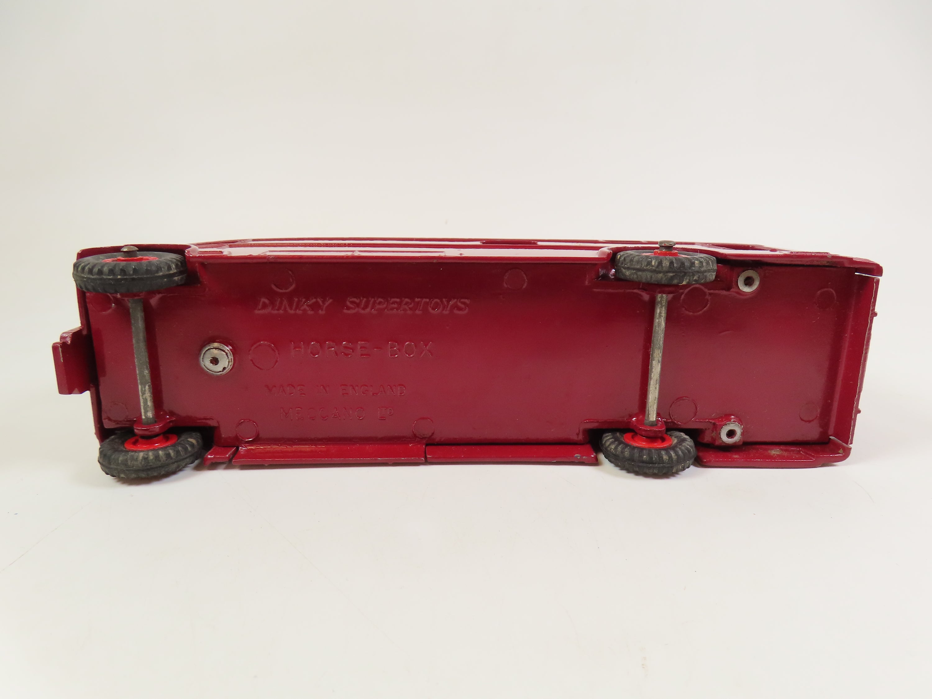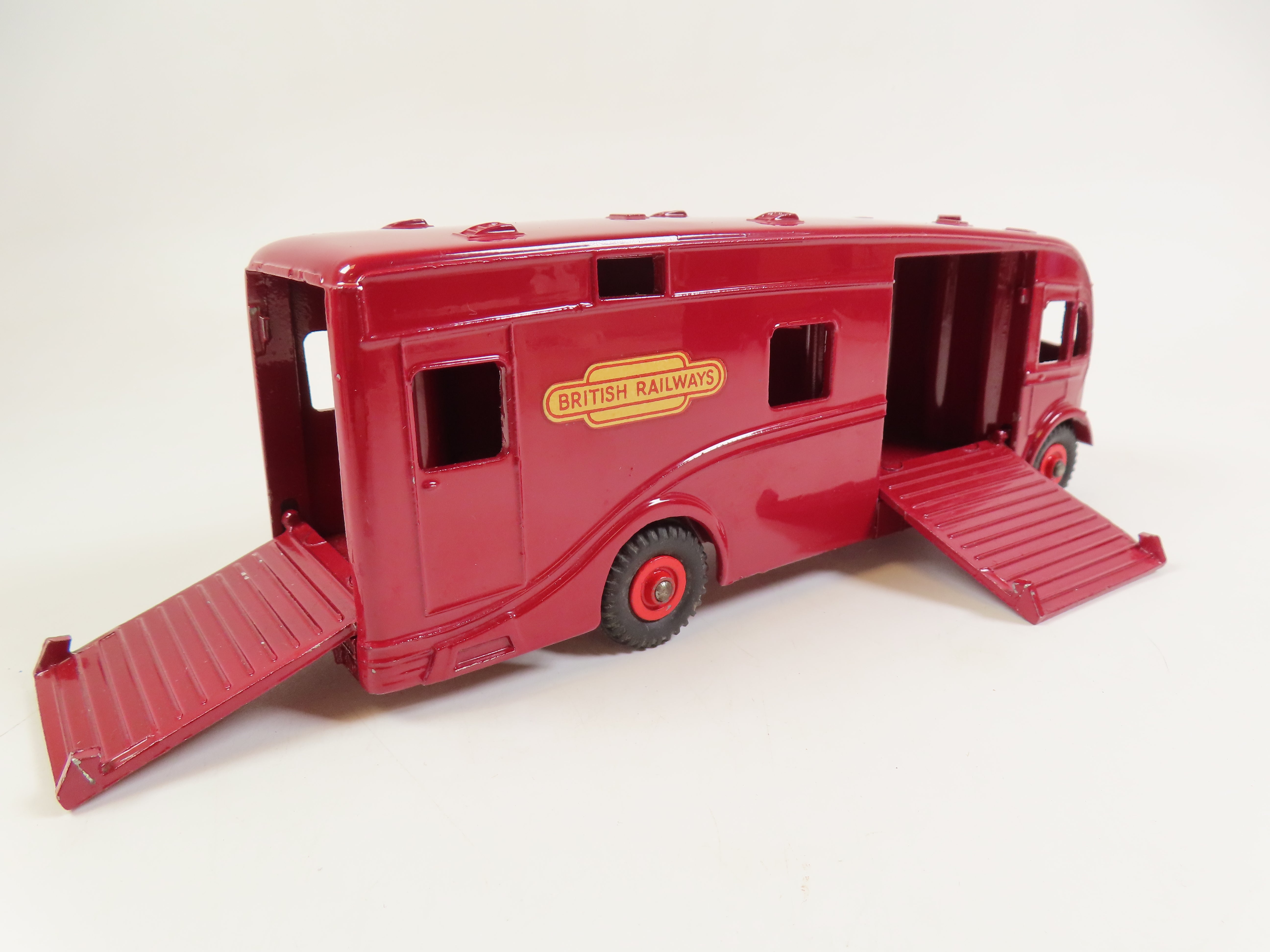 Dinky 581 Horse Box in maroon with red hubs and 'Express Horse Box Hire Service' lettering & British Railways decals to each side and the front.
