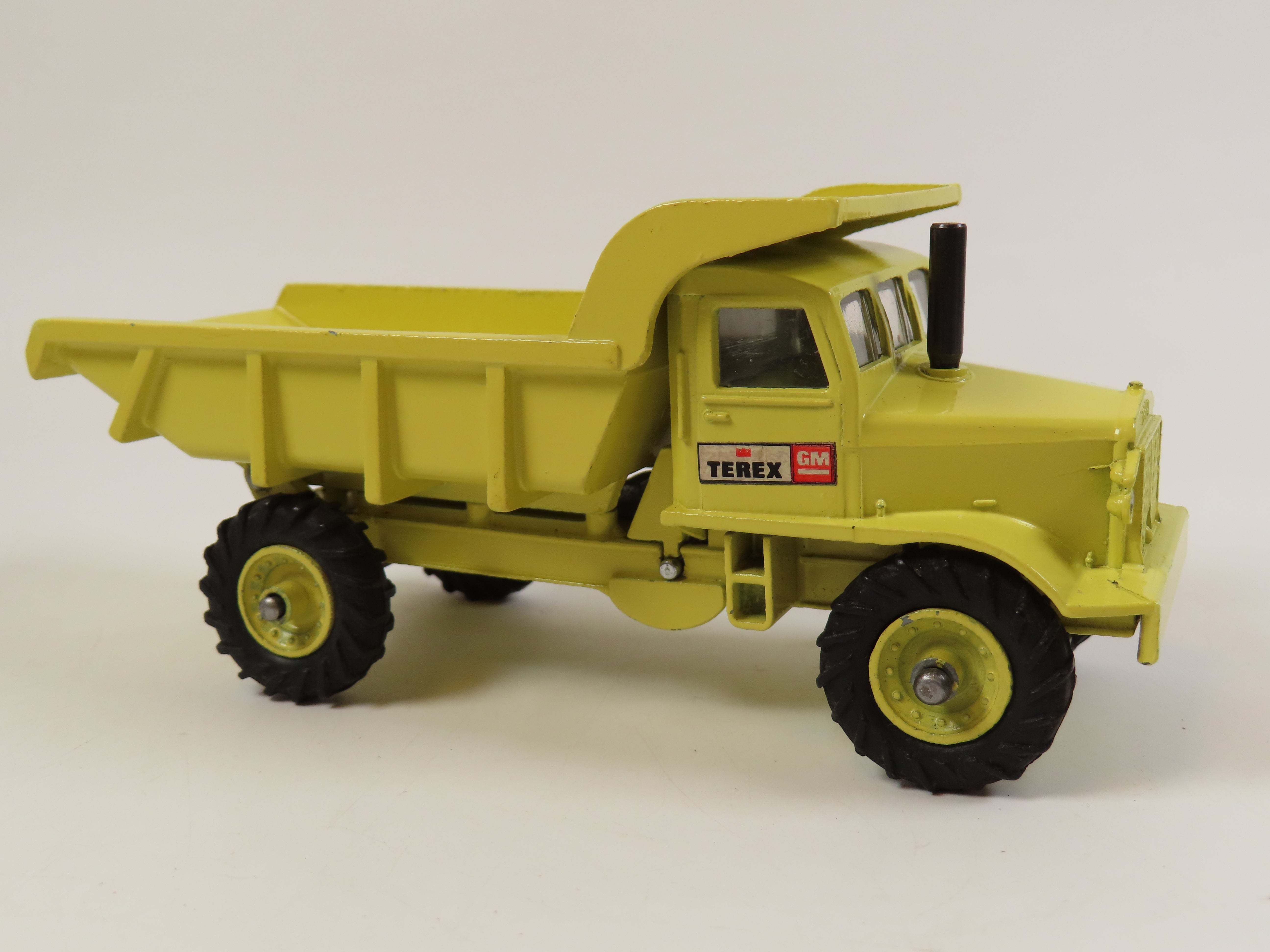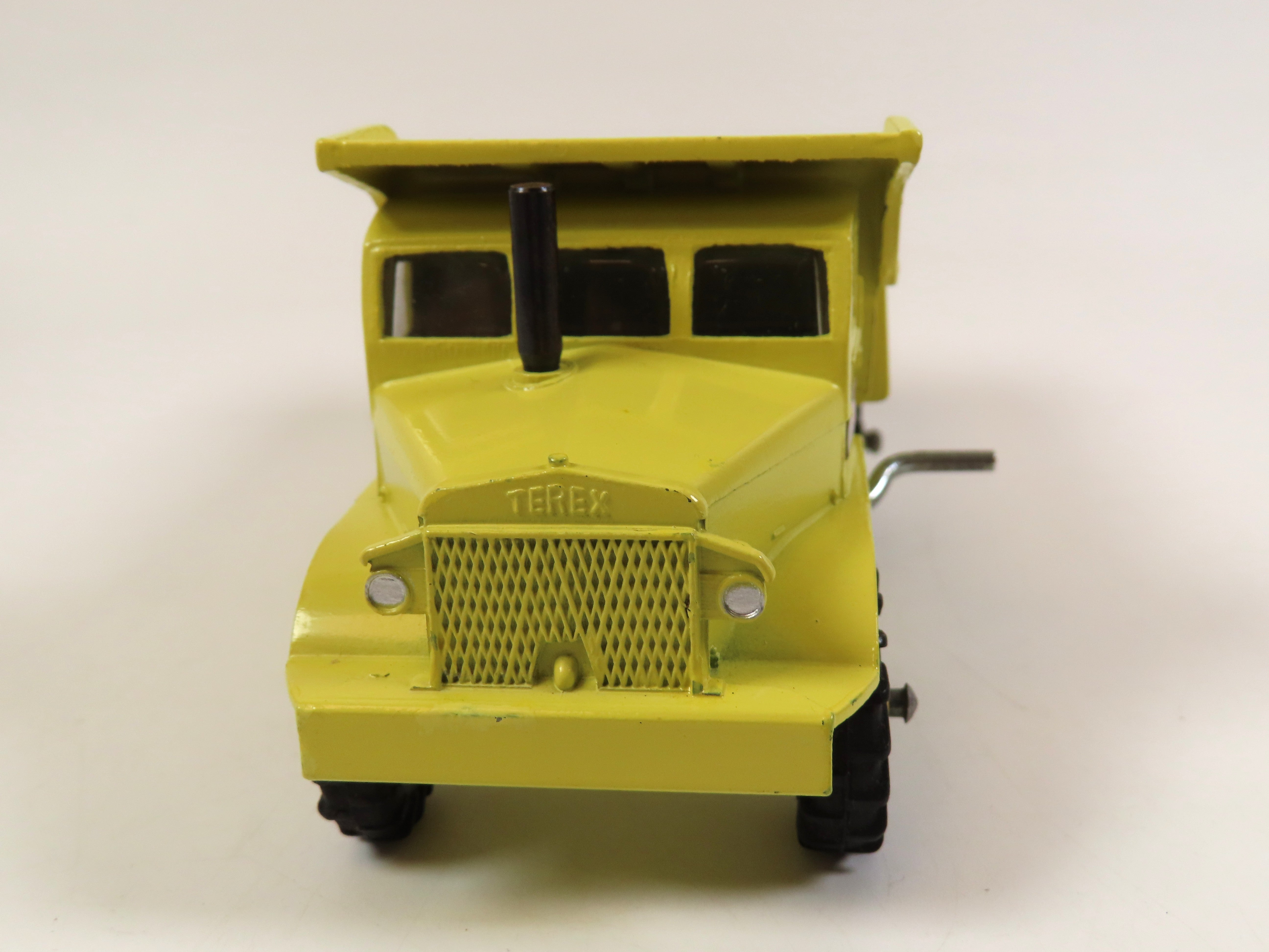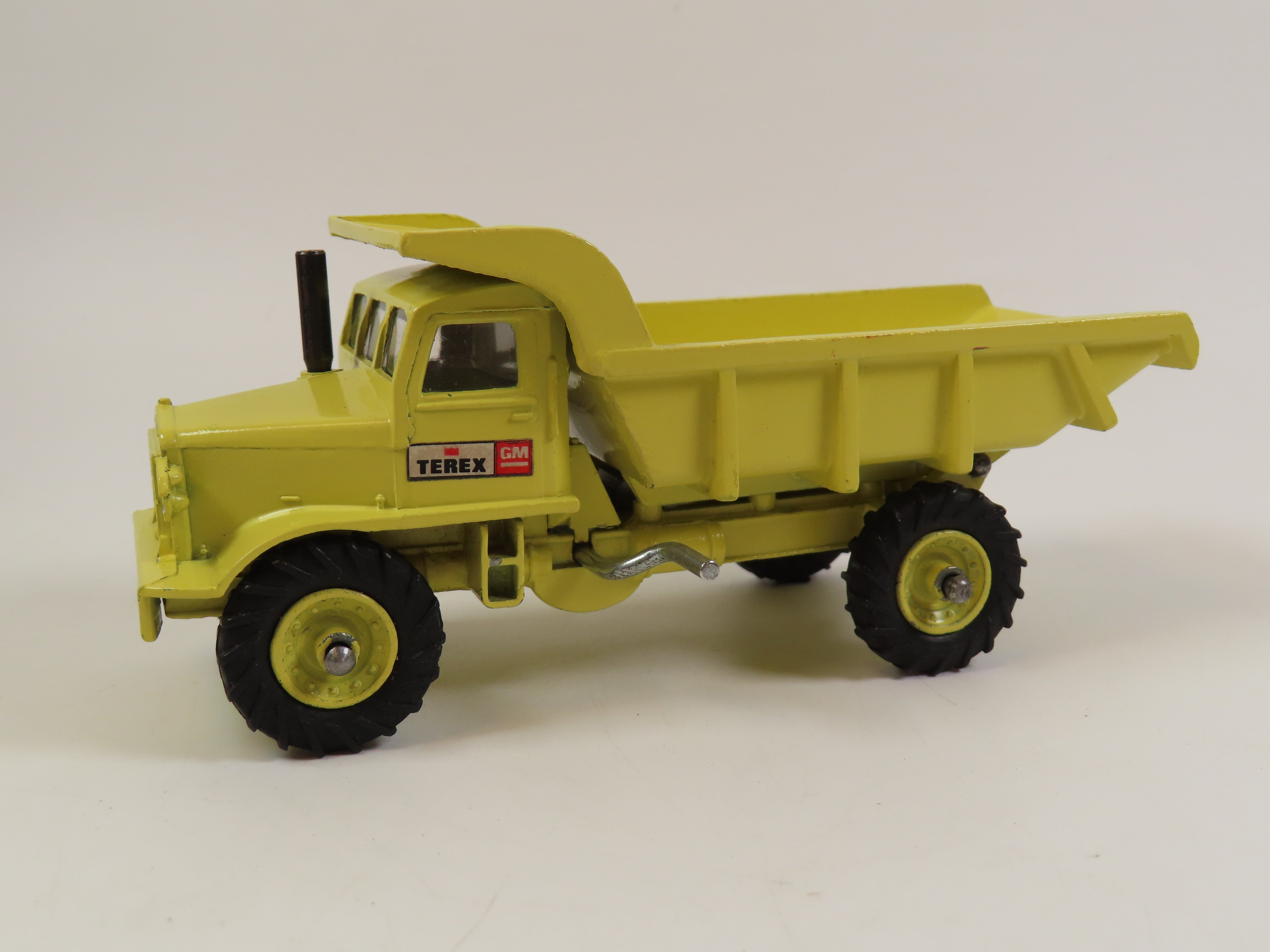 Dinky 965 Terex Rear Dump Truck in pale yellow with yellow painted hubs and 'TEREX GM' labels to each side. Very rare issue, only issued for one year.