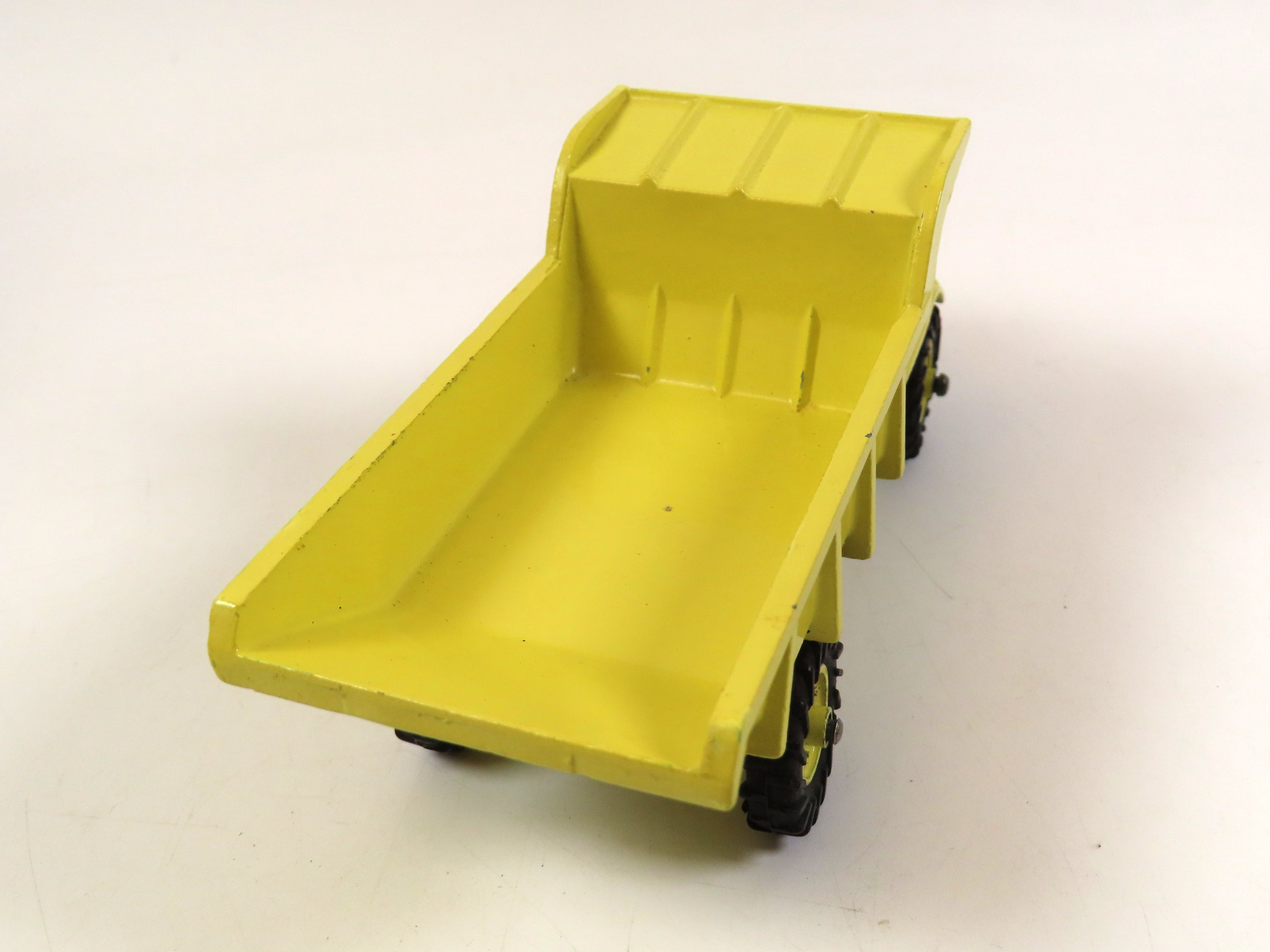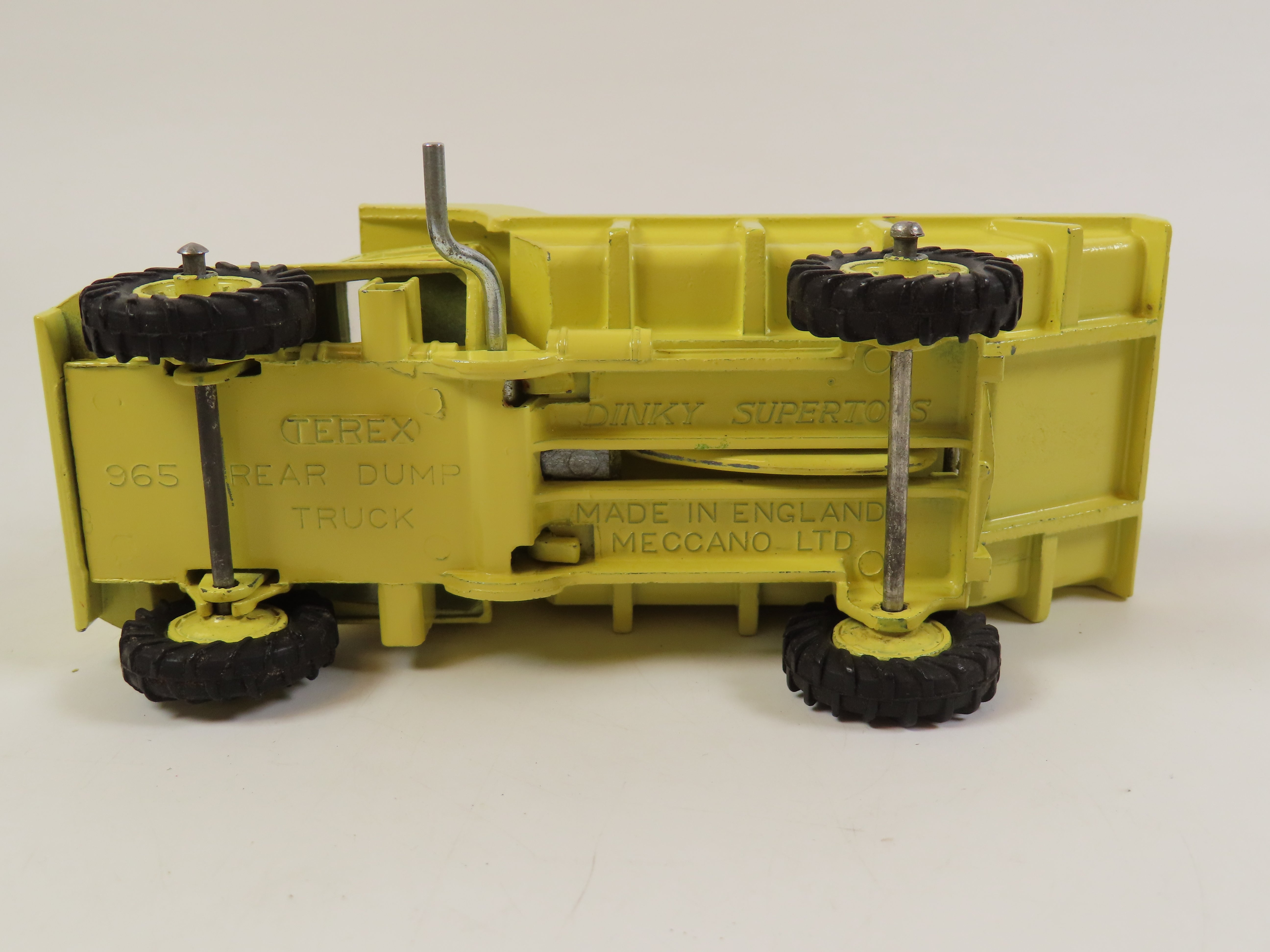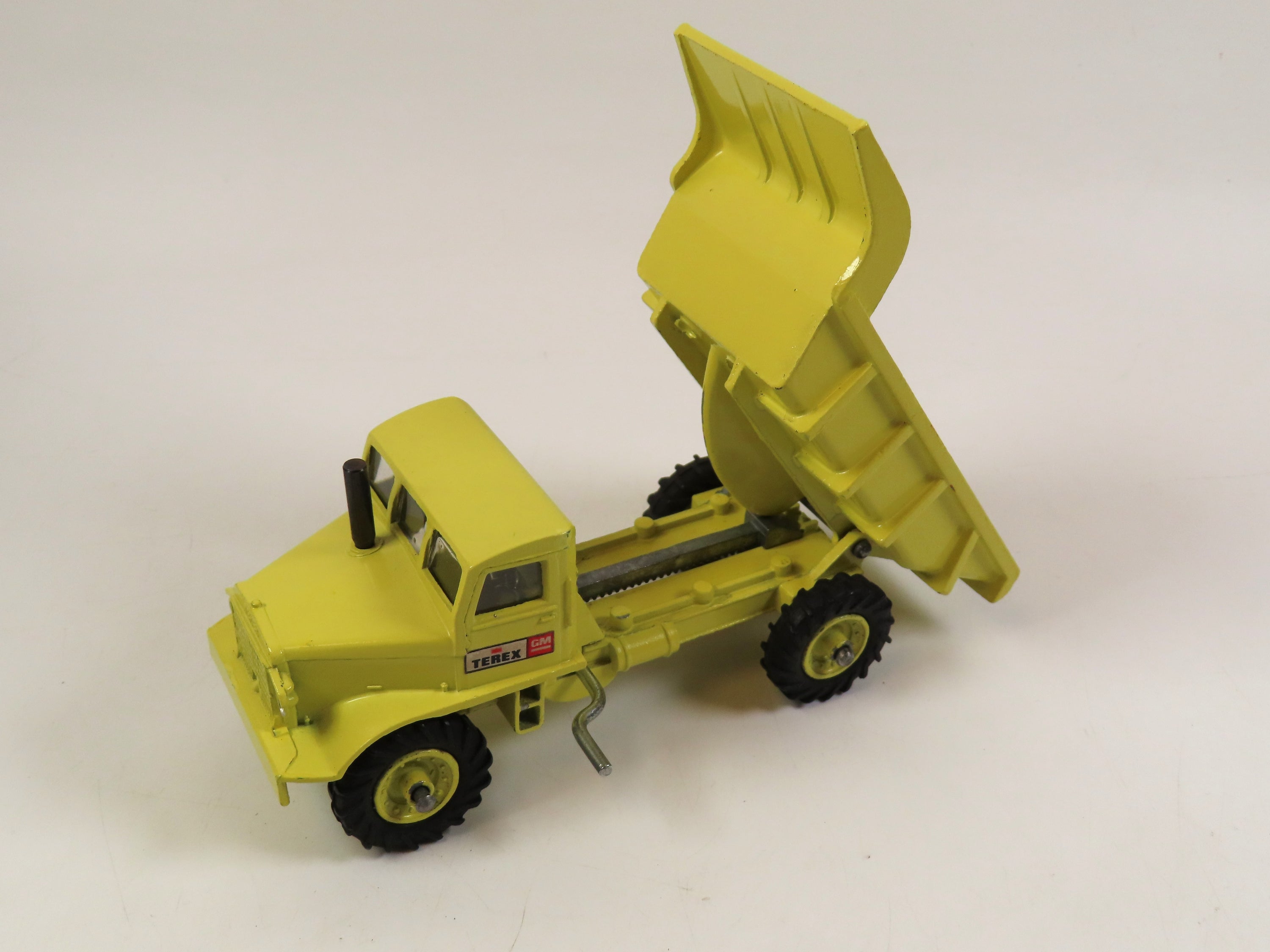 Dinky 965 Terex Rear Dump Truck in pale yellow with yellow painted hubs and 'TEREX GM' labels to each side. Very rare issue, only issued for one year.
