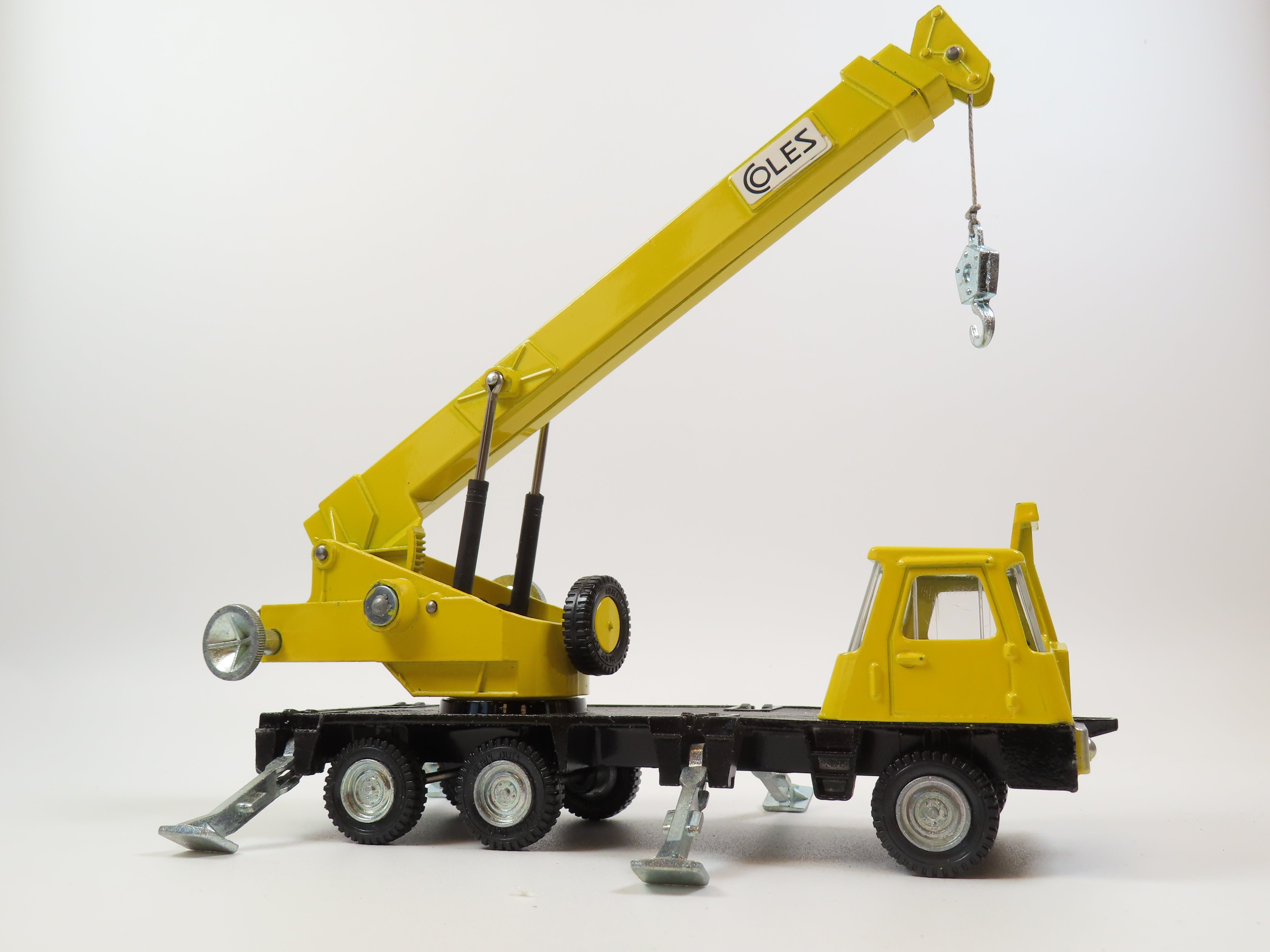 Dinky 980 Coles Hydra Truck 150T in light yellow with black base and 'Coles' decals to each side of the crane arm and to the rear.