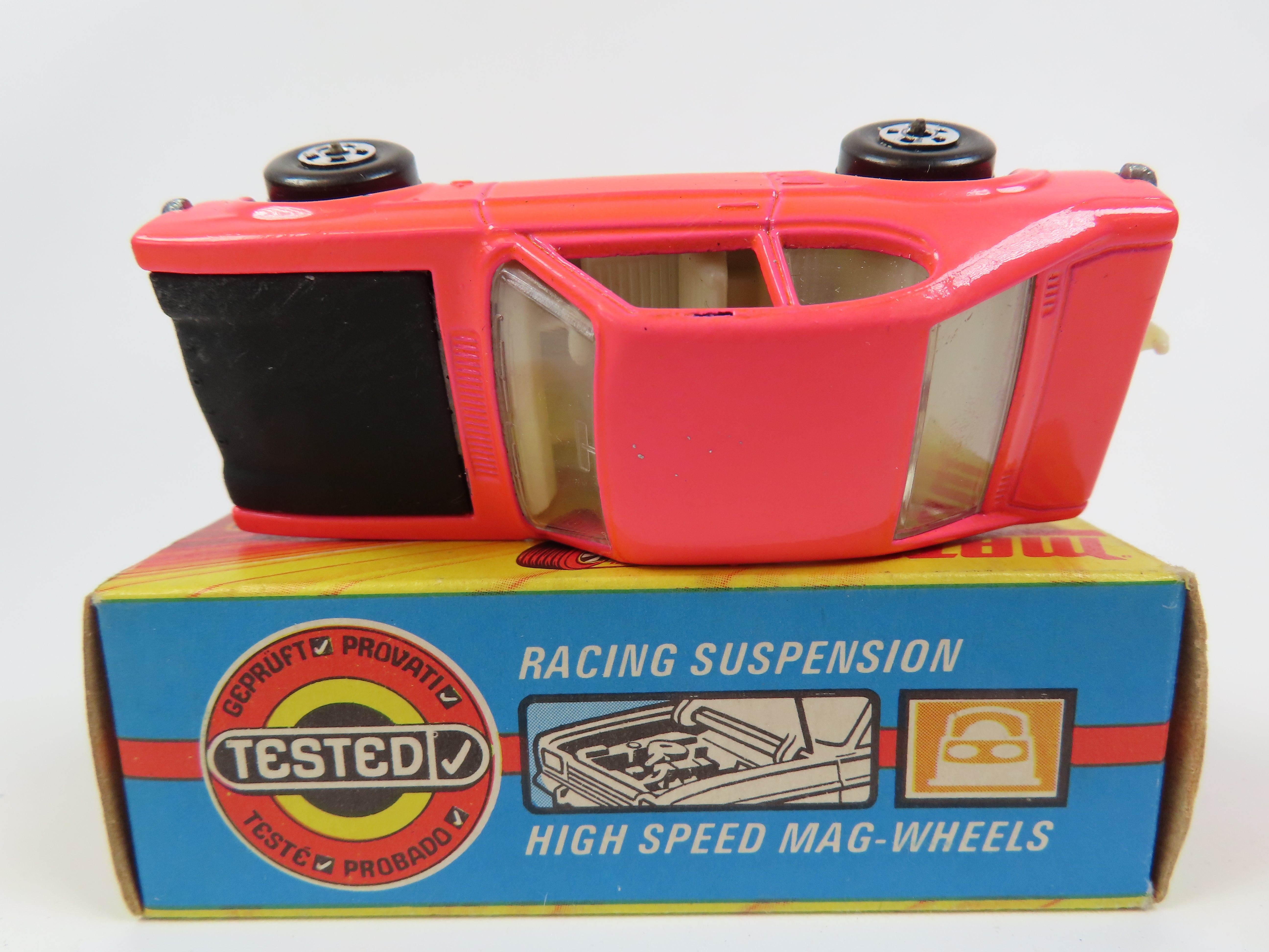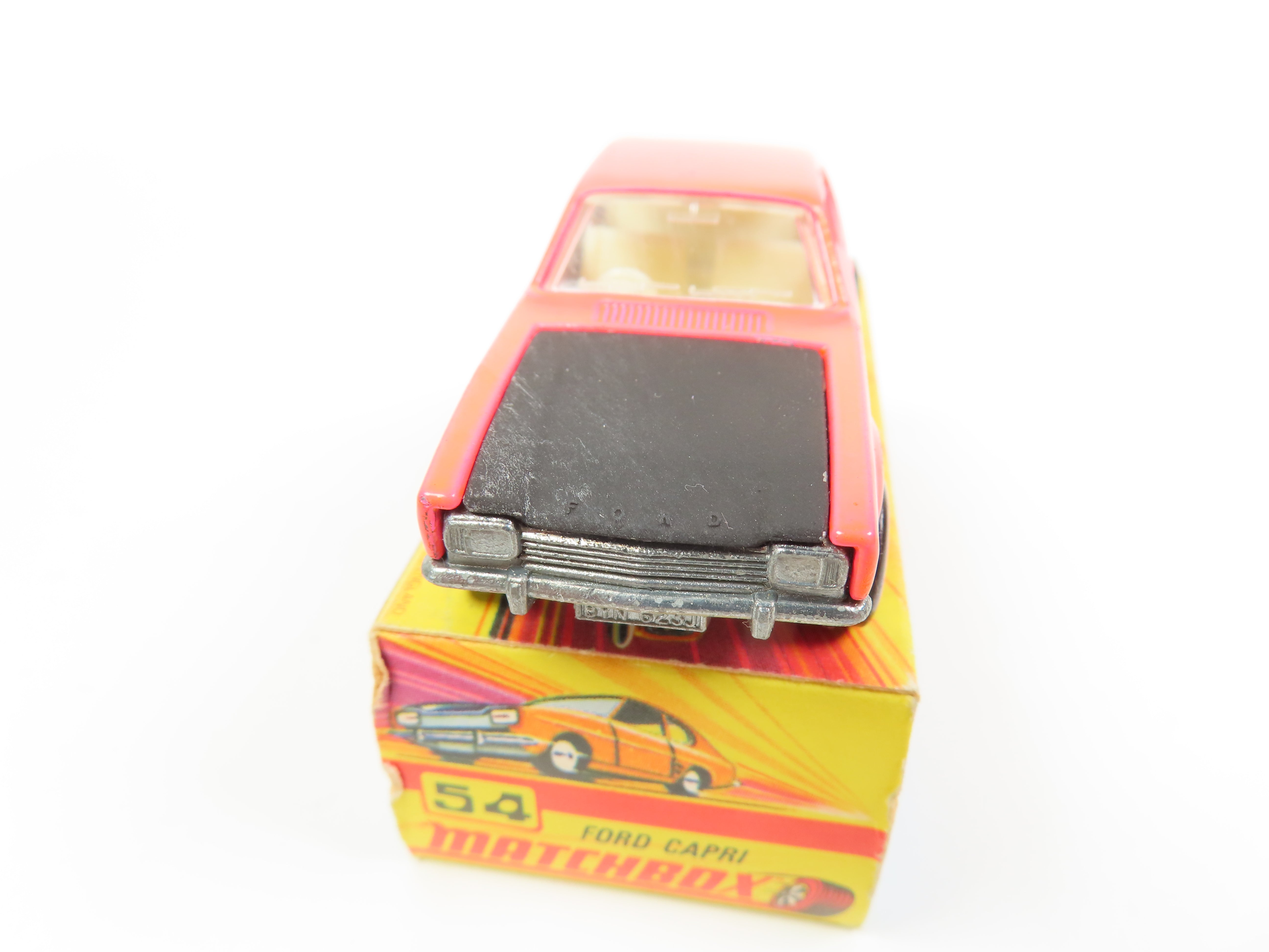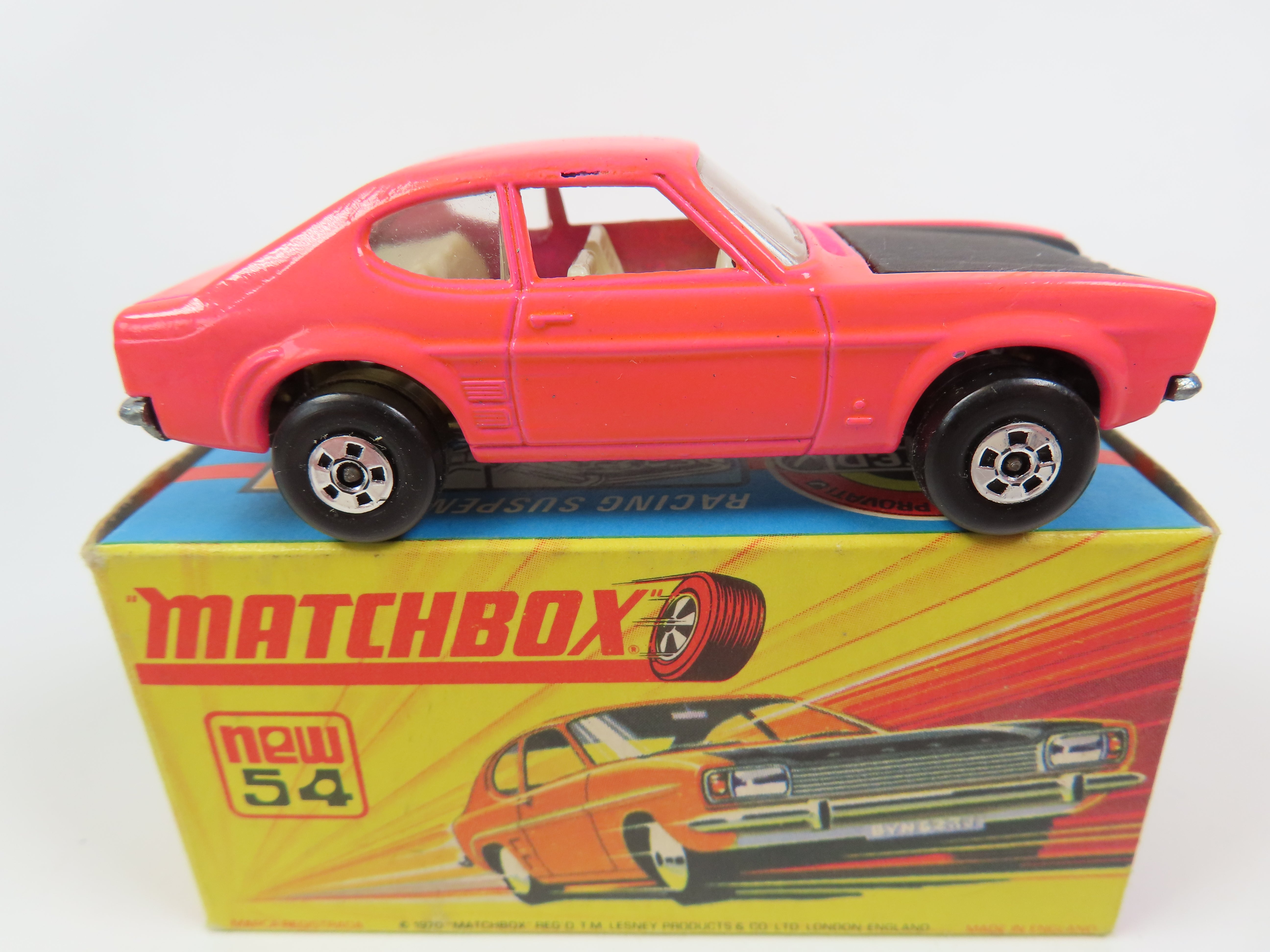 Matchbox 54 - Ford Capri in pink with black bonnet, cream hook and interior.