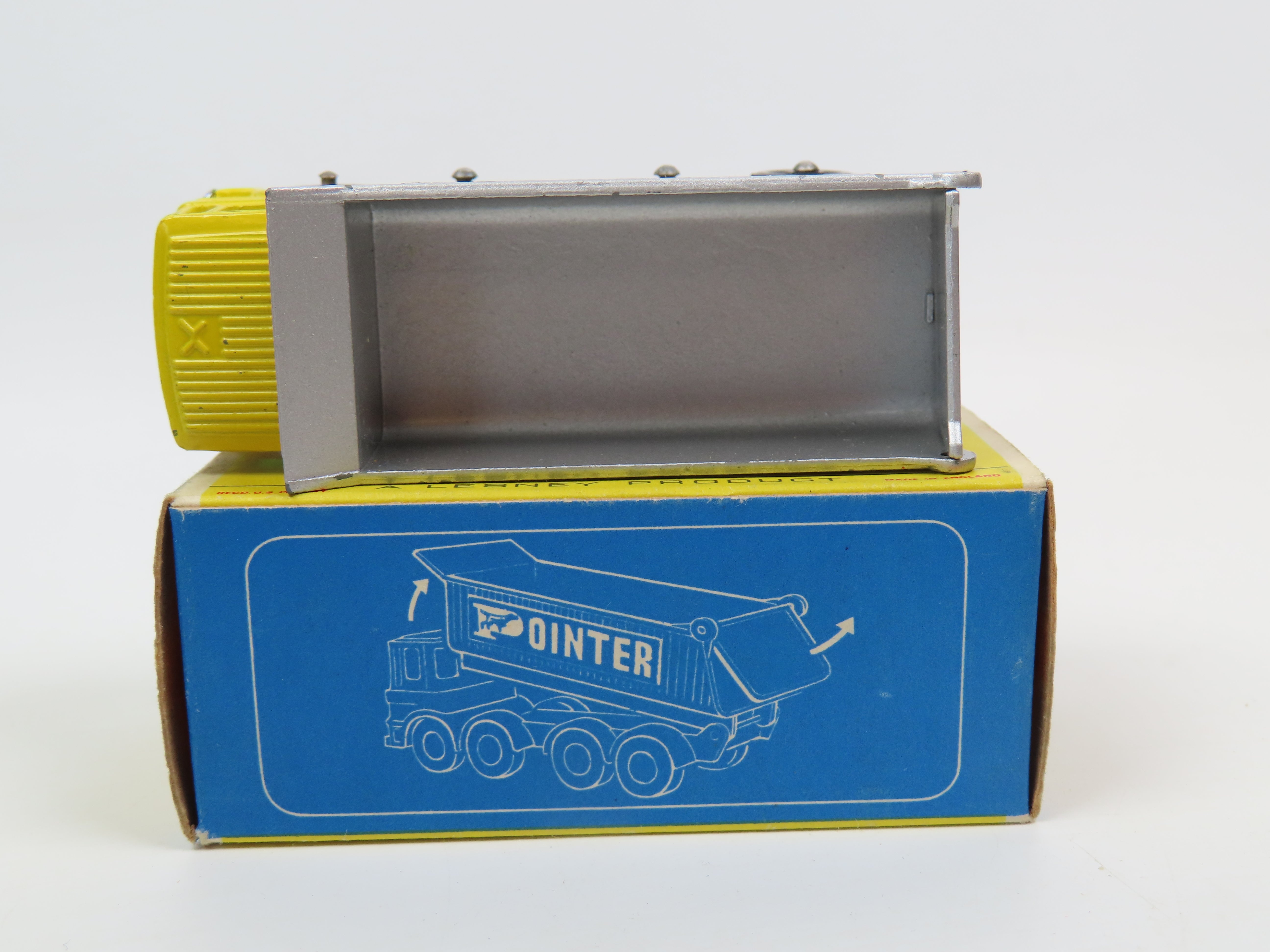 Matchbox 51 8 Wheel Tipper with a yellow cab and chassis, blue tinted windows and silver tipper with 'Pointer' decals to each side.