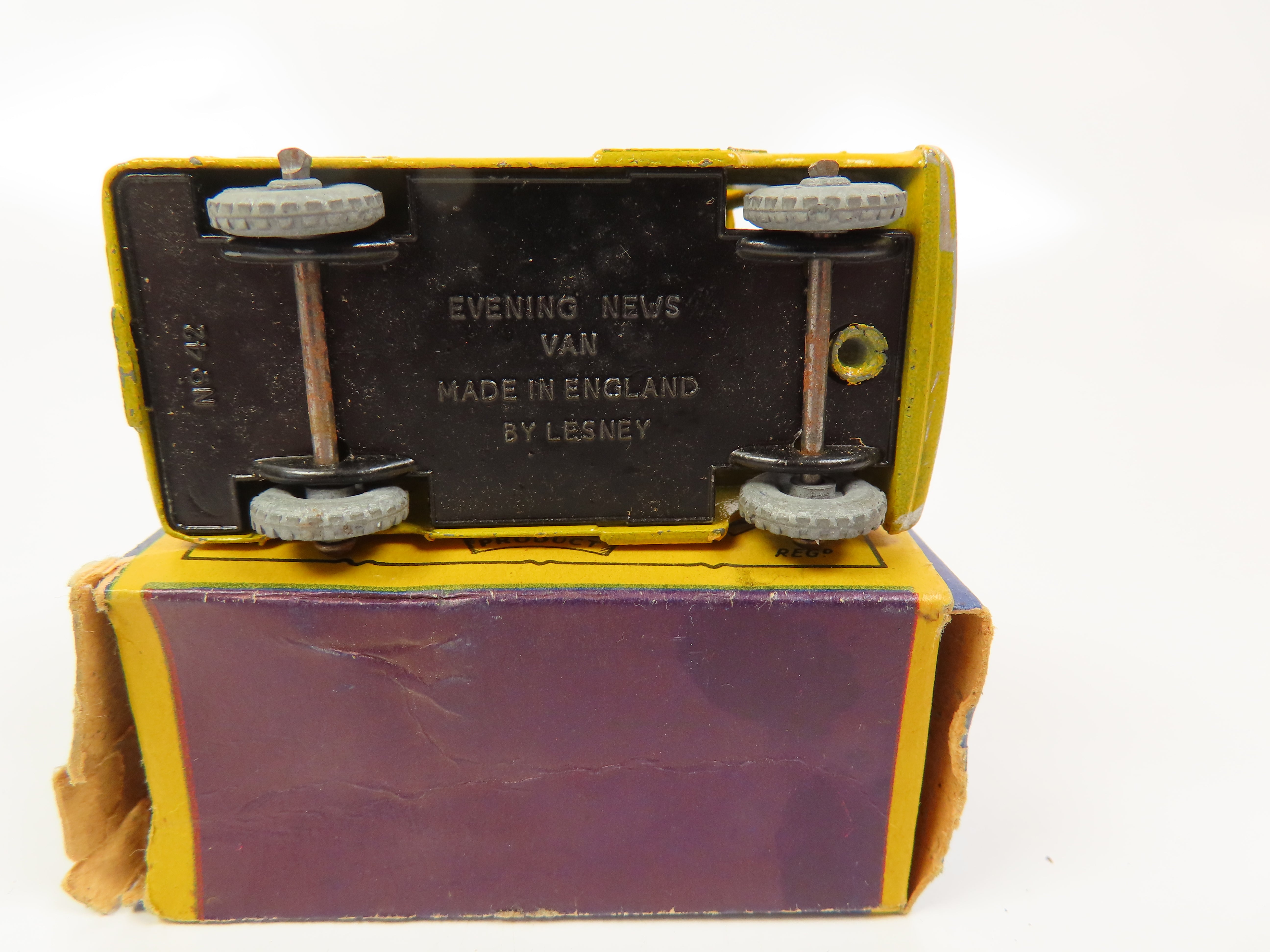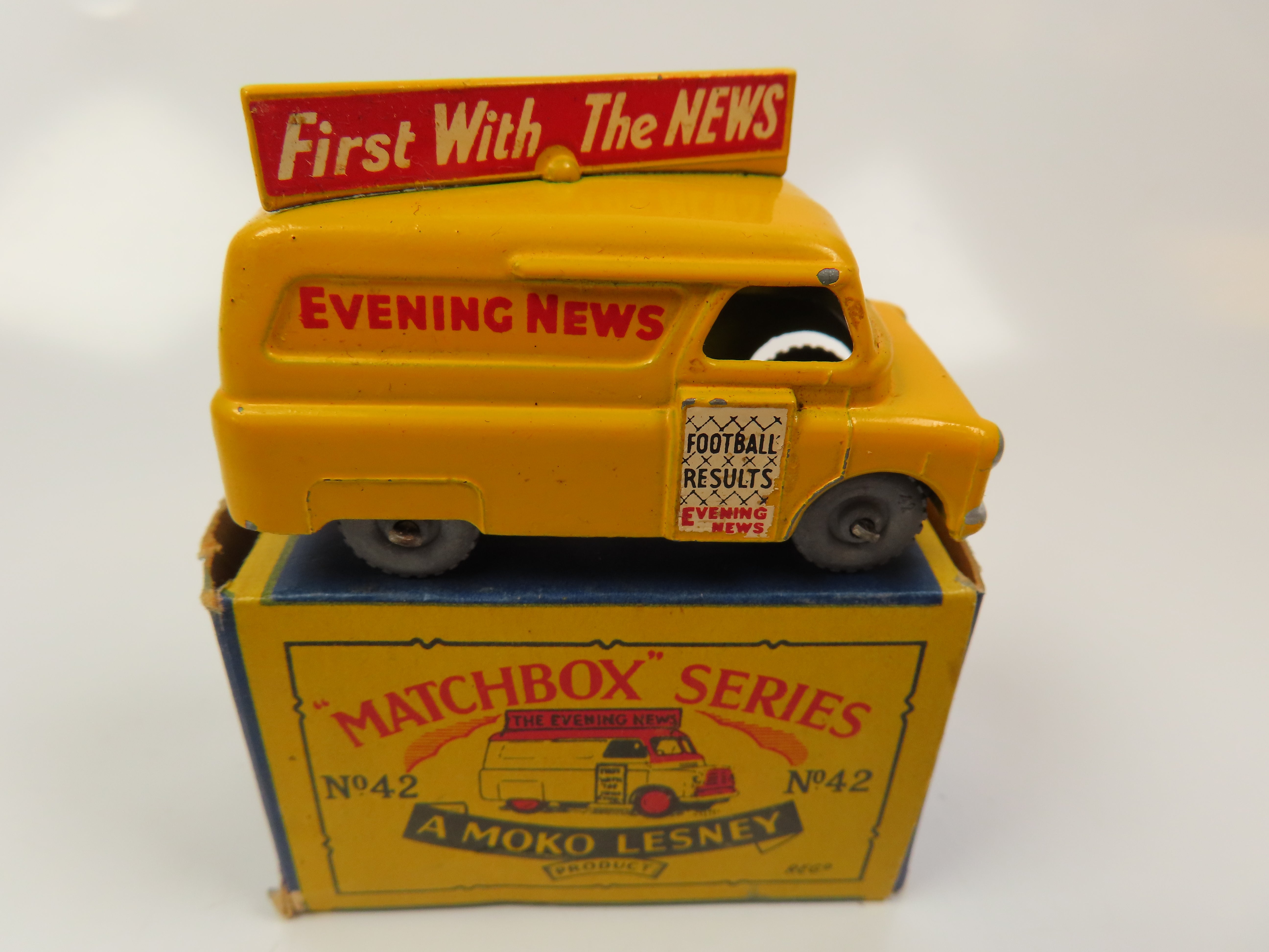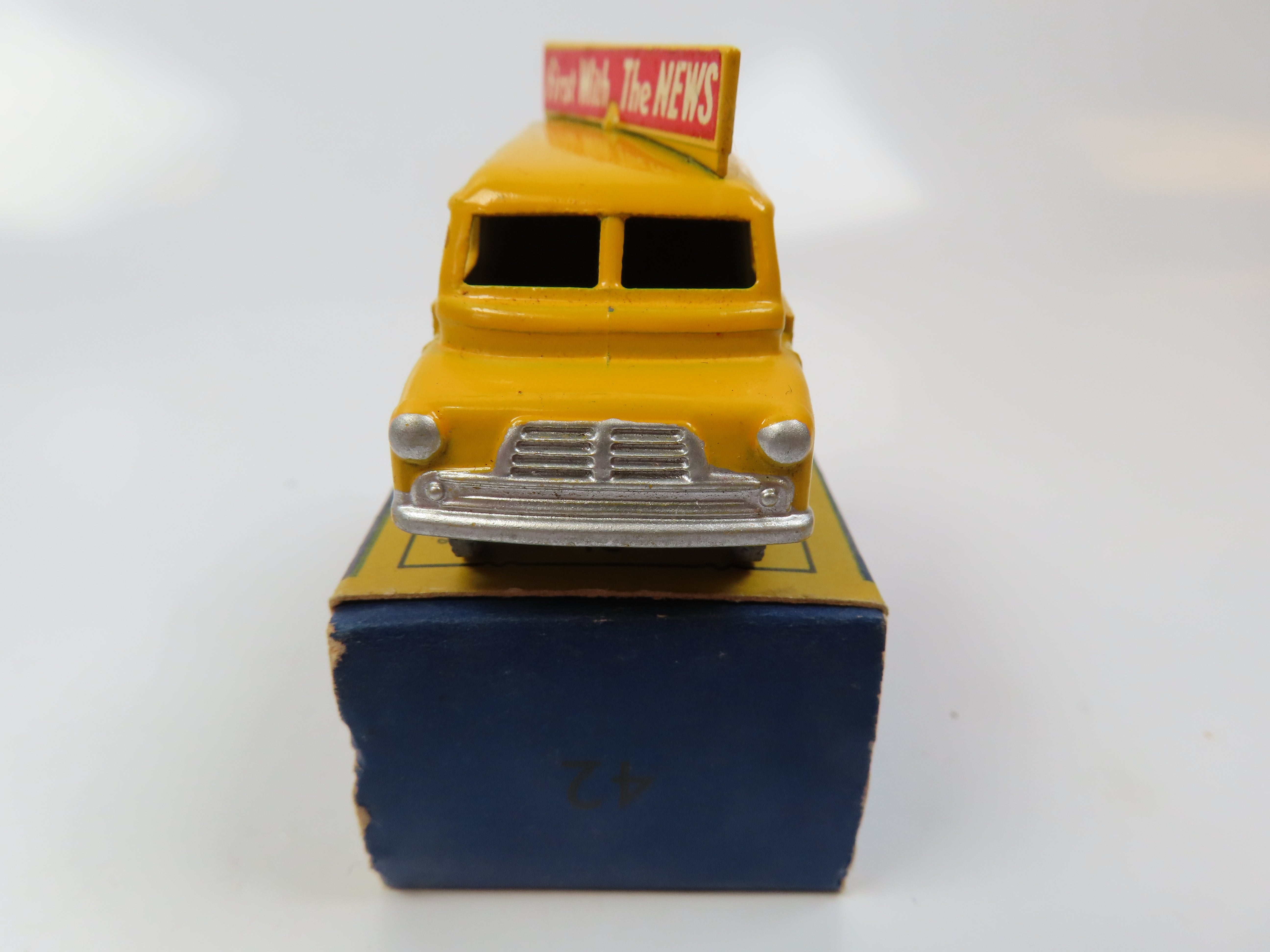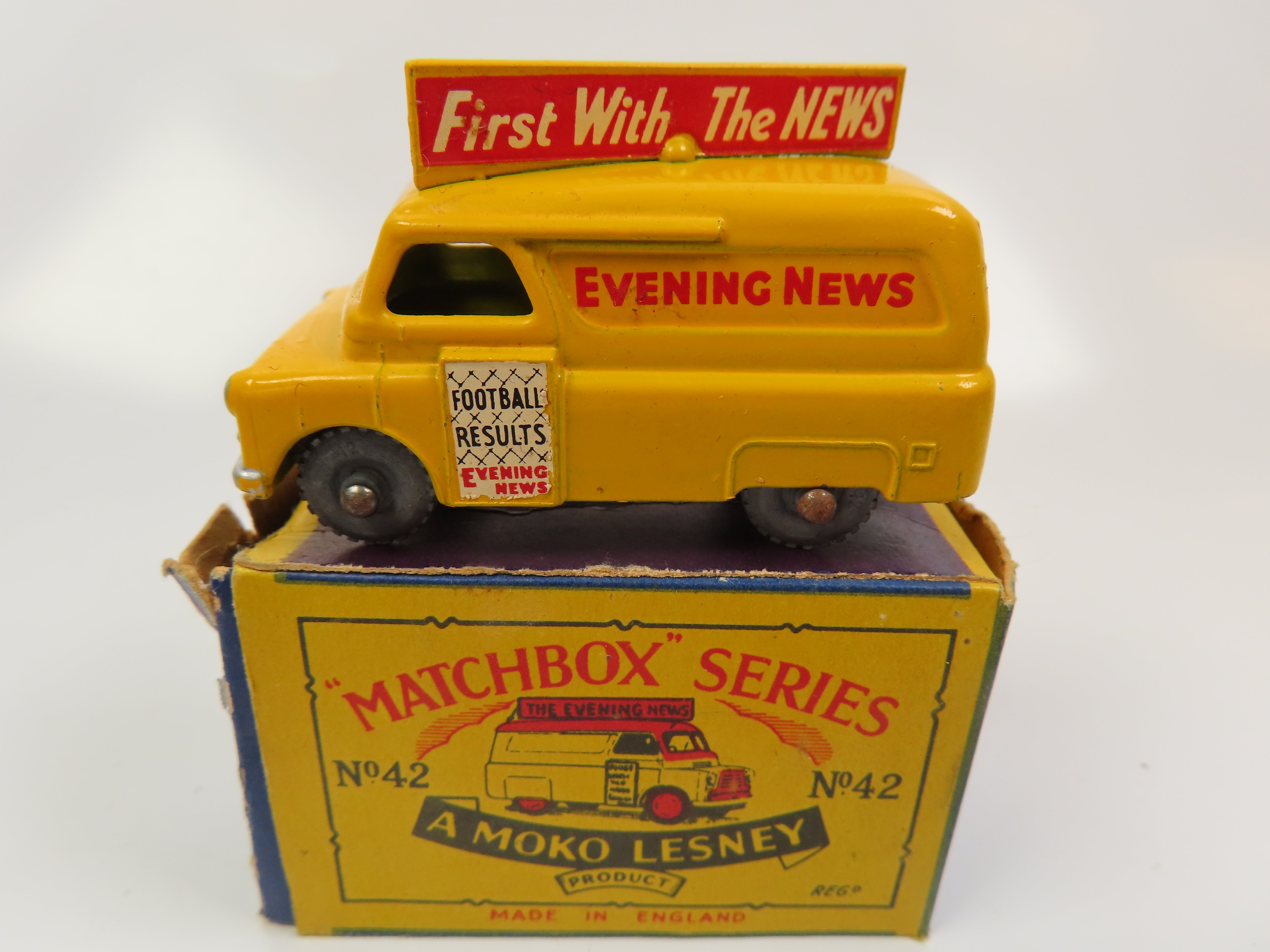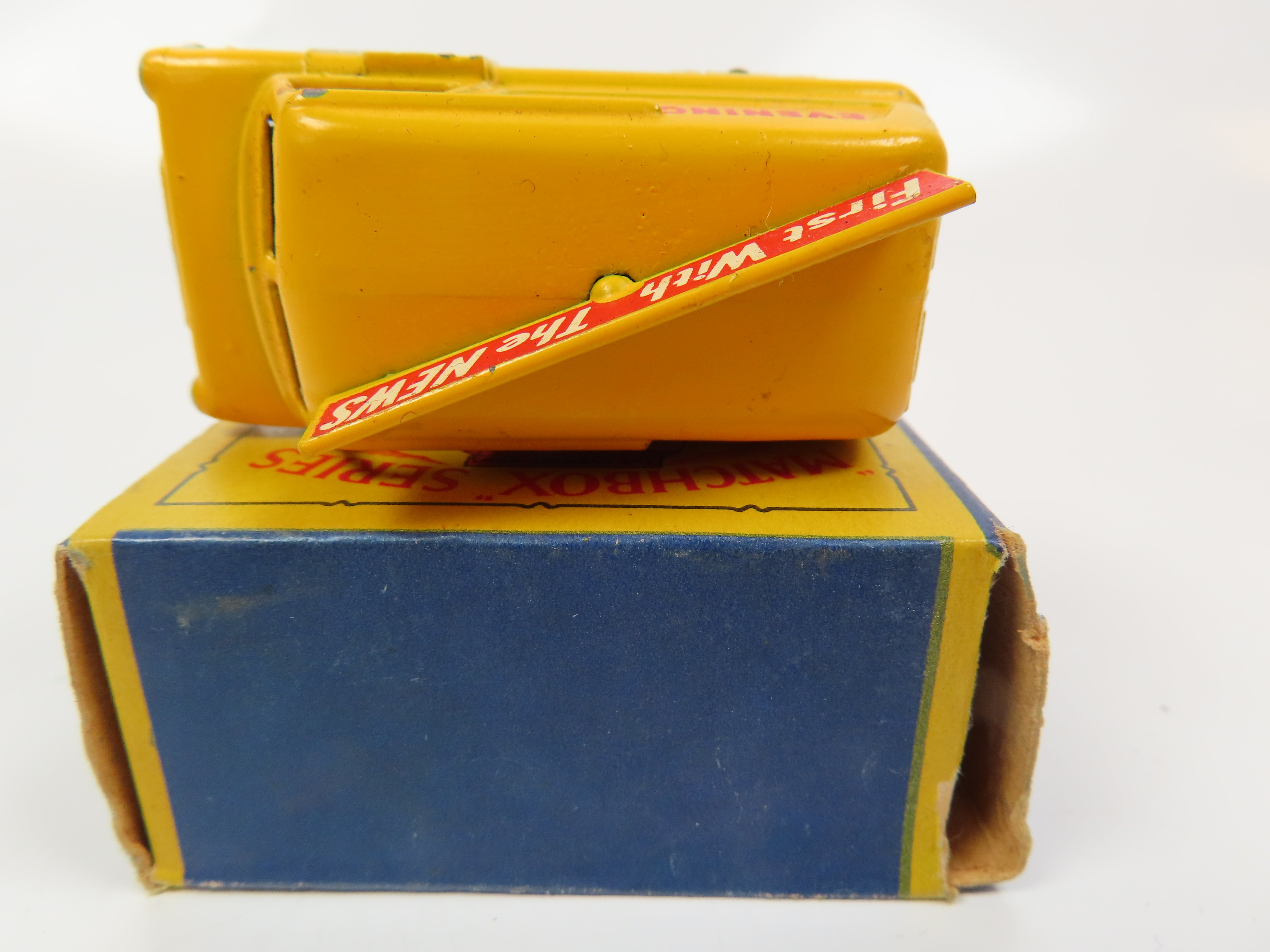 Matchbox 42a - Evening News Van in yellow with red/white transfers. Grey metal wheels.