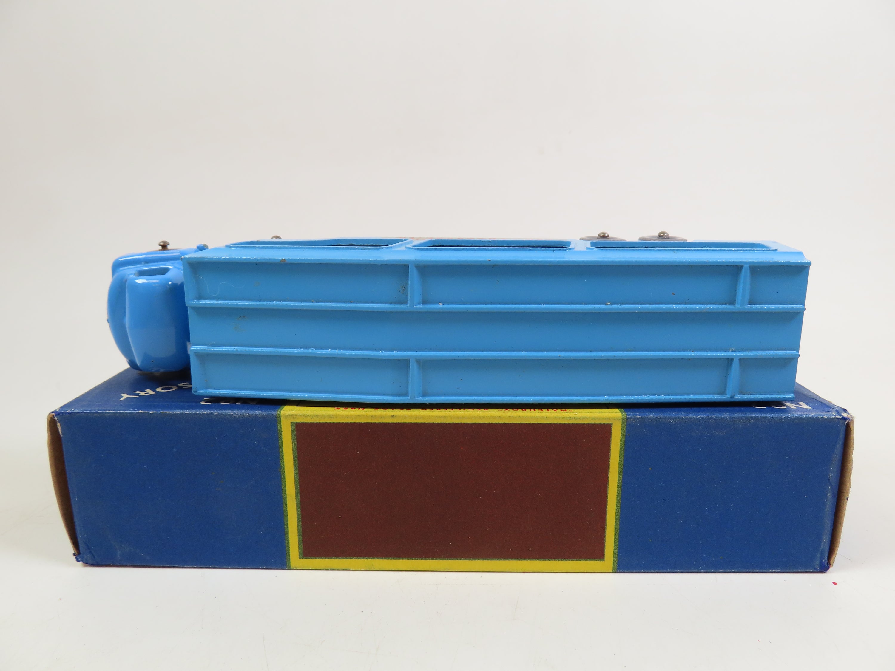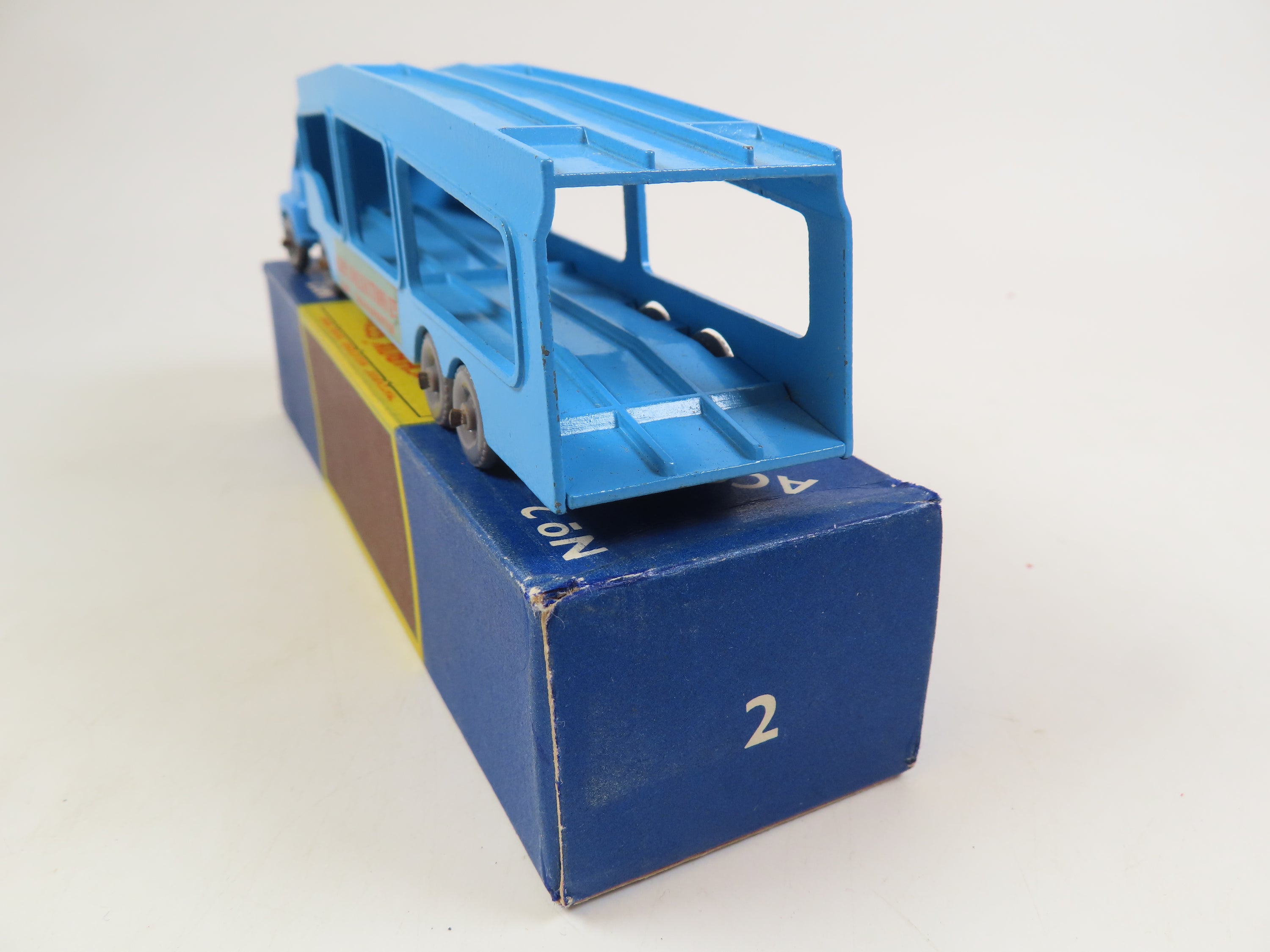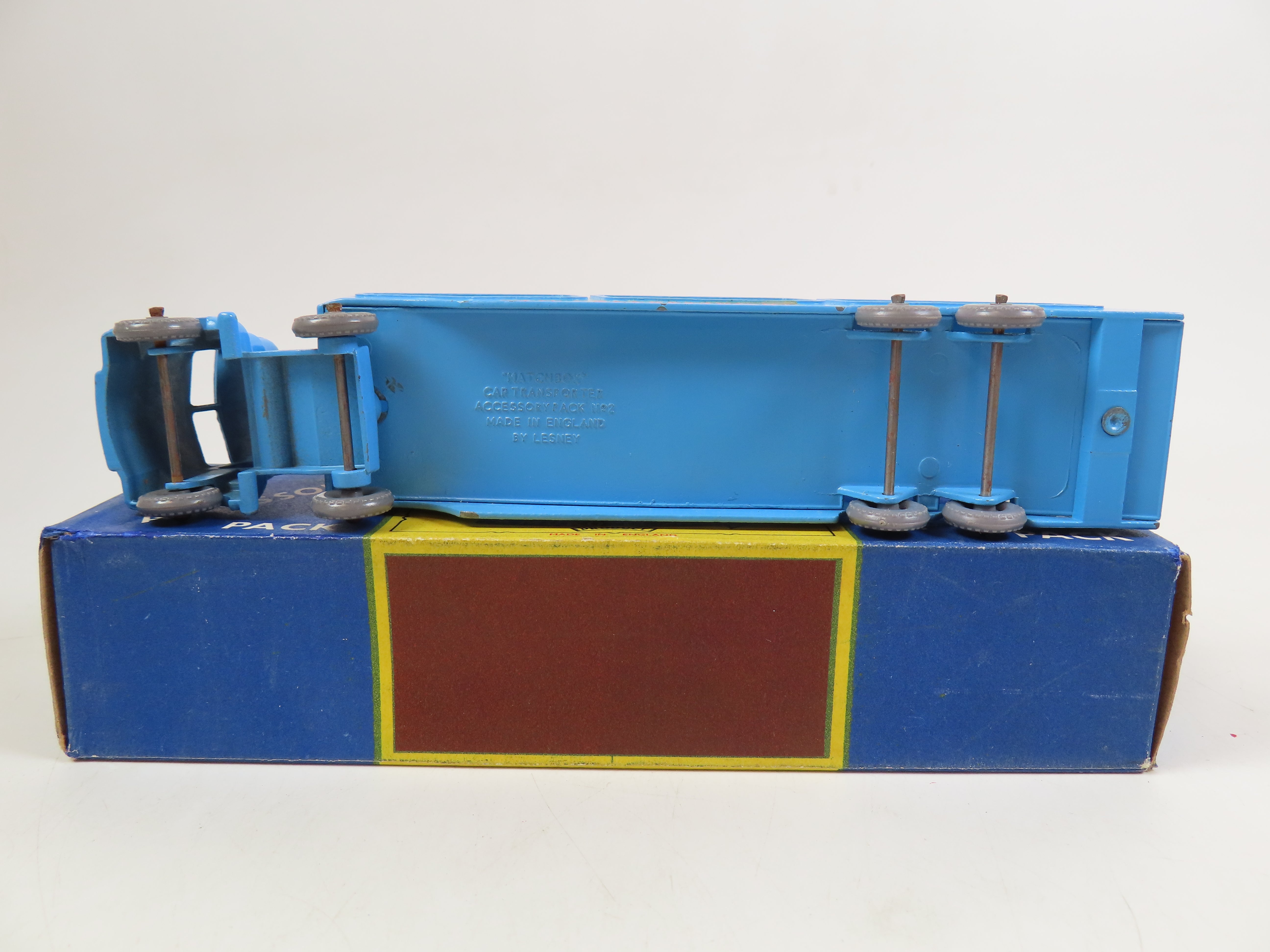 Matchbox Series No.2 Accessory Pack Car Transporter in light blue with 'Car Collection Ltd Car Transporter' transfers to each side and grey plastic wheels. Scarce version with grey plastic wheels and red writing.