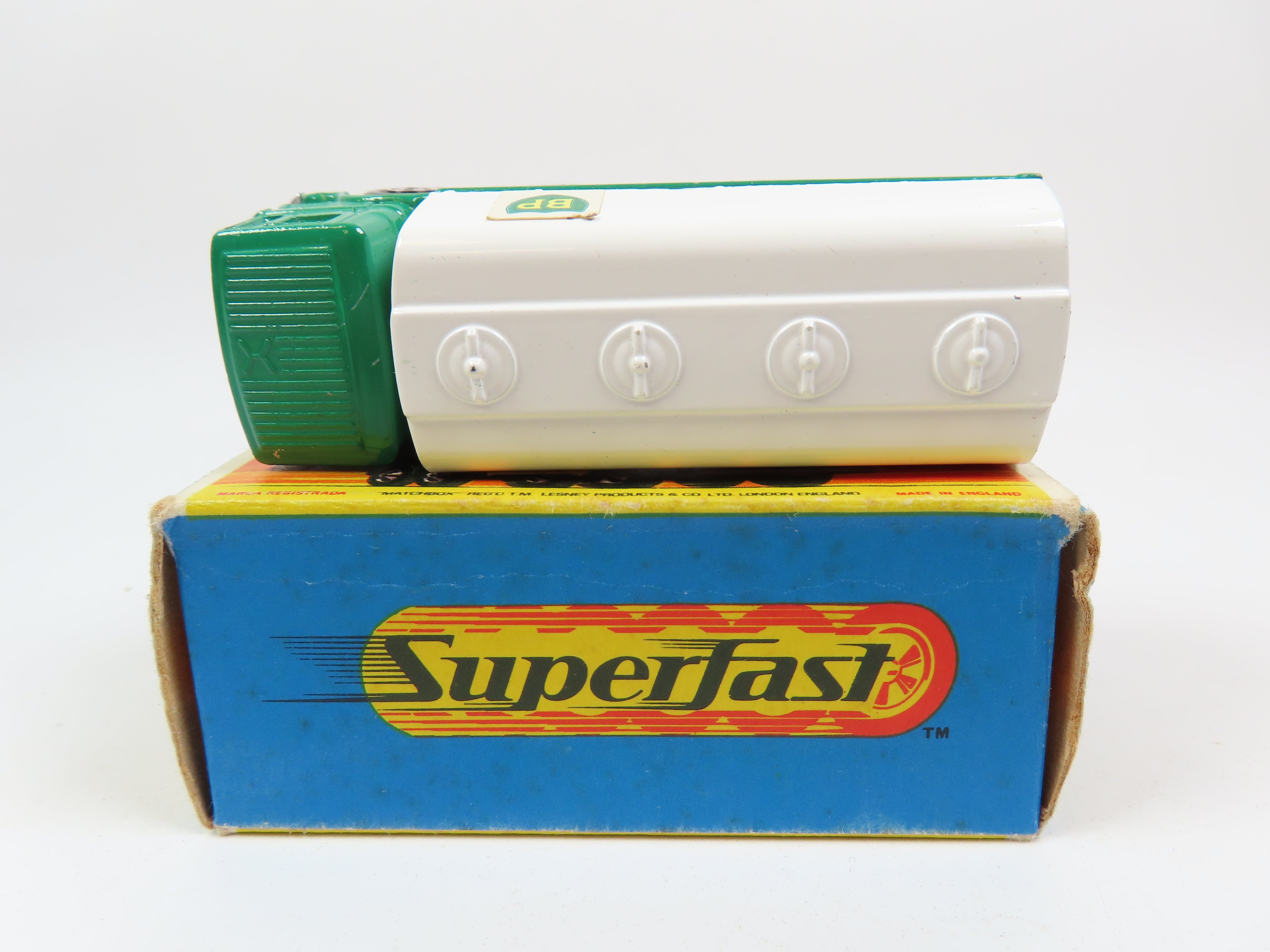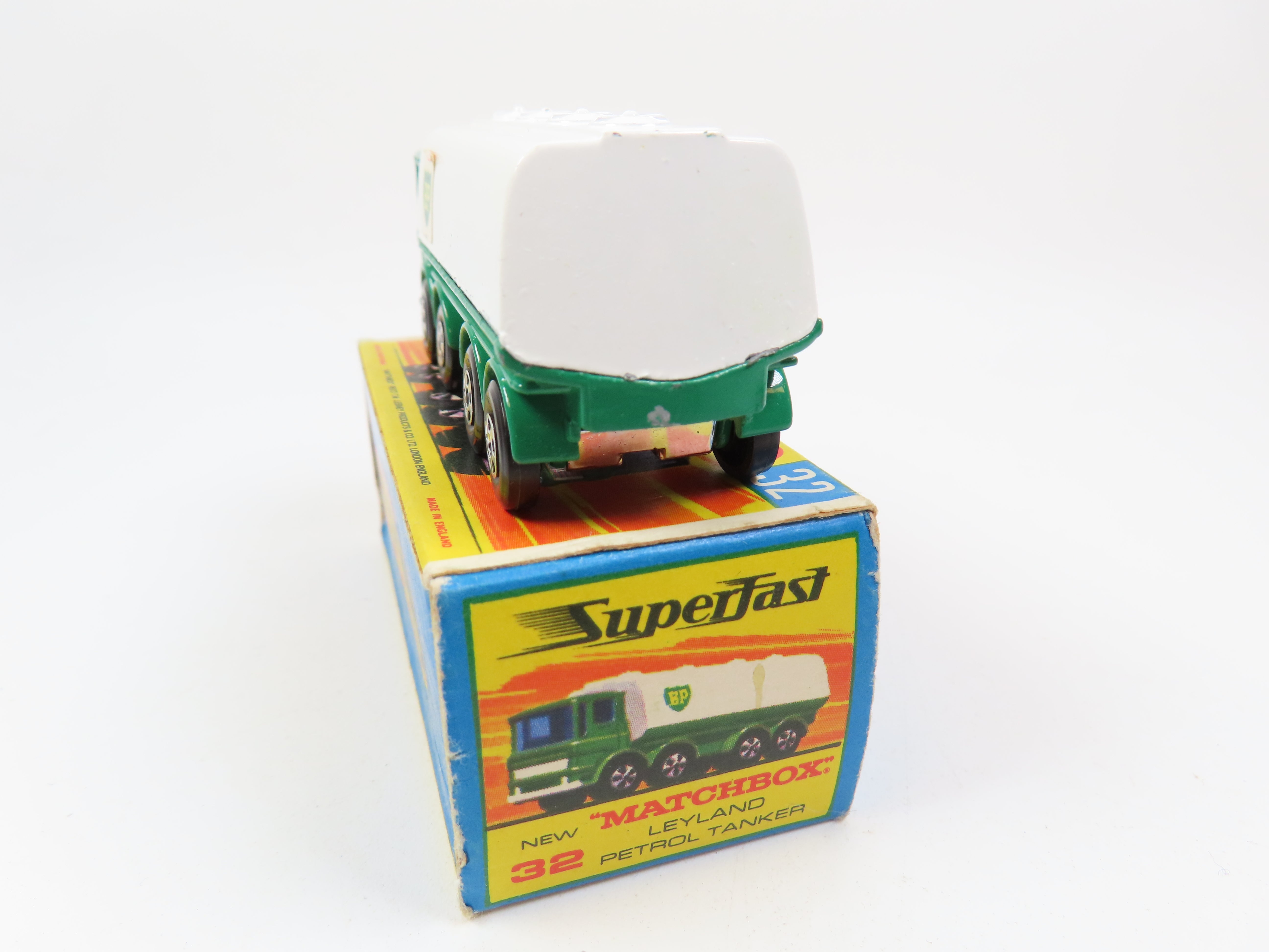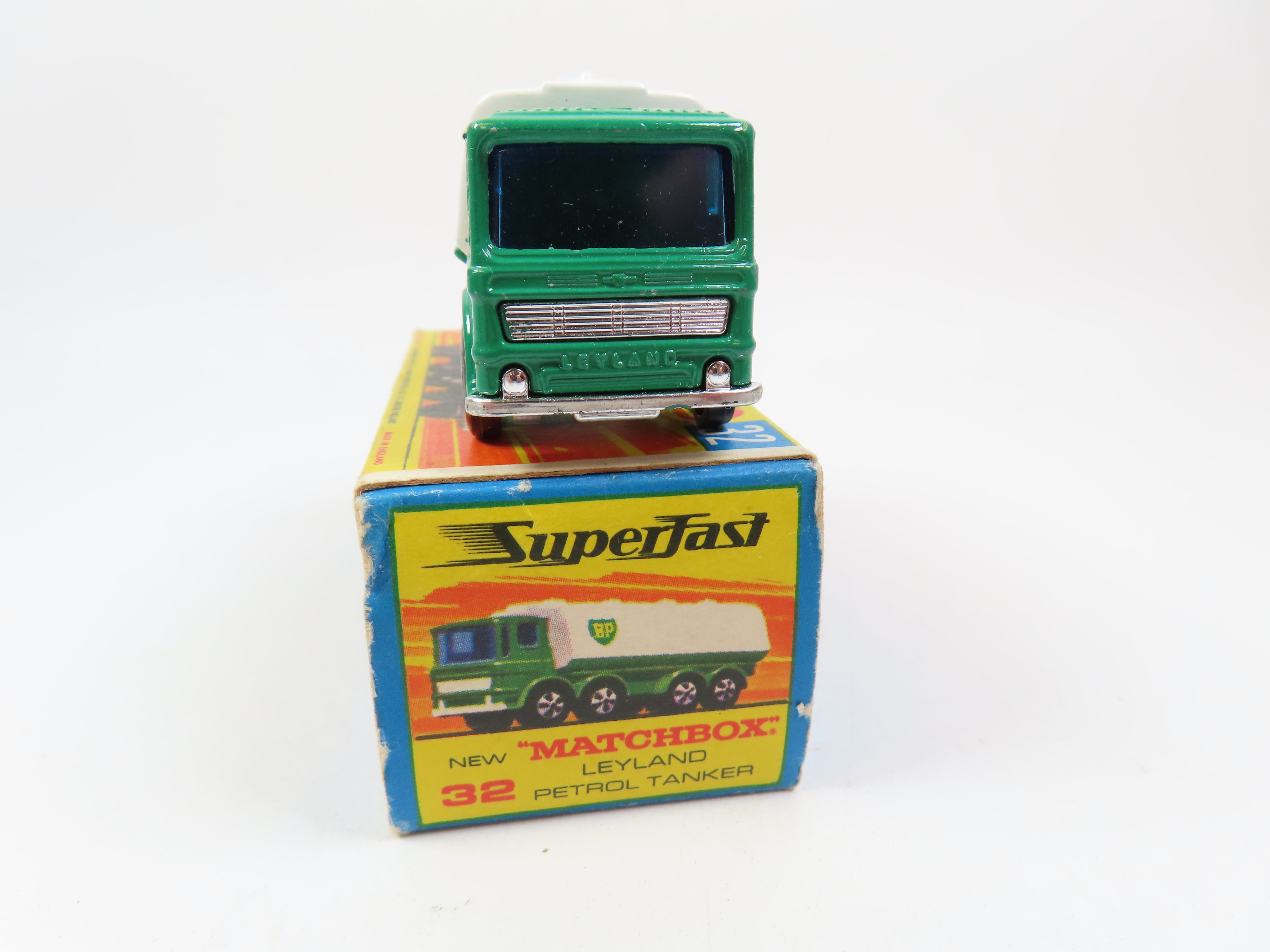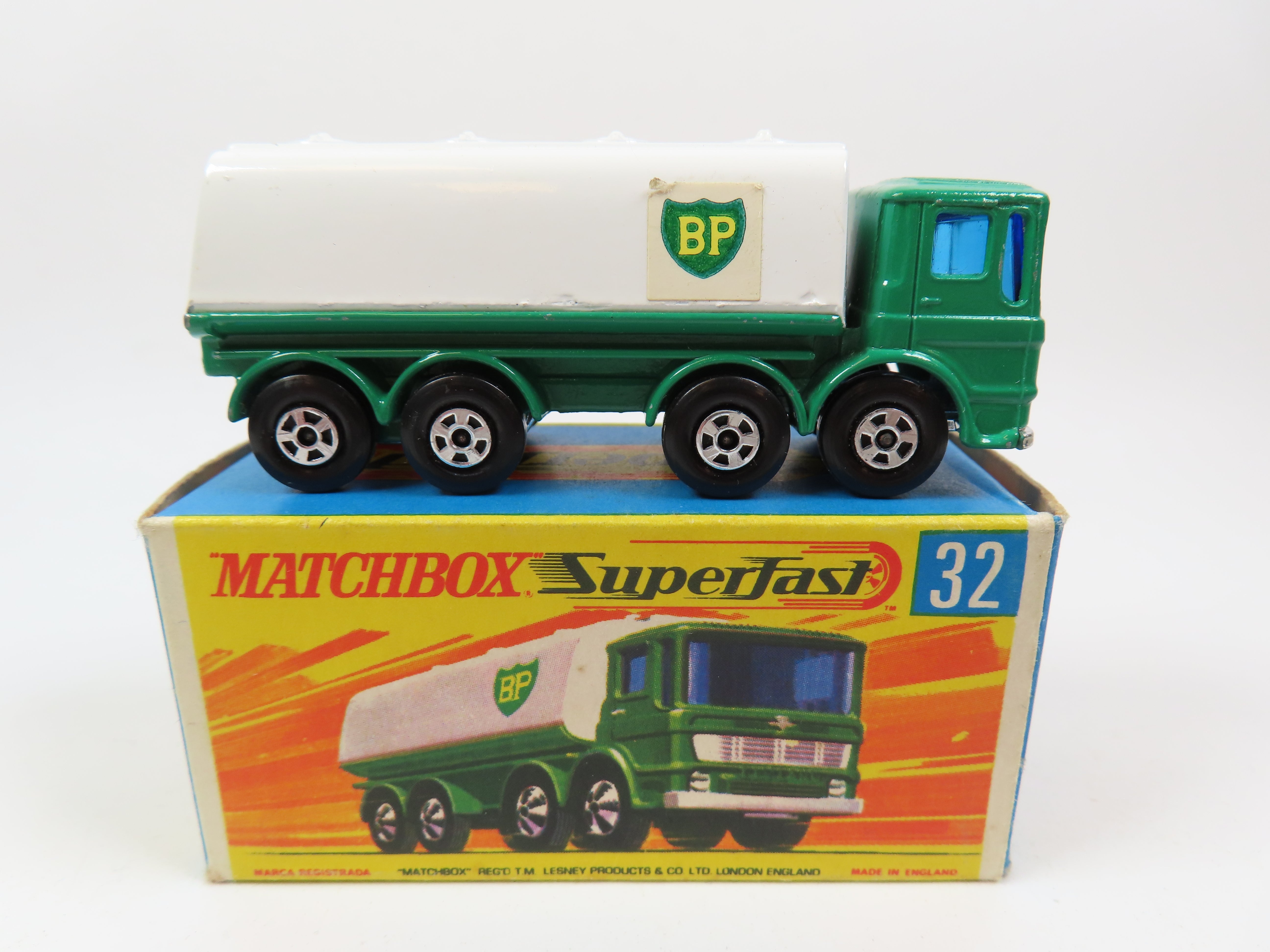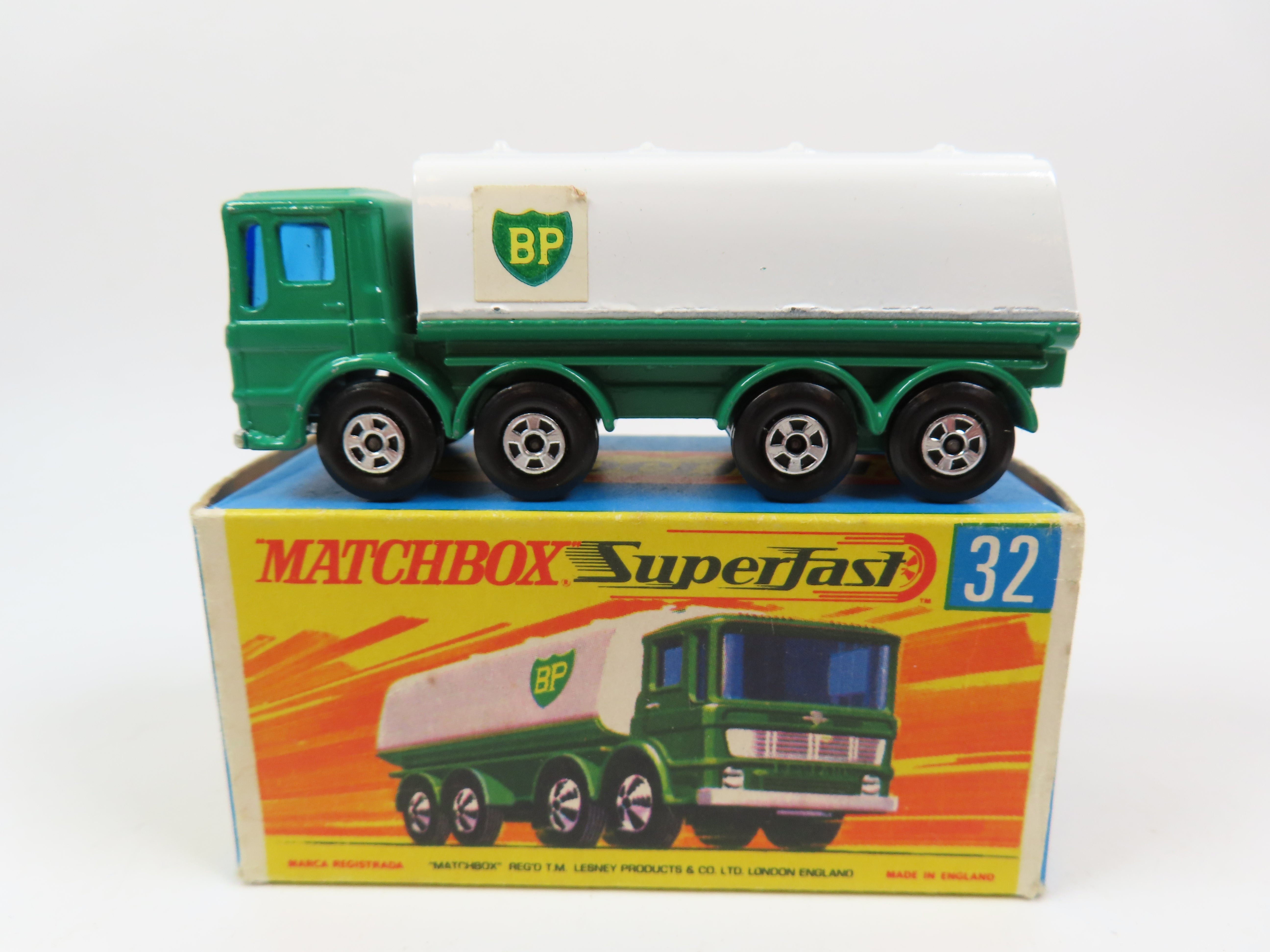 Matchbox Superfast 32 Leyland Petrol Tanker with a green cab and chassis, with blue tinted windows and white tanker with 'BP' decals to each side. Black plastic wheels.