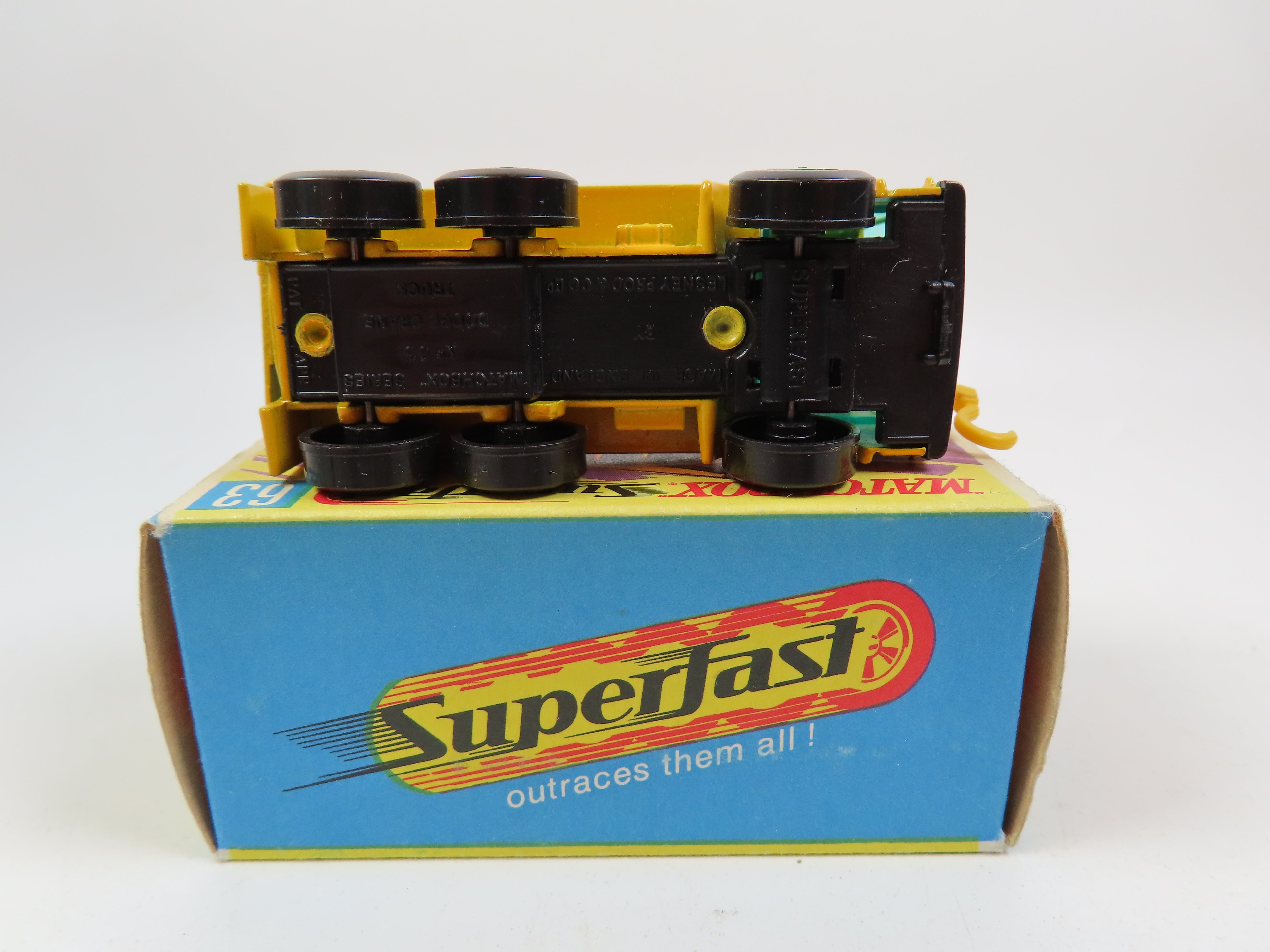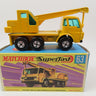 Matchbox Superfast 63 Dodge Crane Truck in dark yellow, with blue tinted windows and black plastic wheels.