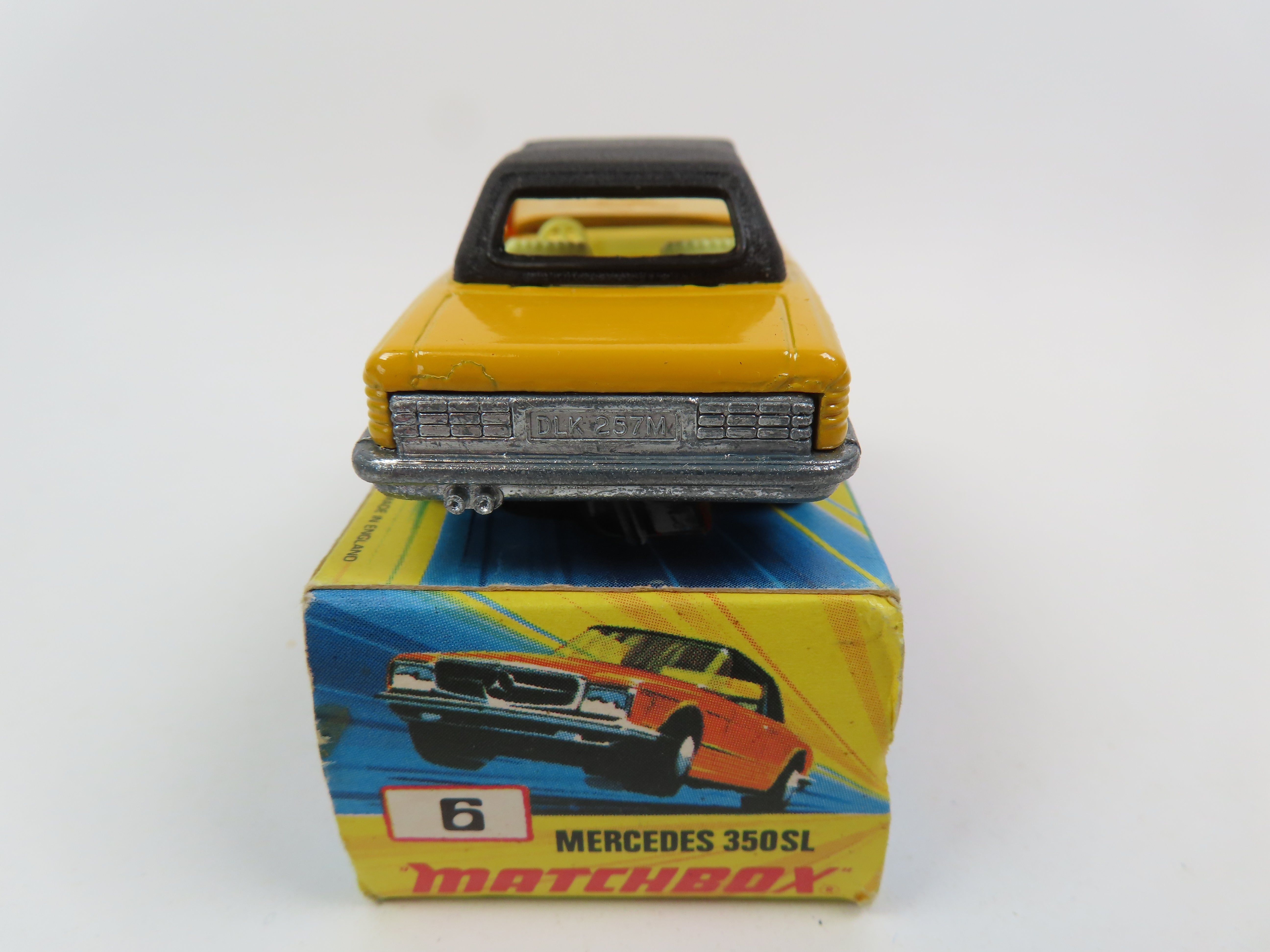Matchbox Superfast 6 Mercedes 350SL in yellow with black hood, cream interior and orange tinted front windscreen.