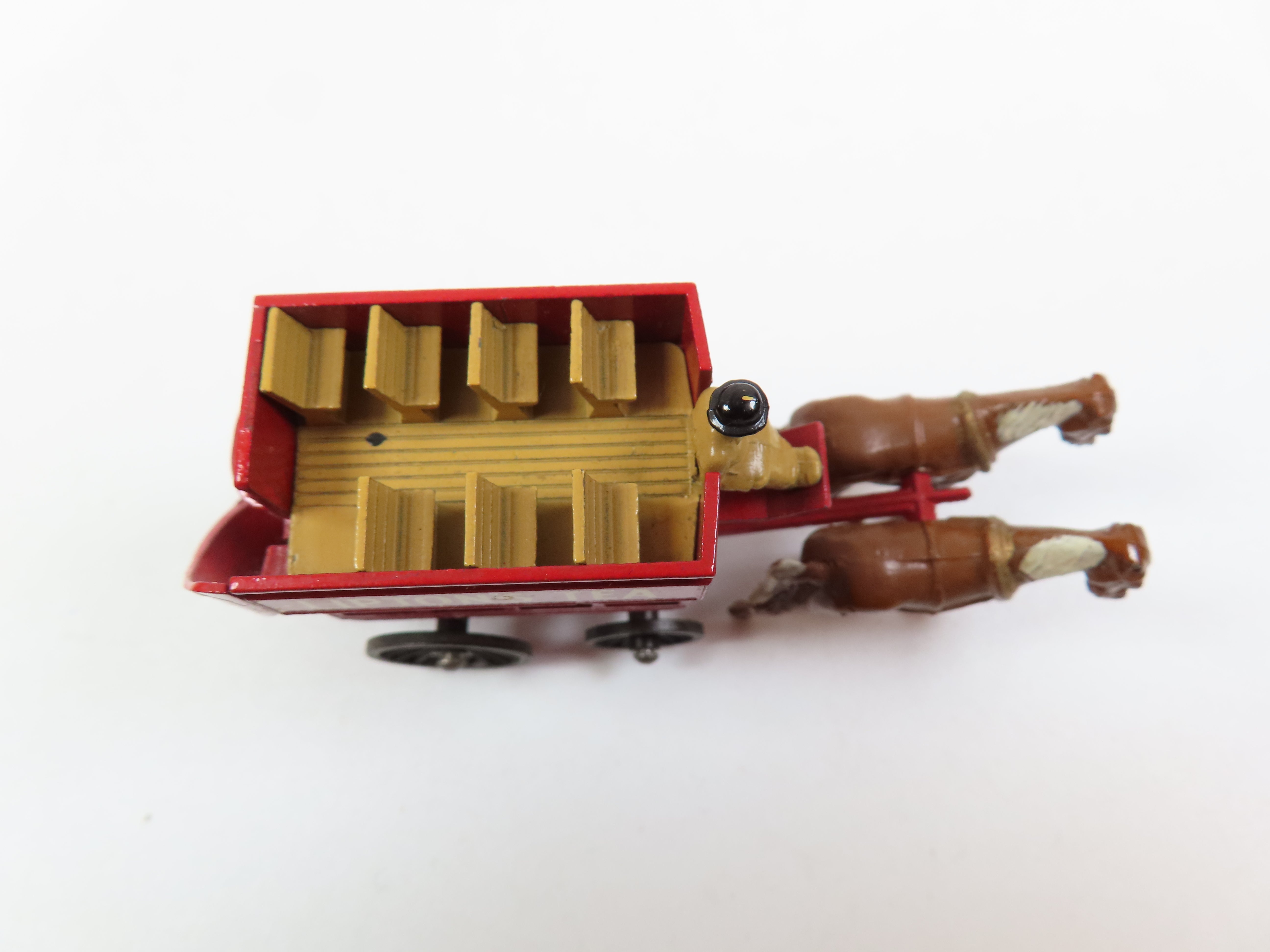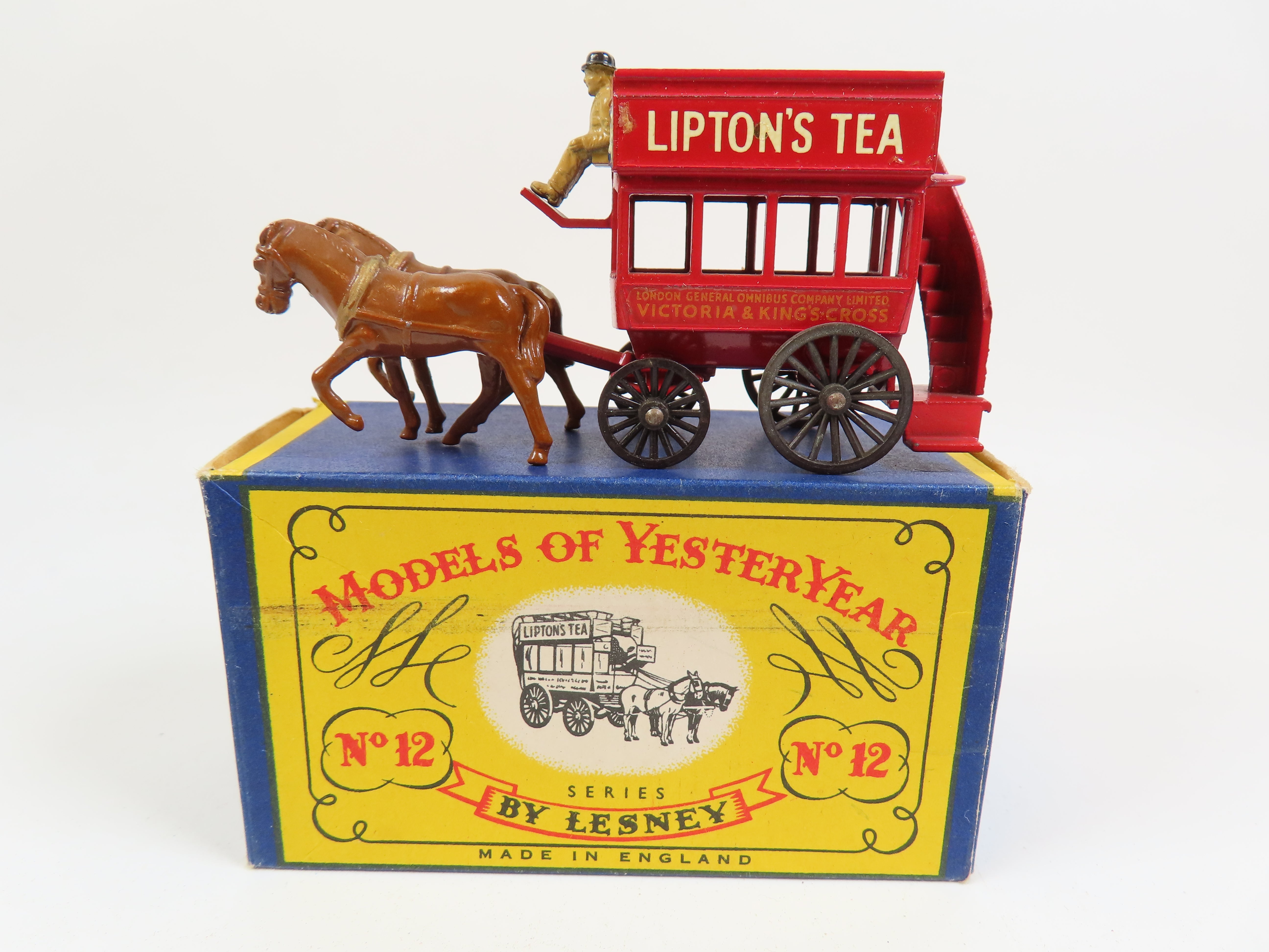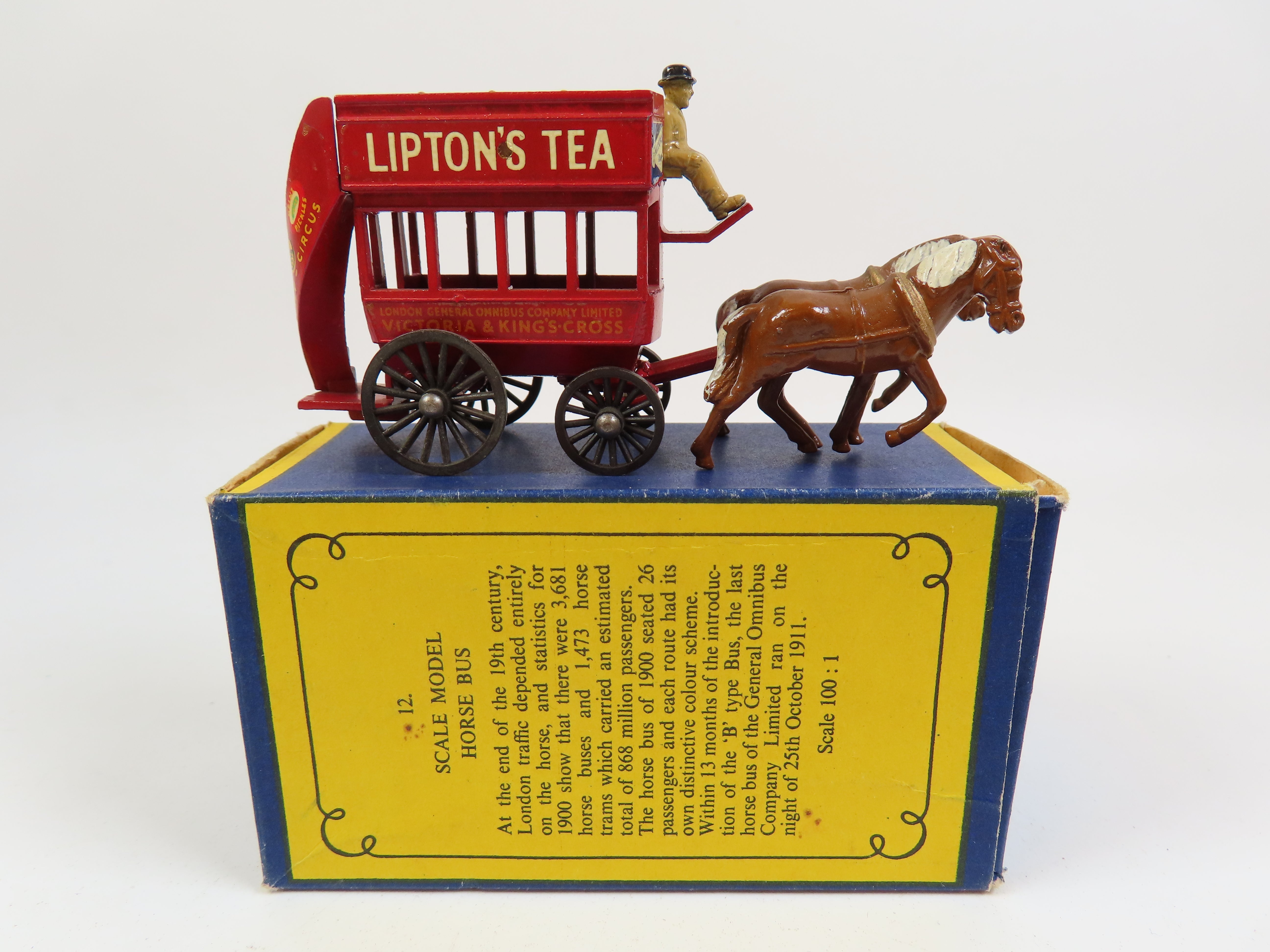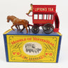 Matchbox Yesteryear No.12 Horse Bus in red with tan driver, brown Horses and 'Lipton's Tea' decals to each side.