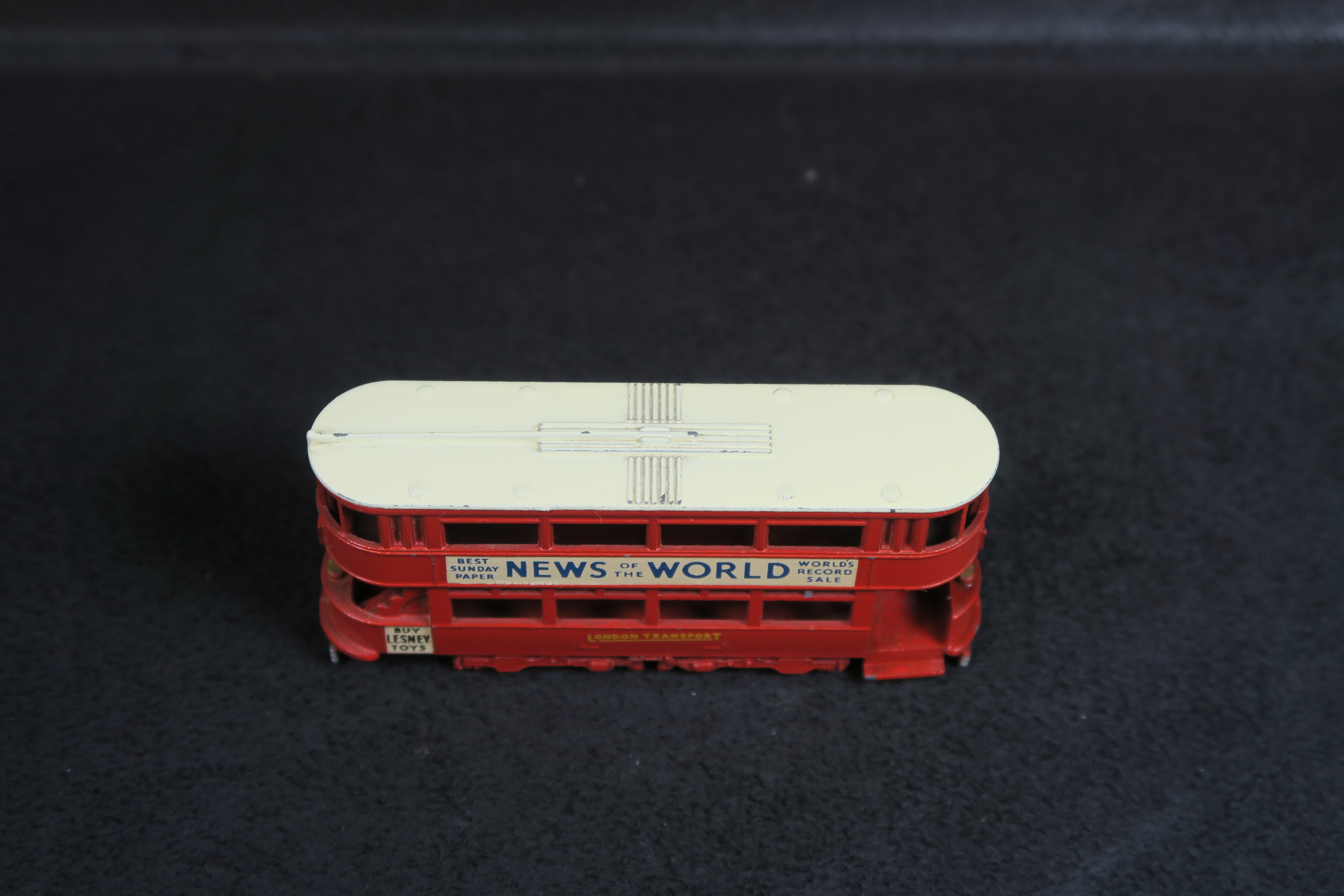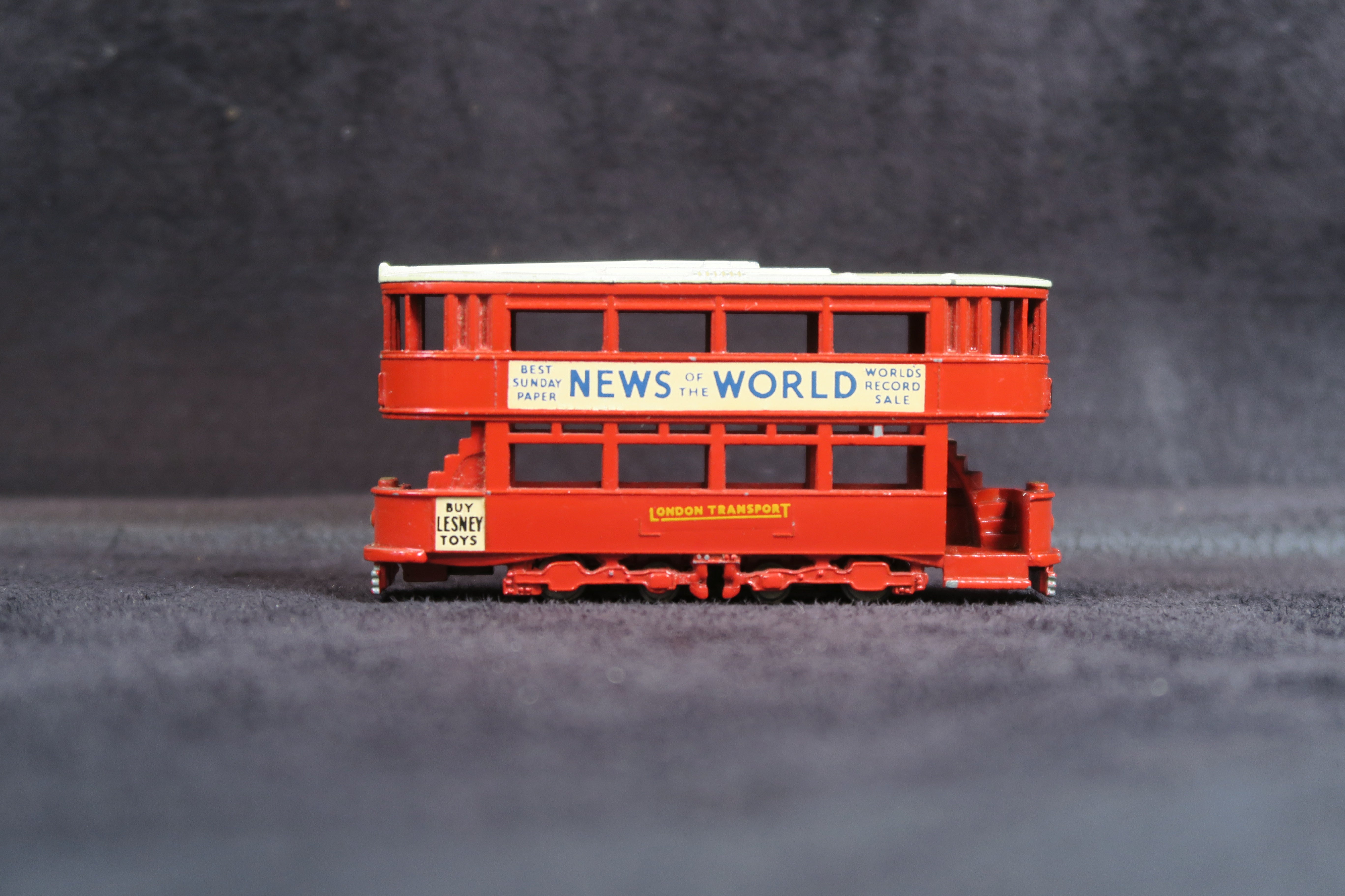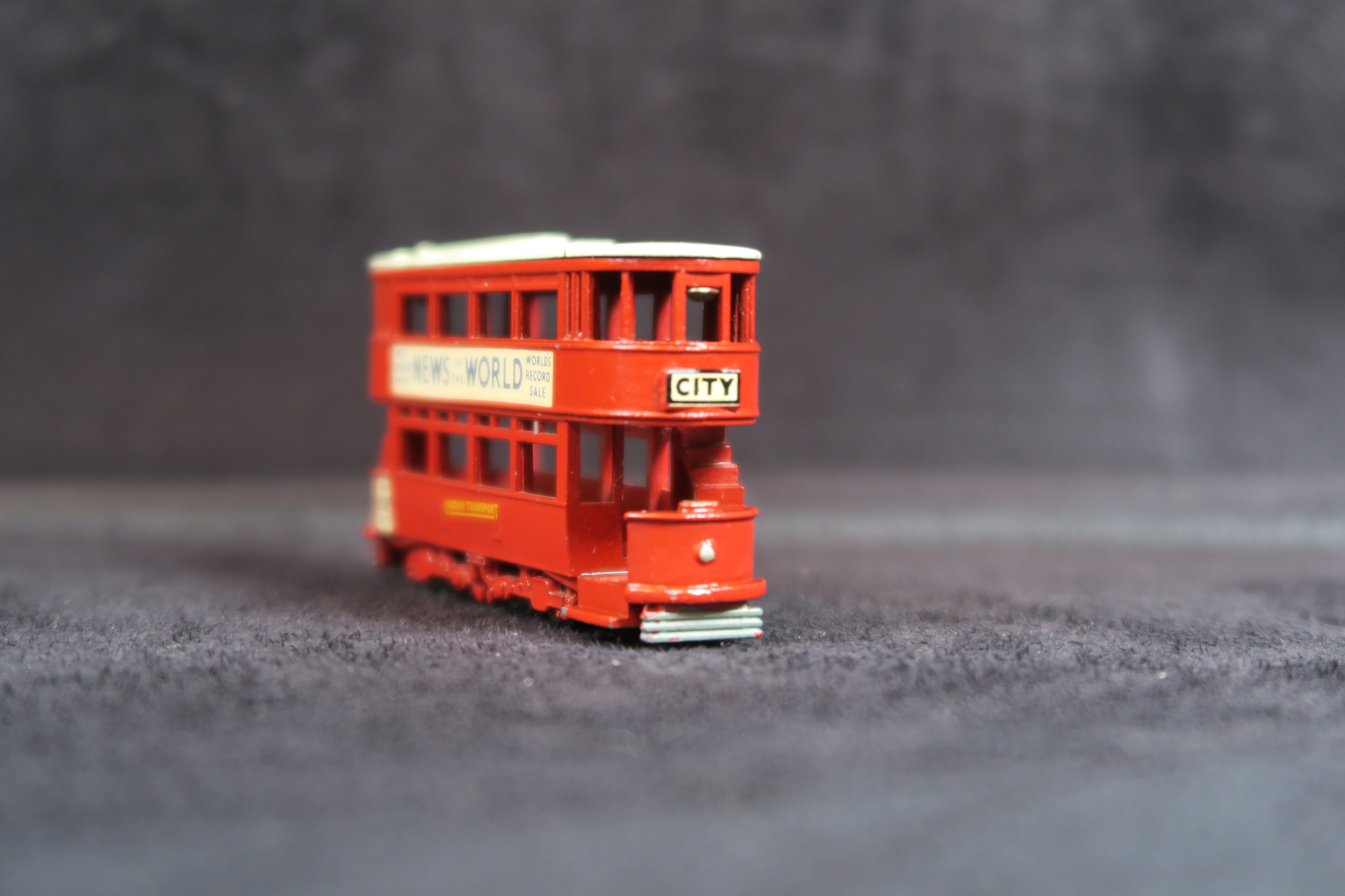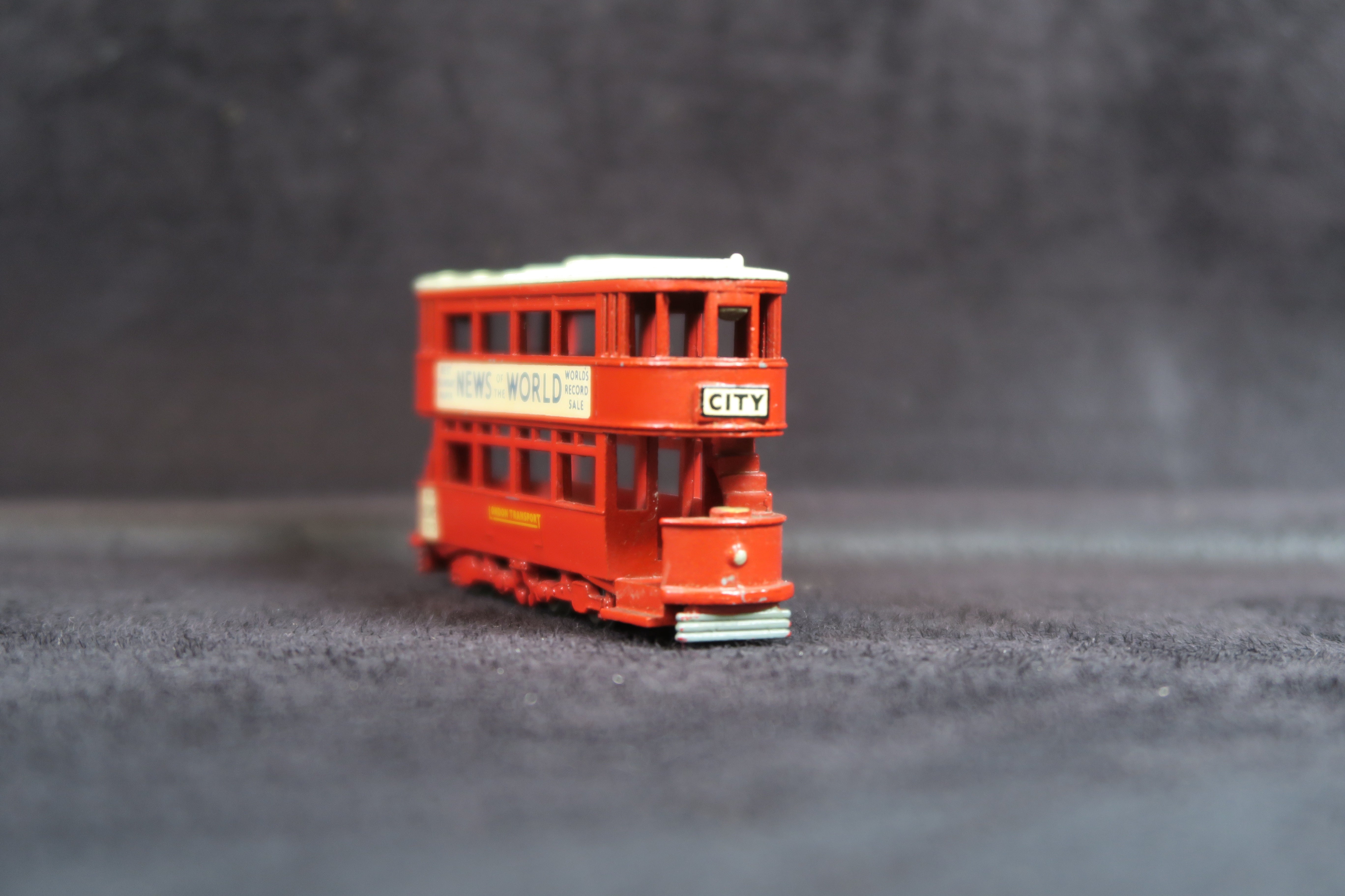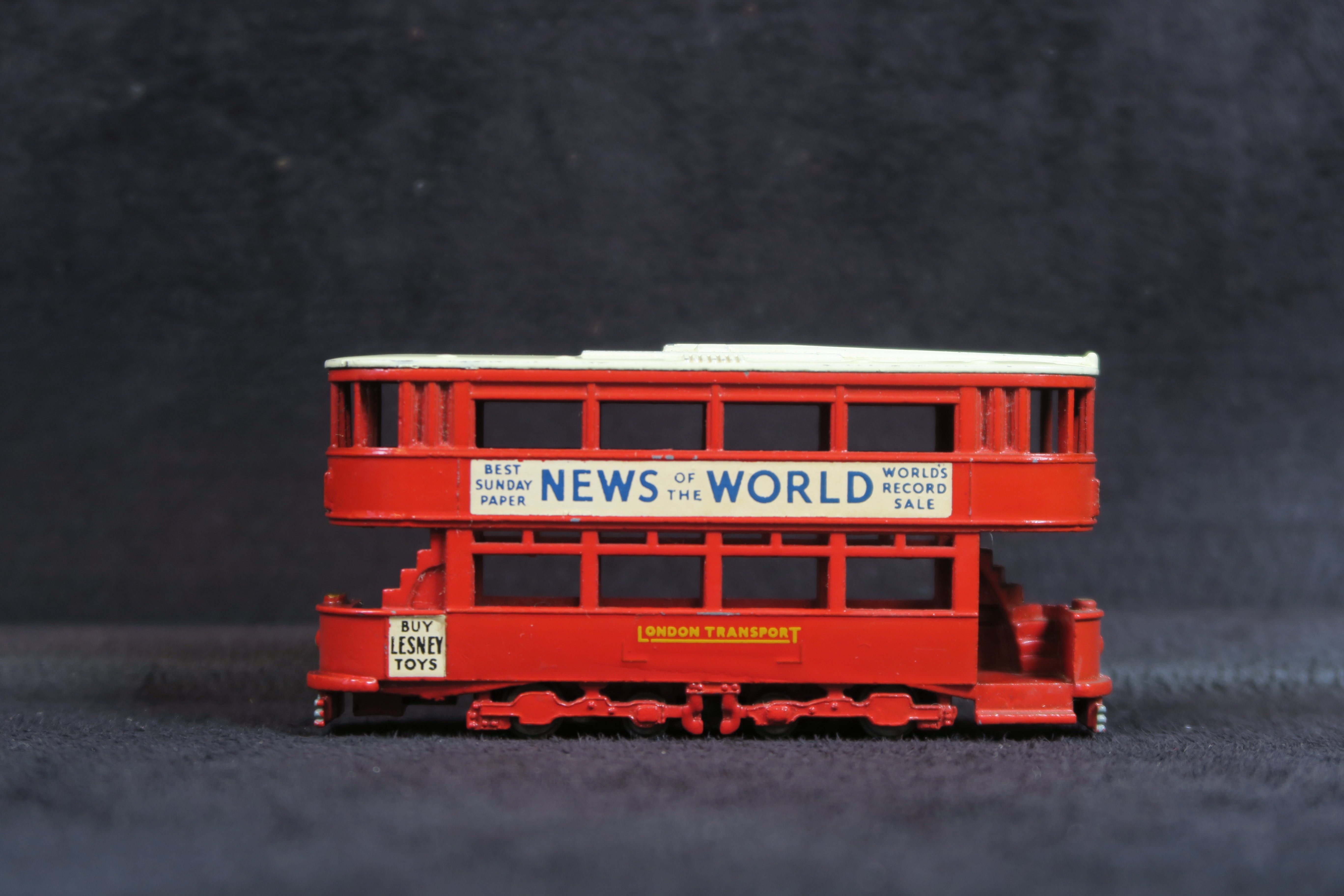 Matchbox Yesteryear No.3 1907 London "E" Class Tram Car in red with a cream roof and 'News of the World' decals to each side.