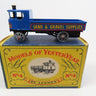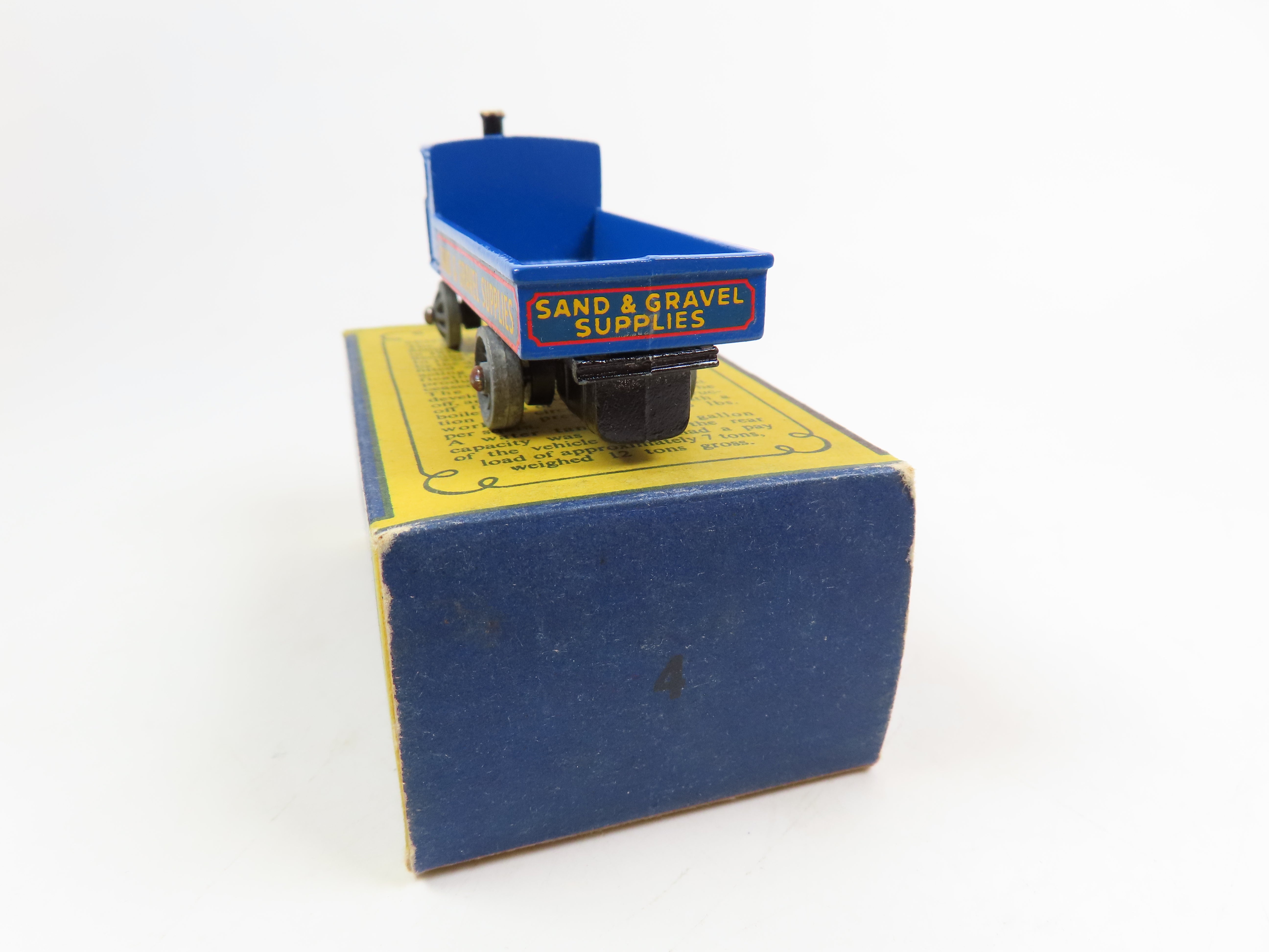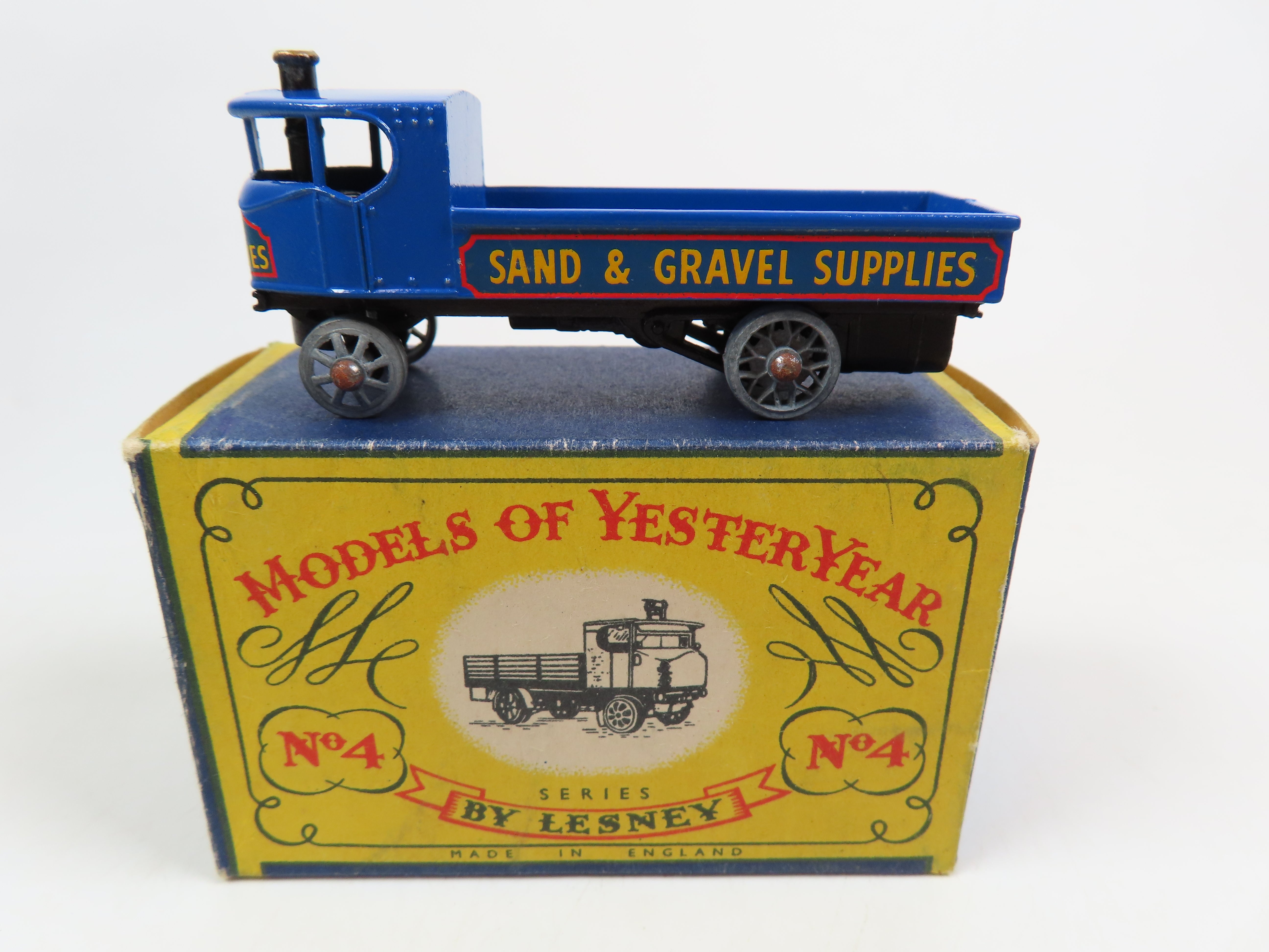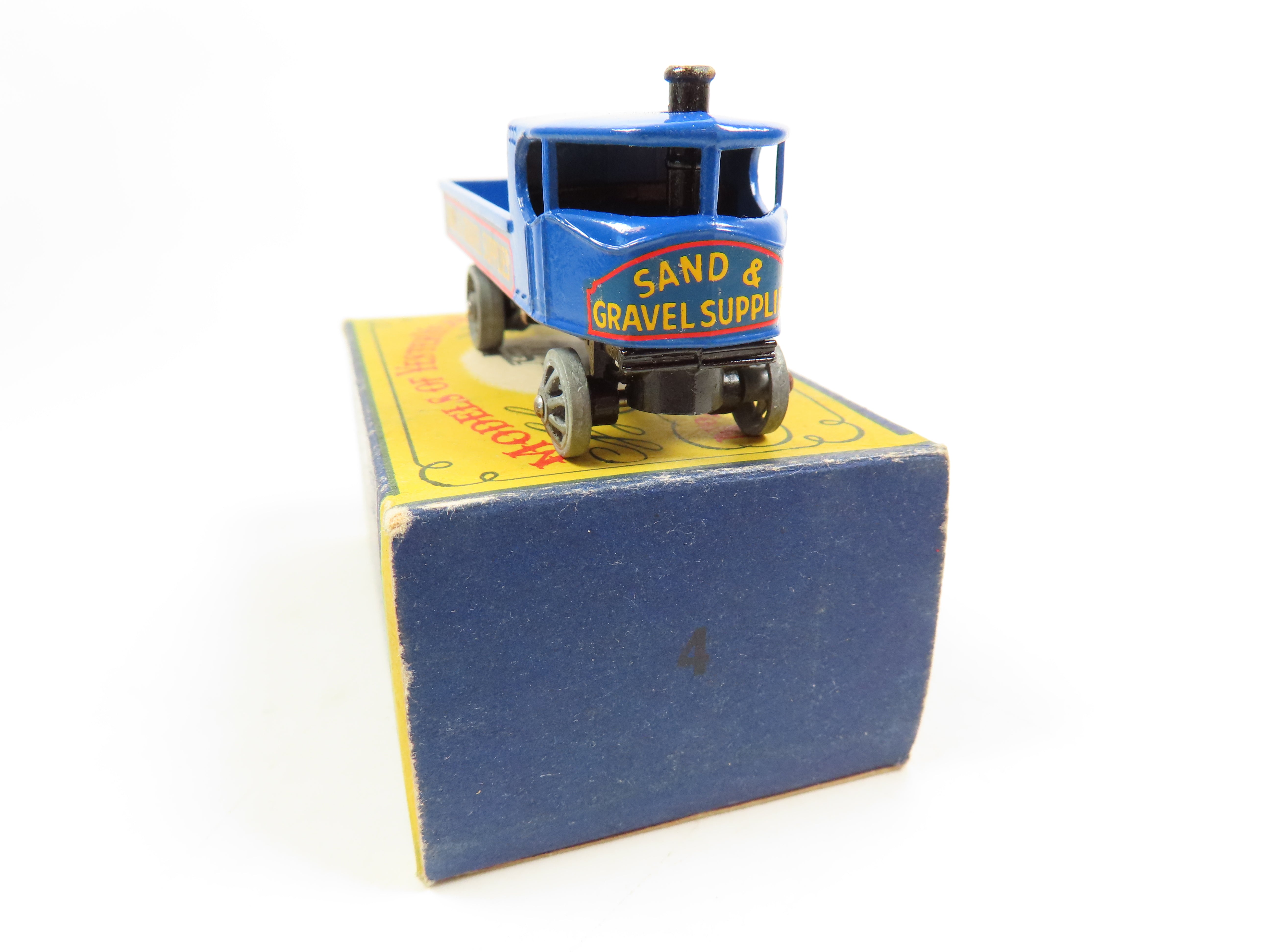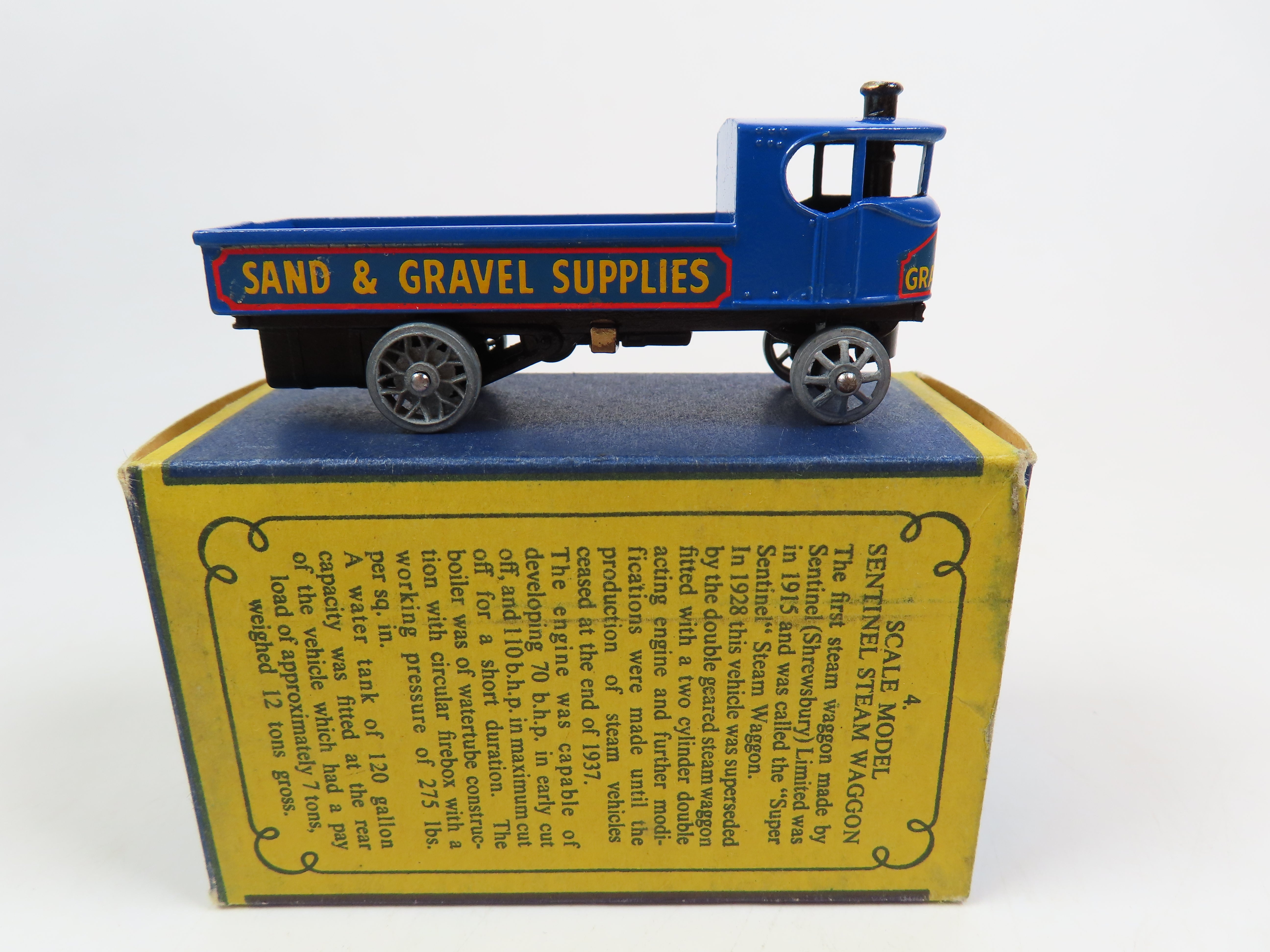 Matchbox Yesteryear No.4 Sentinel Steam Wagon in blue, with 'Sand & Gravel Supplies' decals and grey metal wheels.