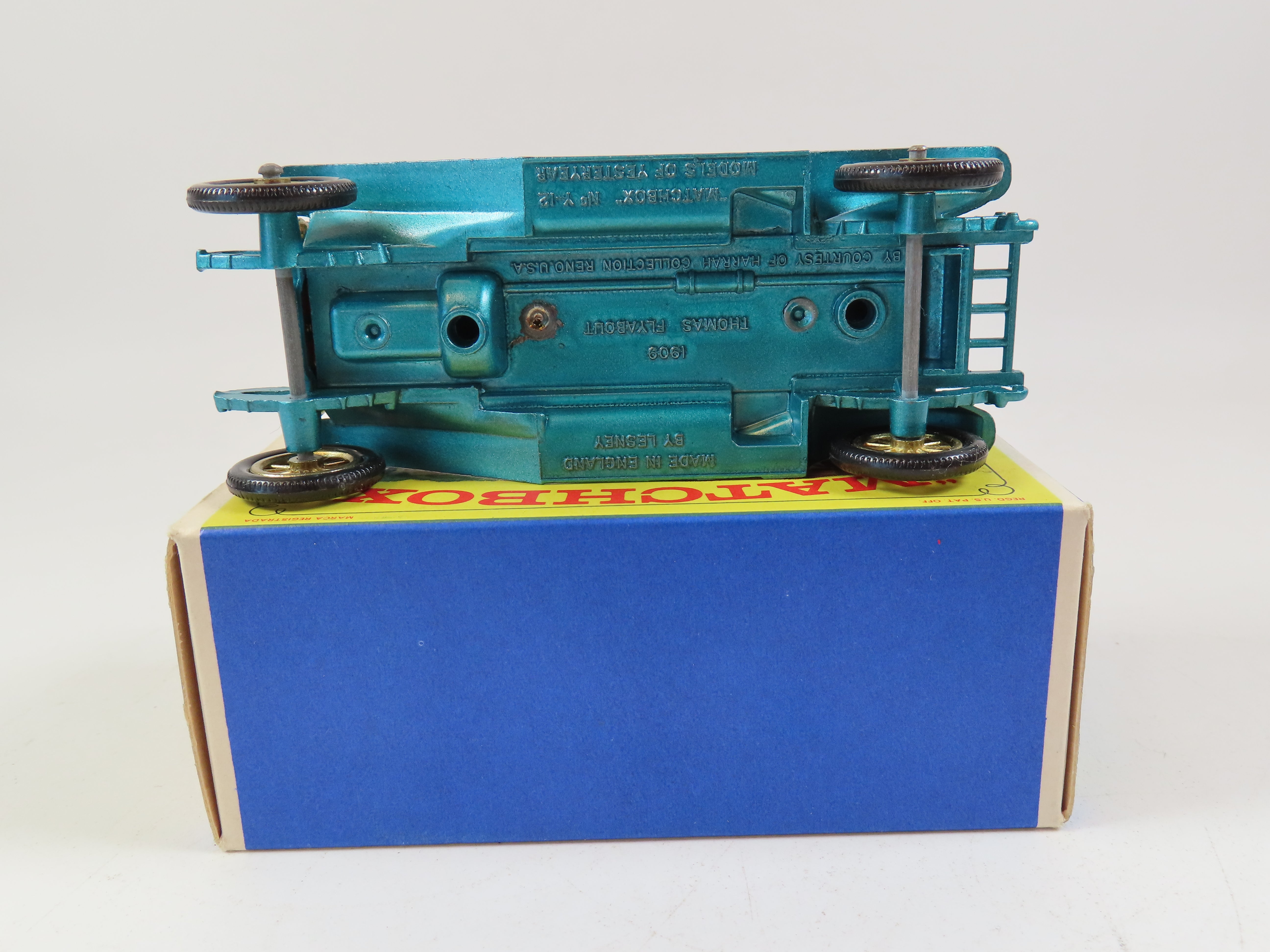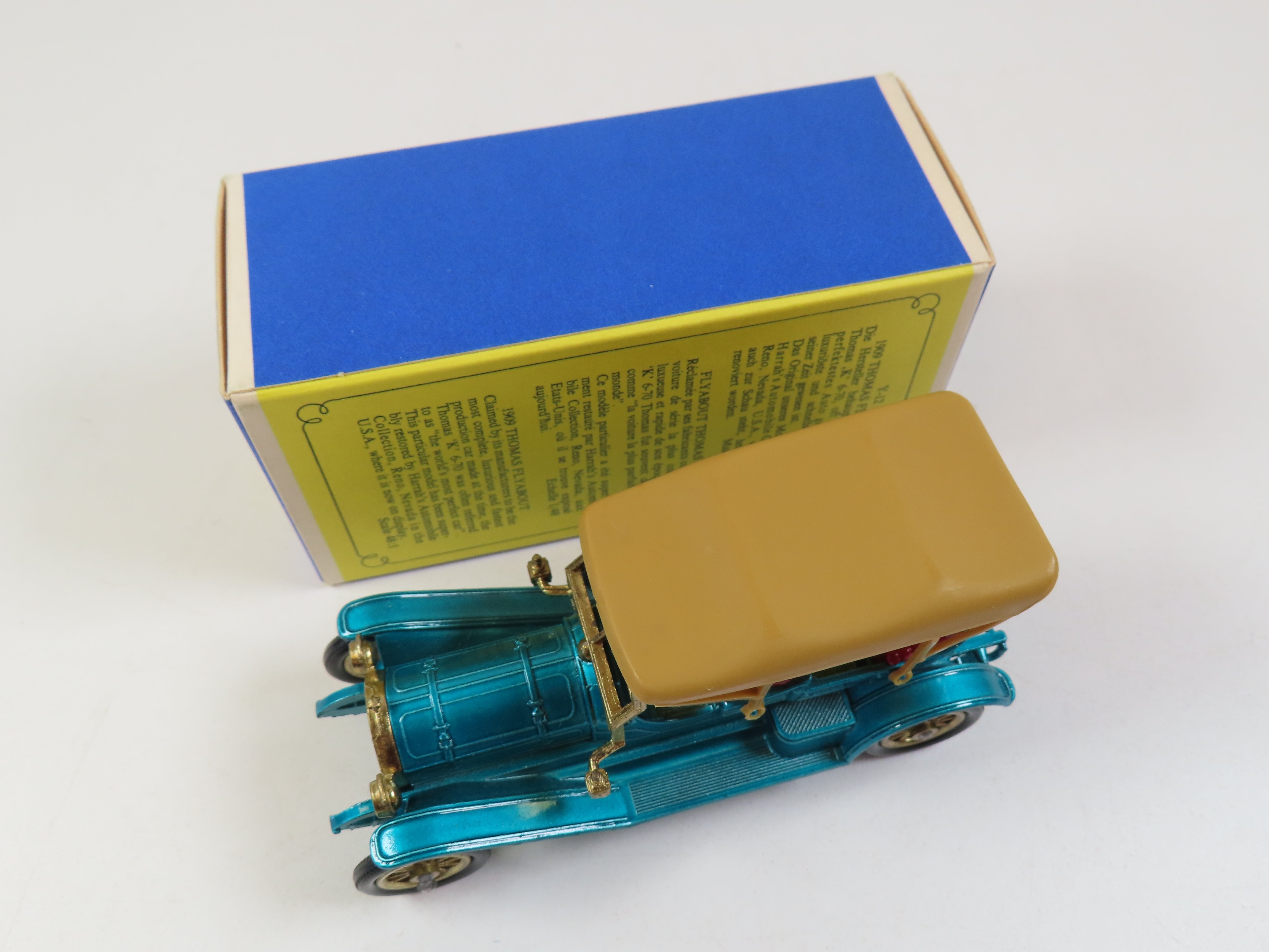Matchbox Yesteryear Y-12 1909 Thomas Flyabout in a lovely metallic blue colour with maroon seats and gold detailing.