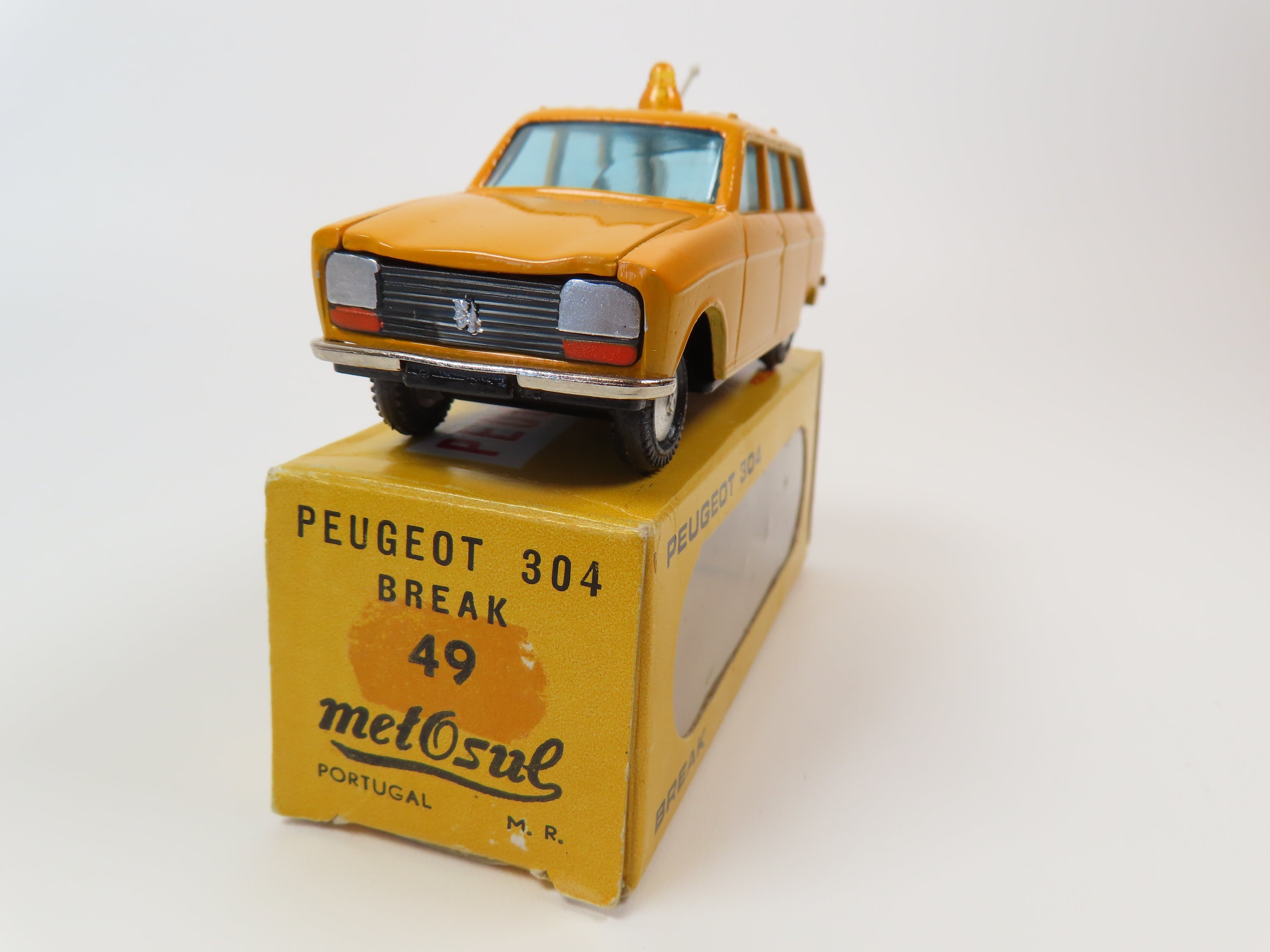 Metosul 49 Peugeot 304 Break in dark yellow, with dome light to the roof and plastic aerial to the rear.