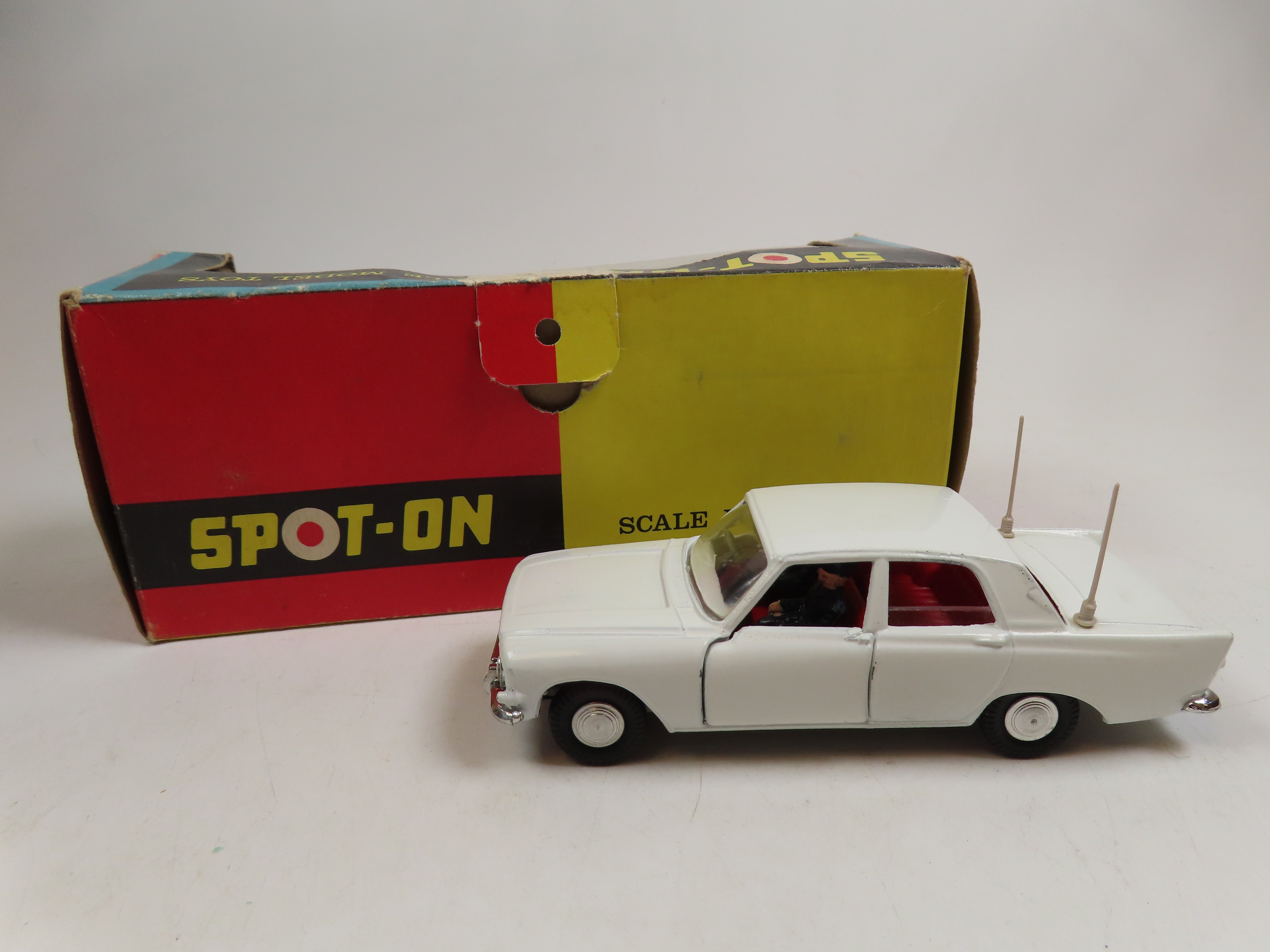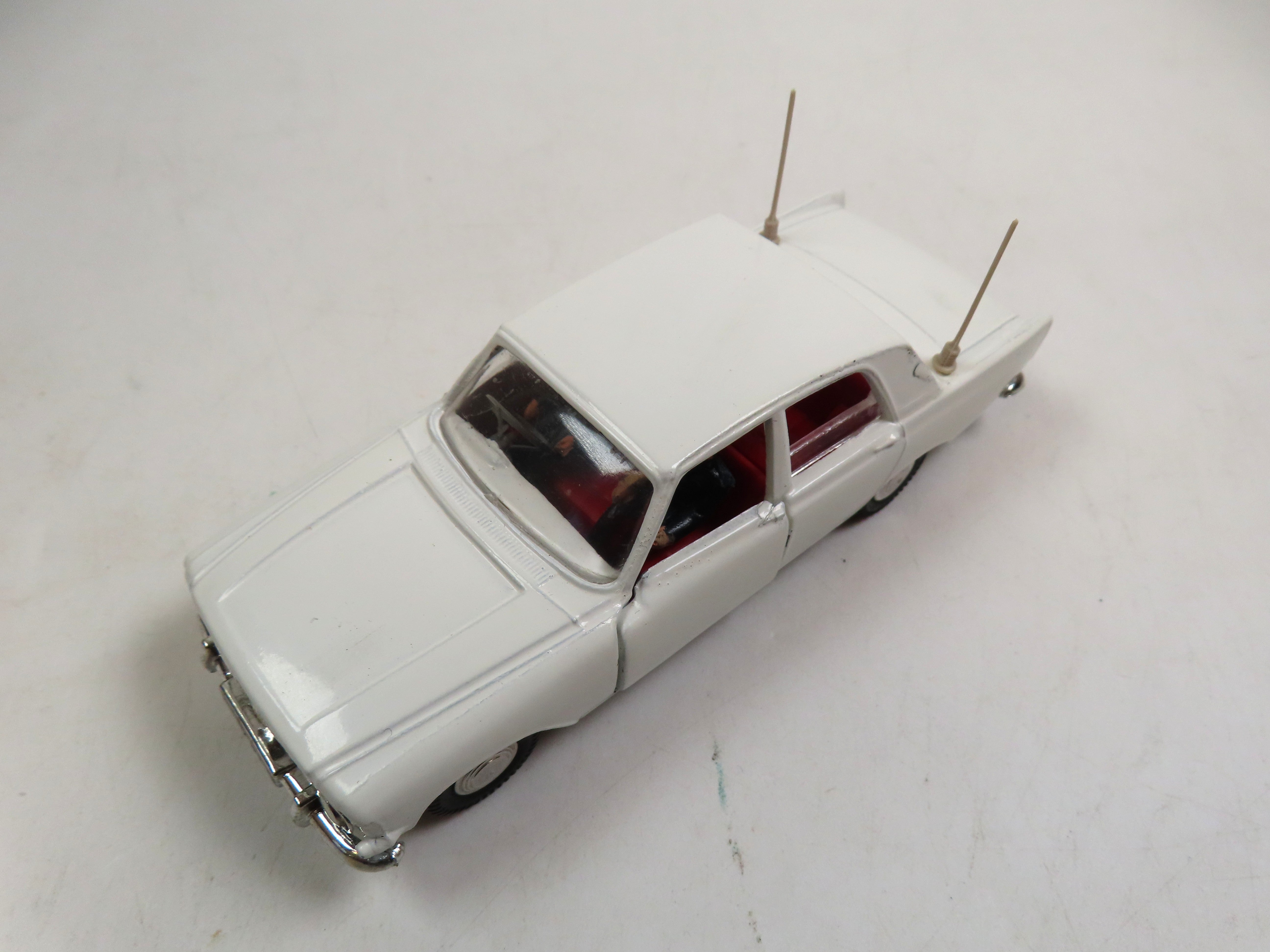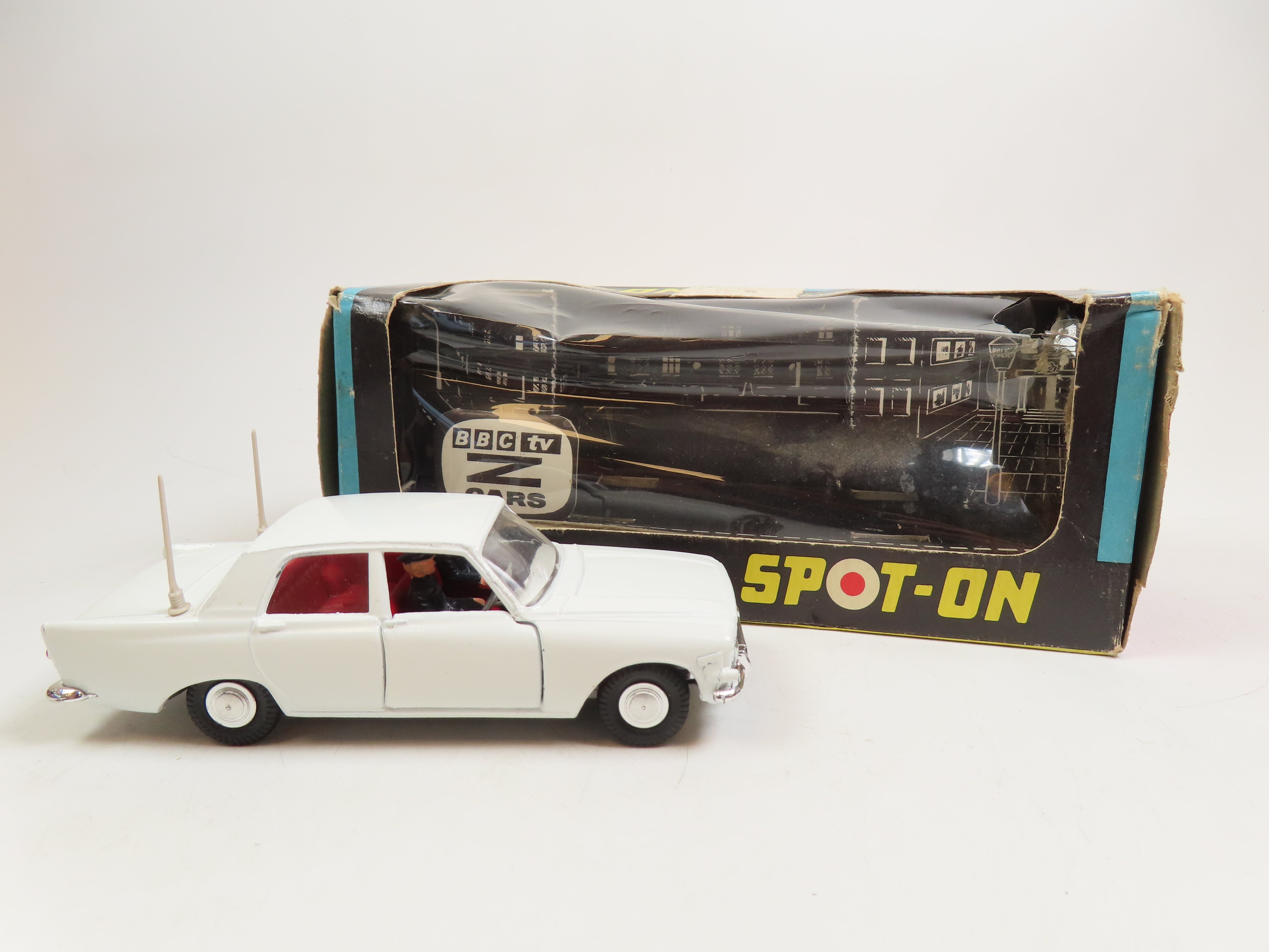 Spot-On No.309 'BBC TV Z Car' Ford Zephyr Six in white with red interior and 2 figures to the front.