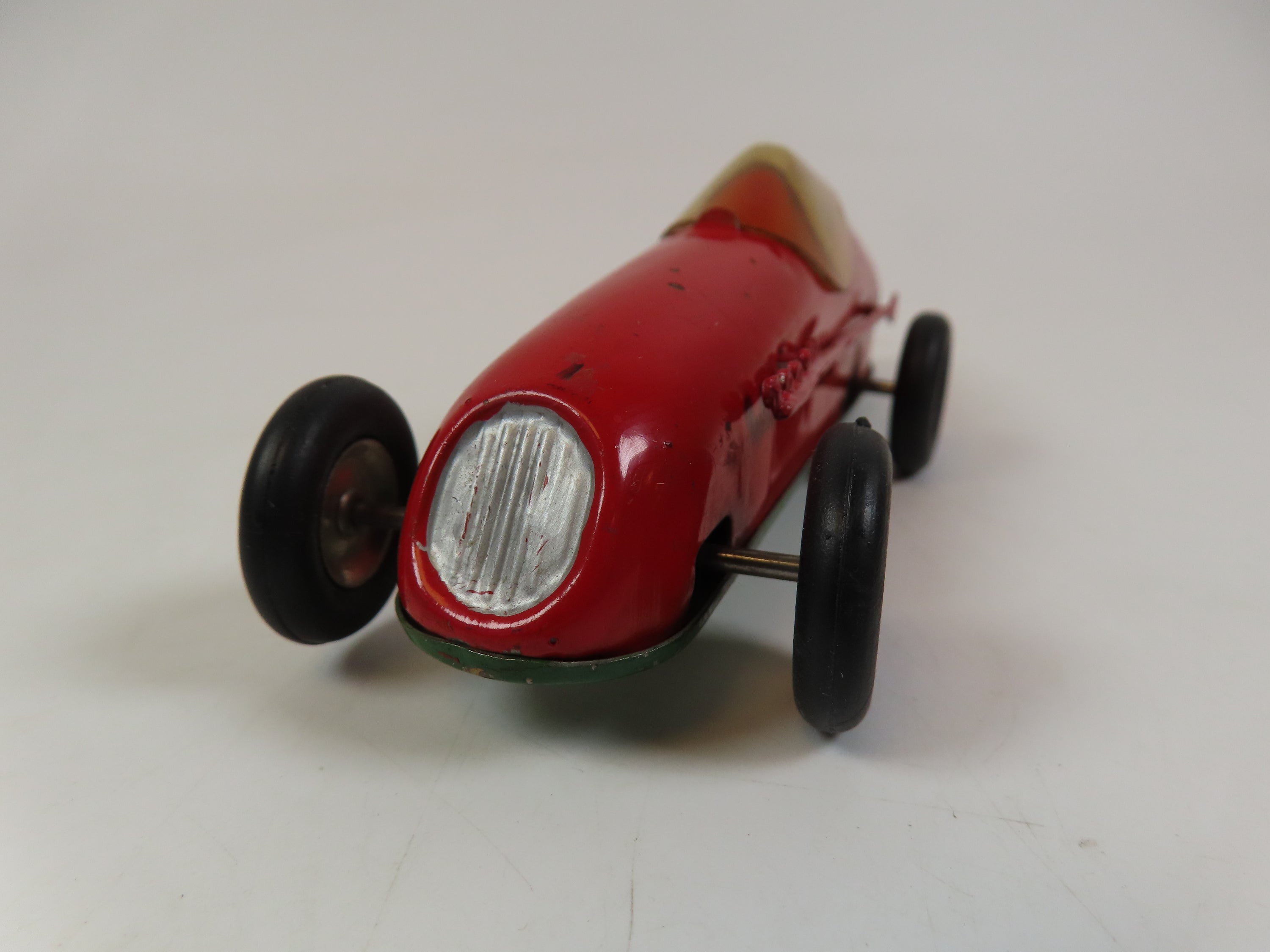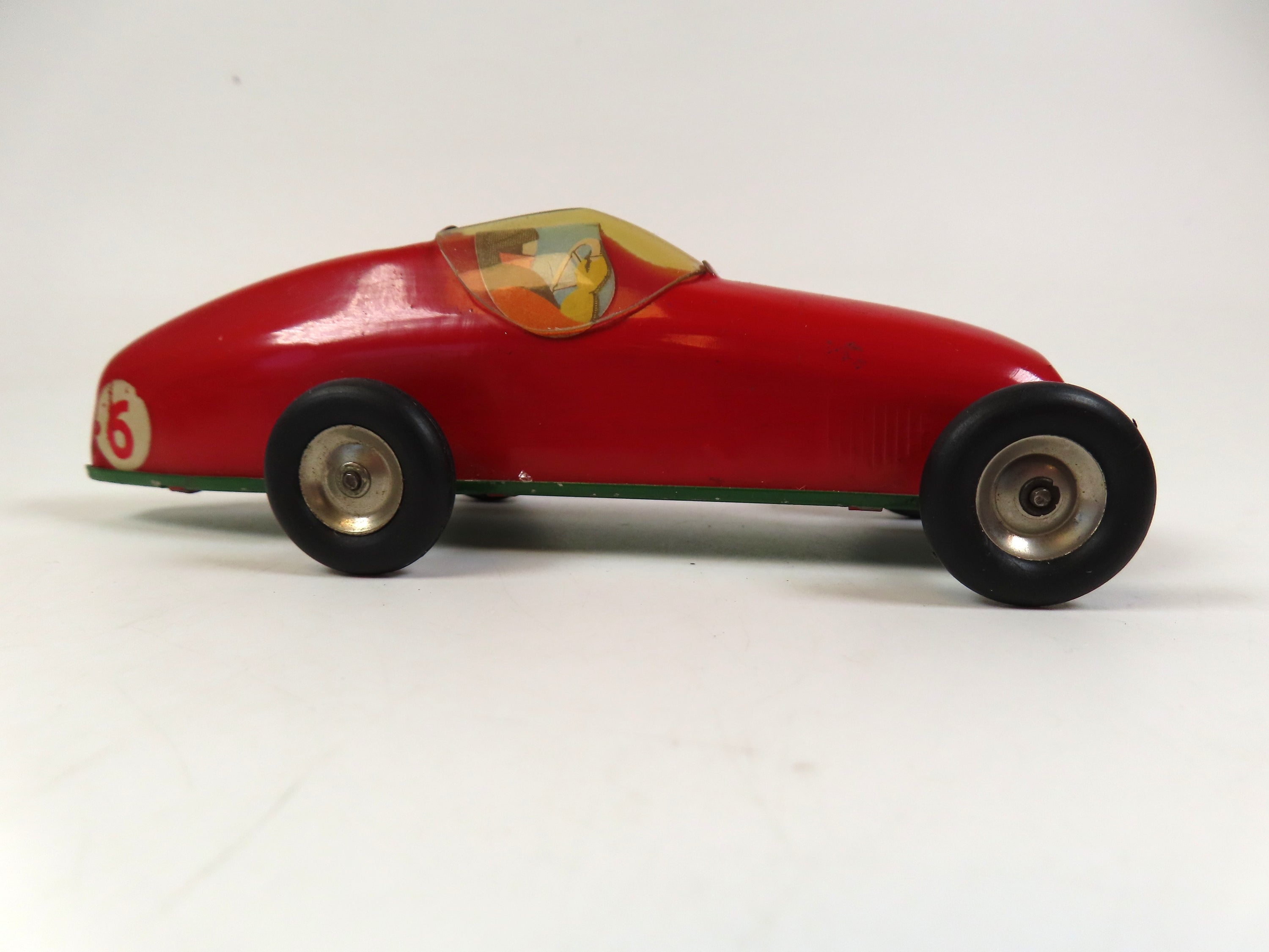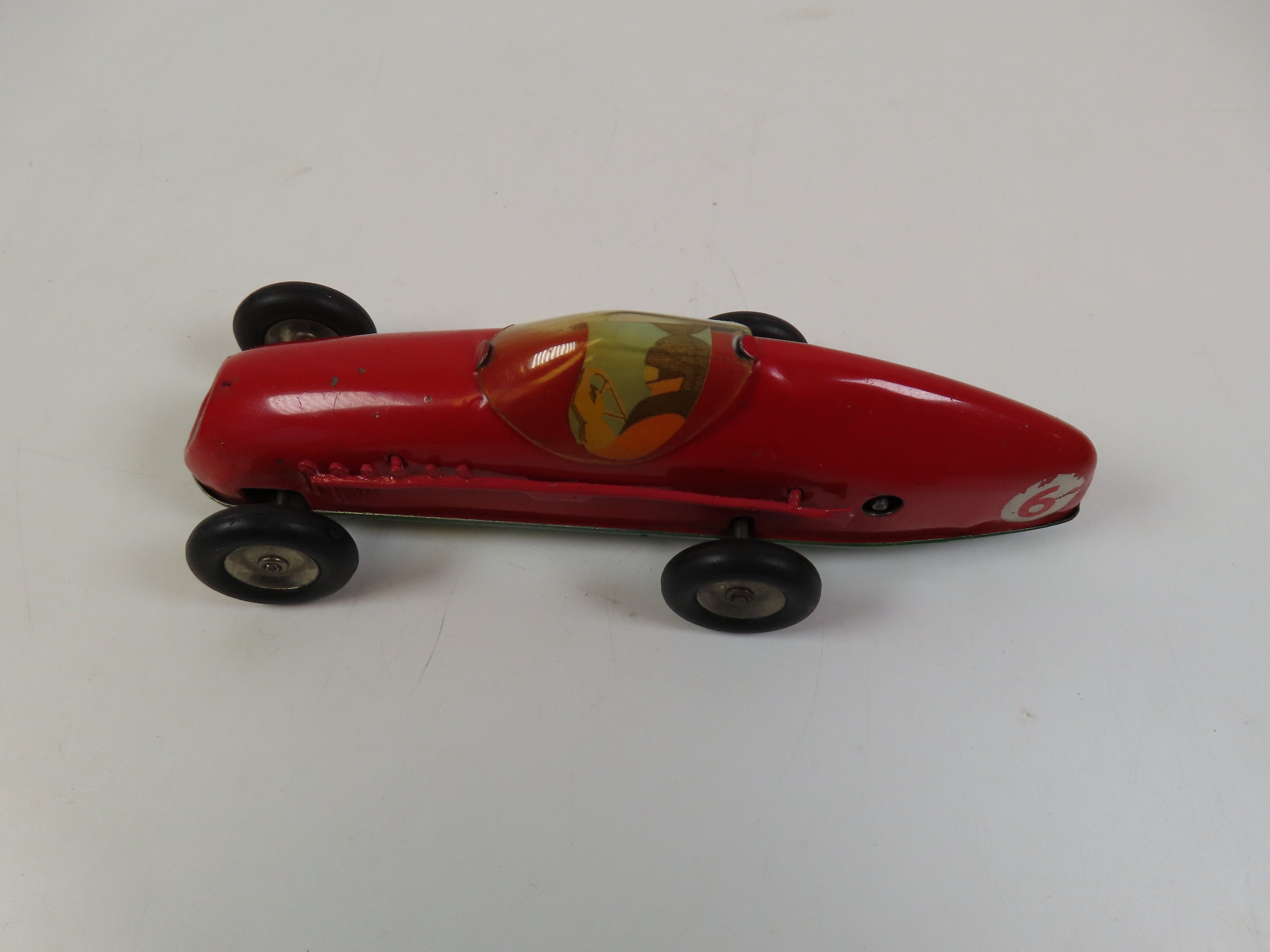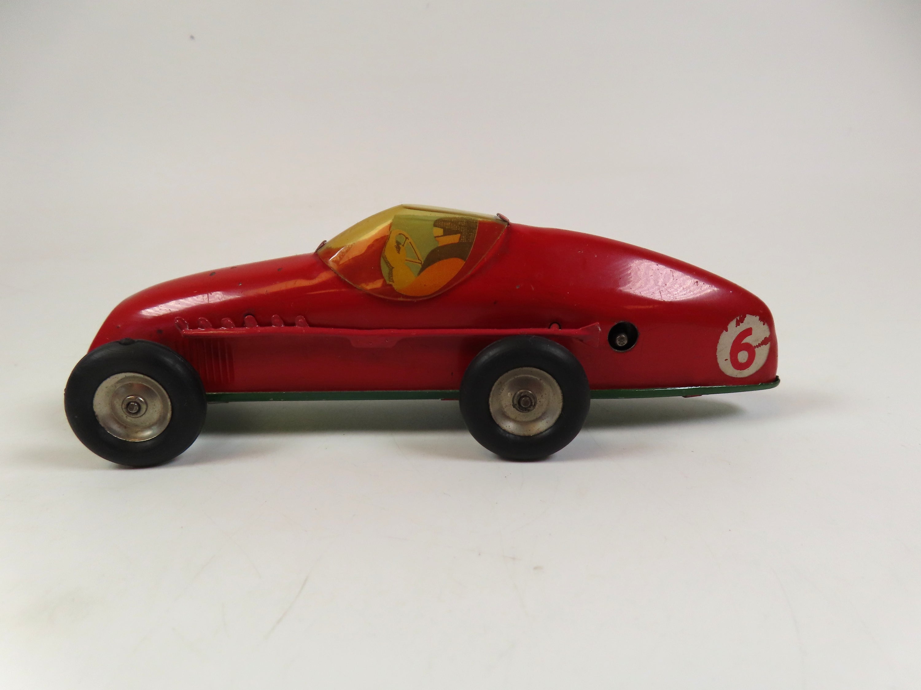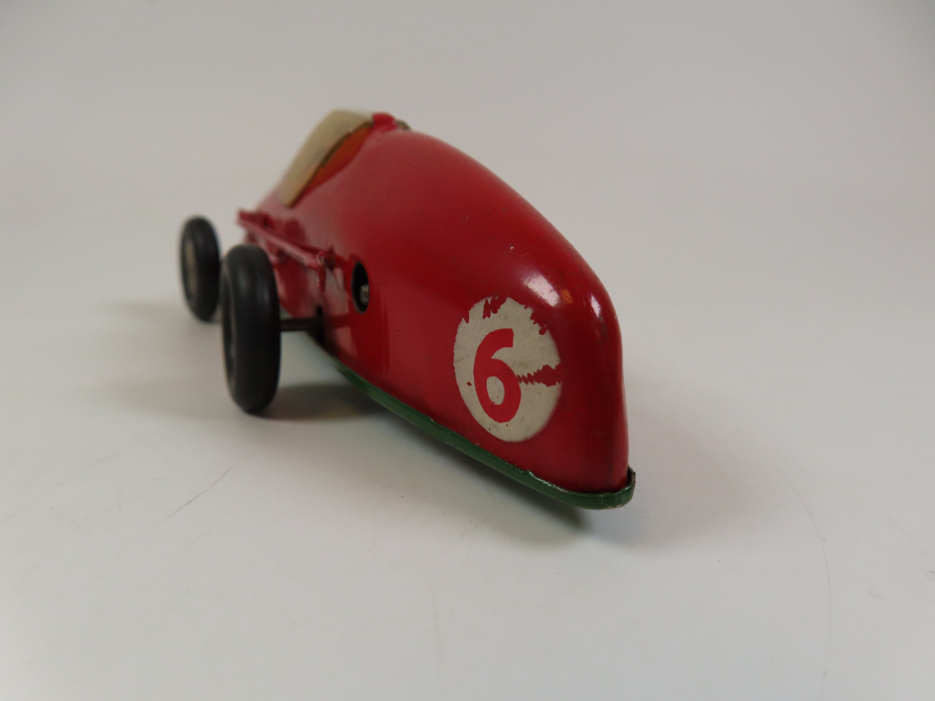 Tri-ang Minic tinplate Racing Car in red with green base and '6' decals to the sides. In good working order.